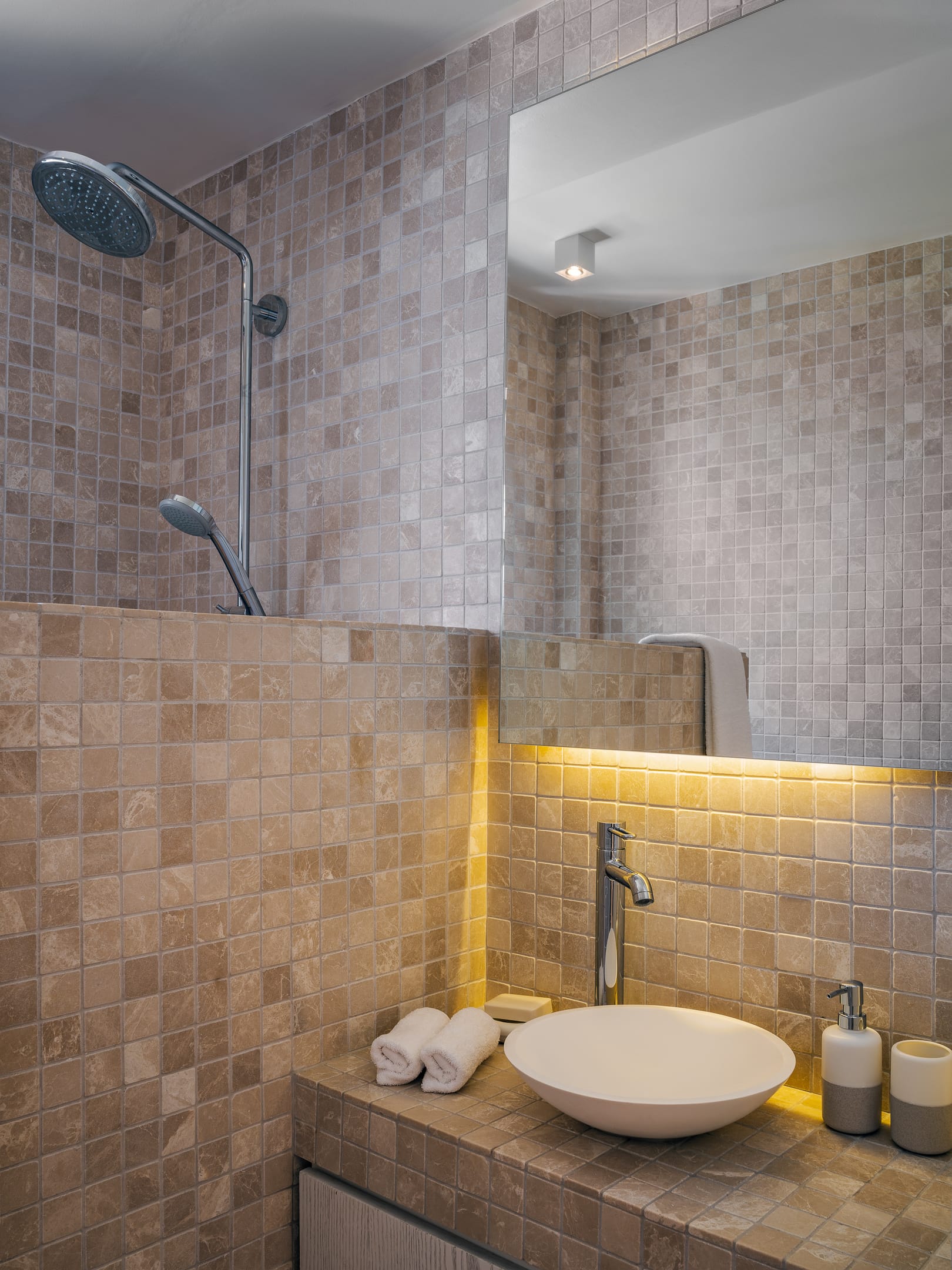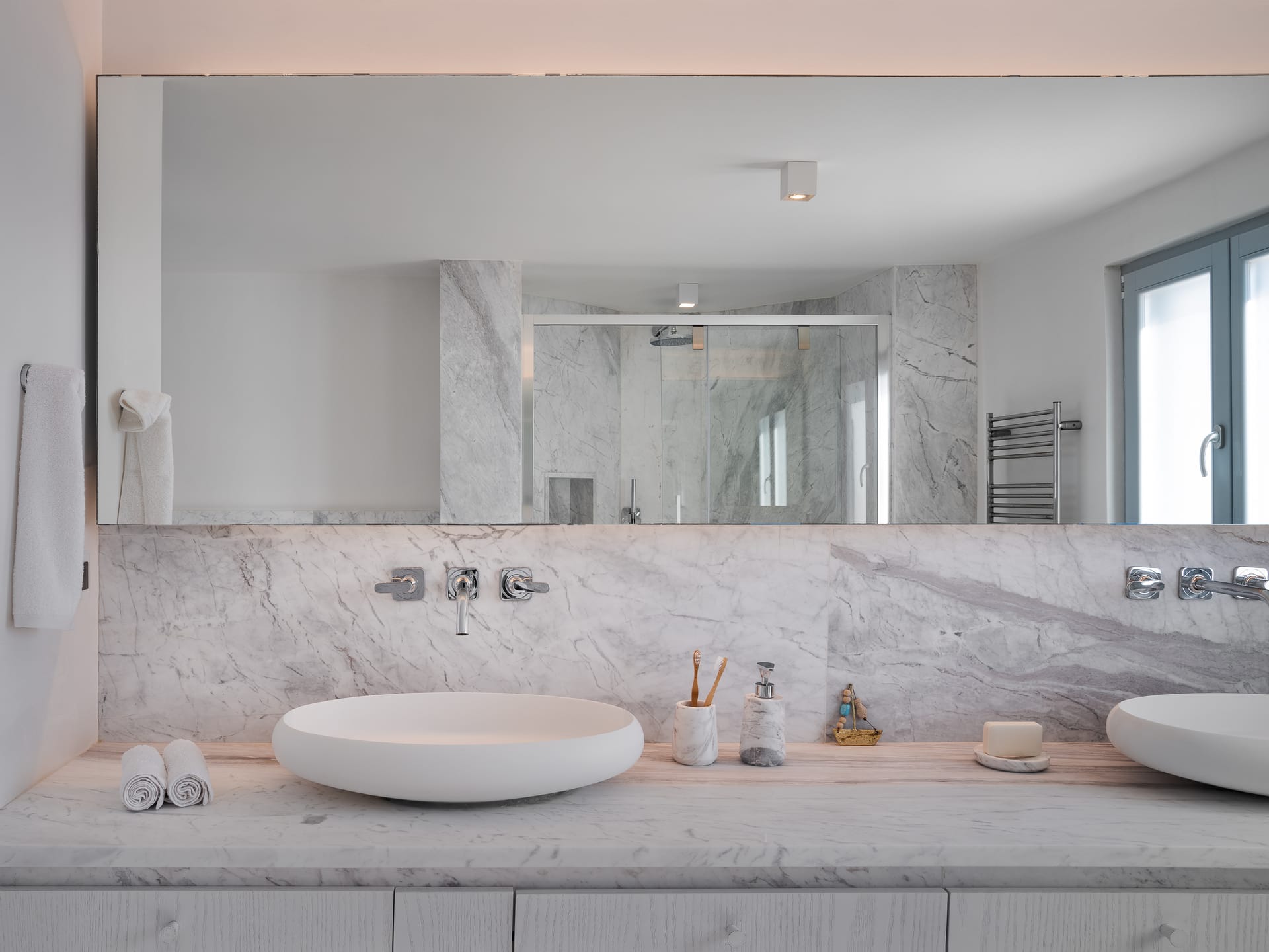 Indulge in a serene, spa-like retreat featuring sleek marble finishes that exude elegance and sophistication. The spacious bathrooms include dual vessel sinks, an expansive vanity area, and contemporary fixtures that combine luxury with practicality. Sunlight filters through the window, illuminating the exquisite marble textures and creating a soothing atmosphere. Plush towels, handcrafted toiletries, and chic accessories elevate the experience, delivering the perfect balance of comfort and indulgence.
