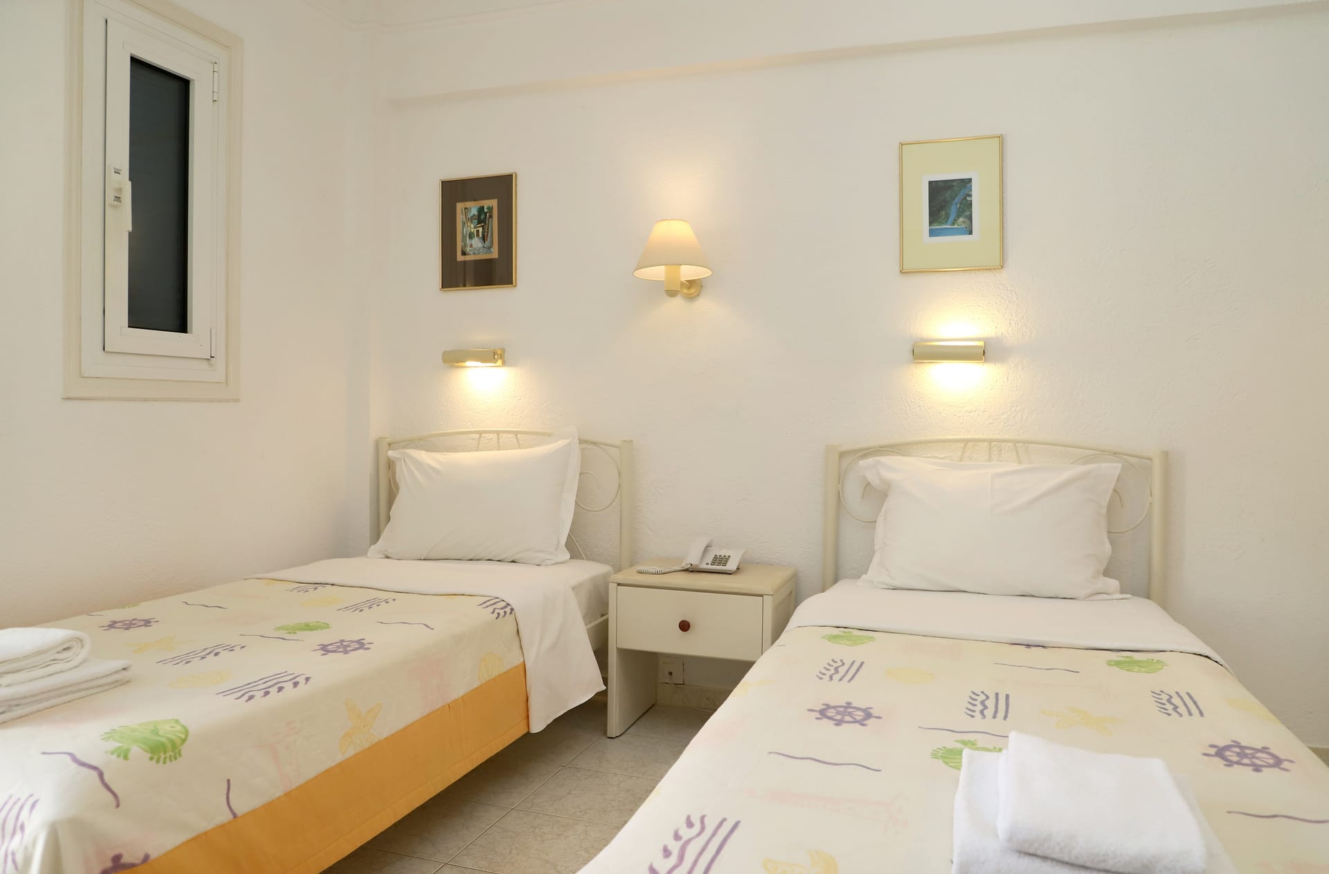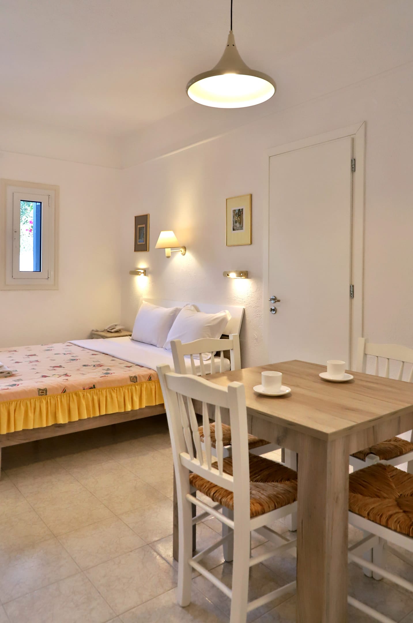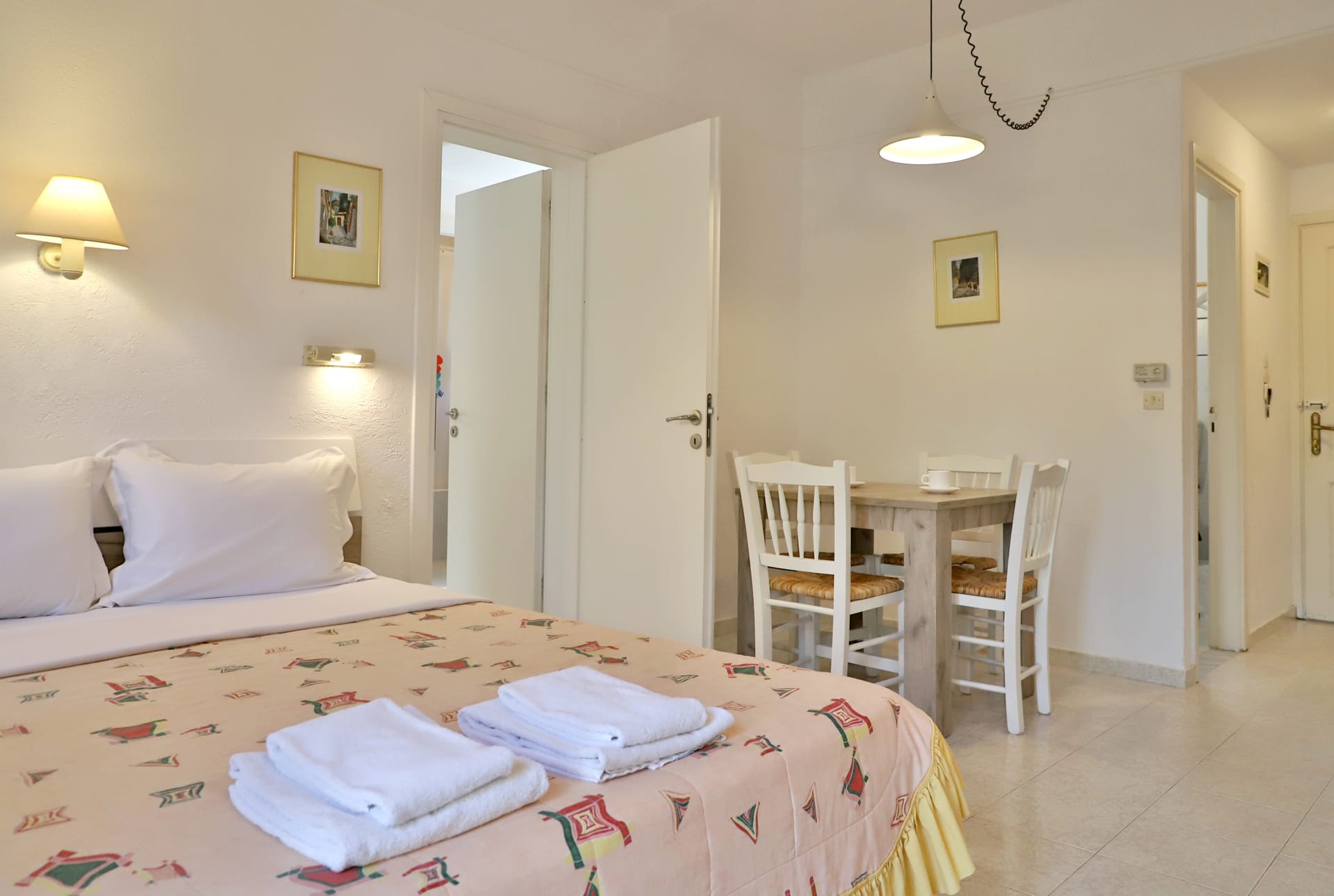 45 sqm, can accommodate up to 6 persons, Olive Grove connected studios with a double bed and two twin beds, 2 bathrooms, and 2 kitchenettes. More room for 4 adults or families with older children. Facilities: Balcony or Terrace, , Double bed and twin beds , Bathtub , A/C (free of charge), T.V, fridge (free of charge),Kitchenette, telephone (local charge), safe box (local charge).