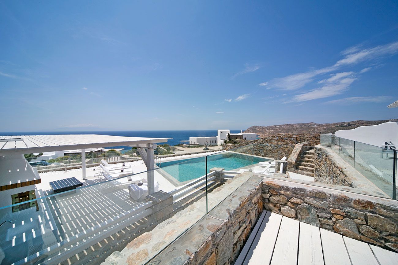 The luxury villa has been spread out across two distinct levels with large and strategically laid out living areas and bedrooms. You can also spend a relaxing afternoon lounging by the outdoor swimming pool area or under the exquisite pergola while relishing the breathtaking panorama of the Aegean Sea. The other outdoor facilities include a shaded playground for children, stylish pool beds and loungers, outdoor dining/sitting area, a fully functional barbeque area, private parking space and a private balcony.
