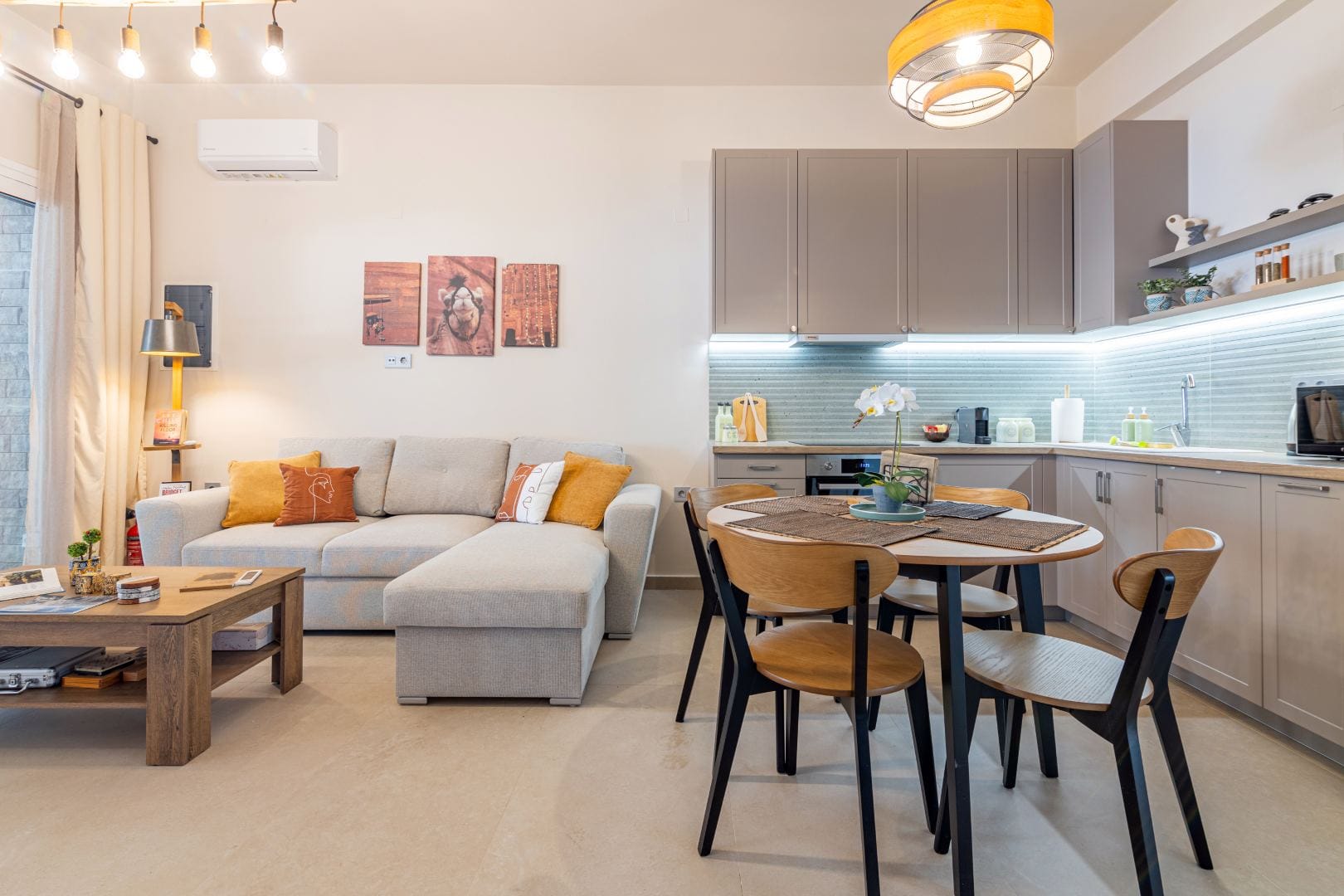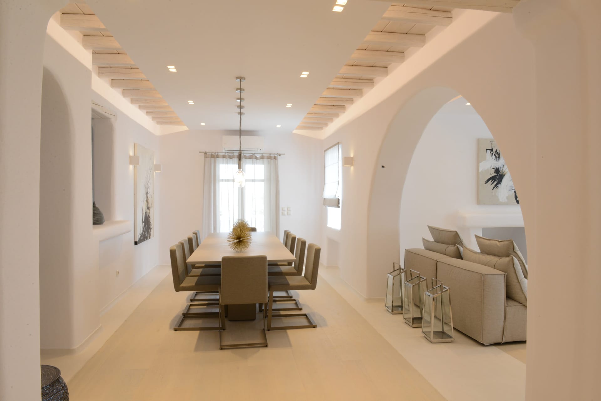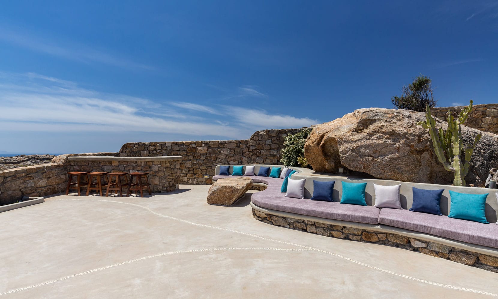 Recently renovated in the year 2014, the architecture of the Chora Villa draws its inspiration from the traditional Mykonian style and showcases the rich cultural heritage with its towering wooden beam ceilings and wide rocky walls. The villa has now been fitted with new technology double glazing soundproof windows that provide effective noise insulation from the bustling city atmosphere to keep the interiors quiet and calm.