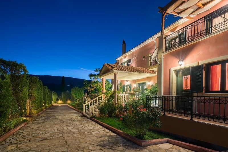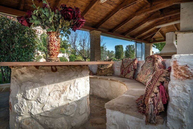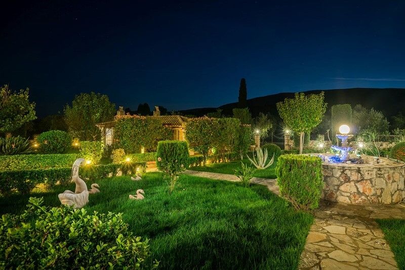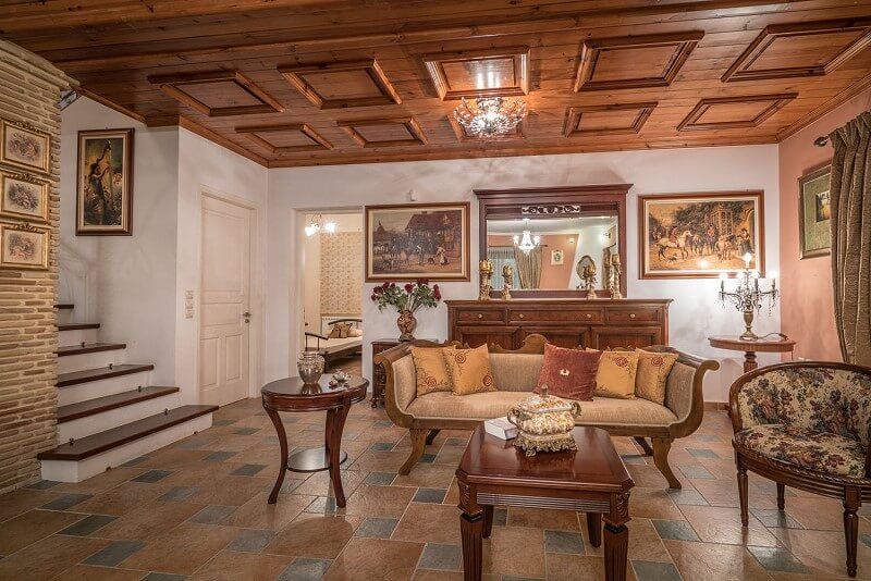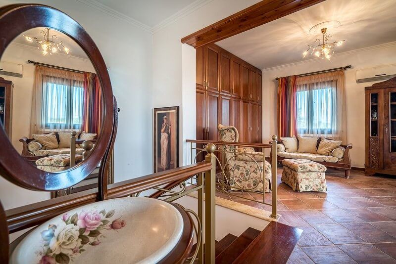 Ascend to the first floor, where you will encounter one more living room and dining room both opening to a shaded furnished balcony and ample view towards the garden and swimming pool. The master bedroom with double bed and double sofa bed as well as fireplace and bathroom with Jacuzzi bathtub along with two more bedrooms both with double beds and a bathroom with bathtub can be found here.