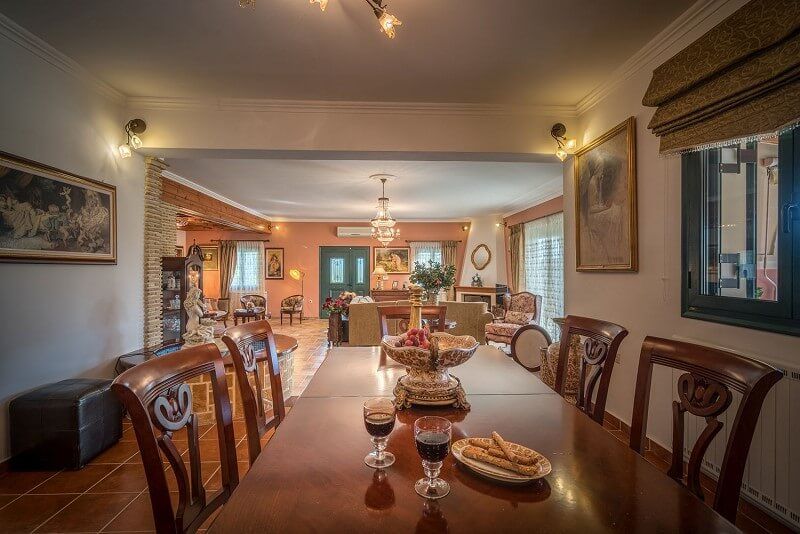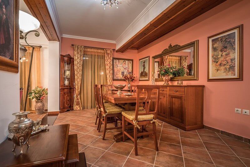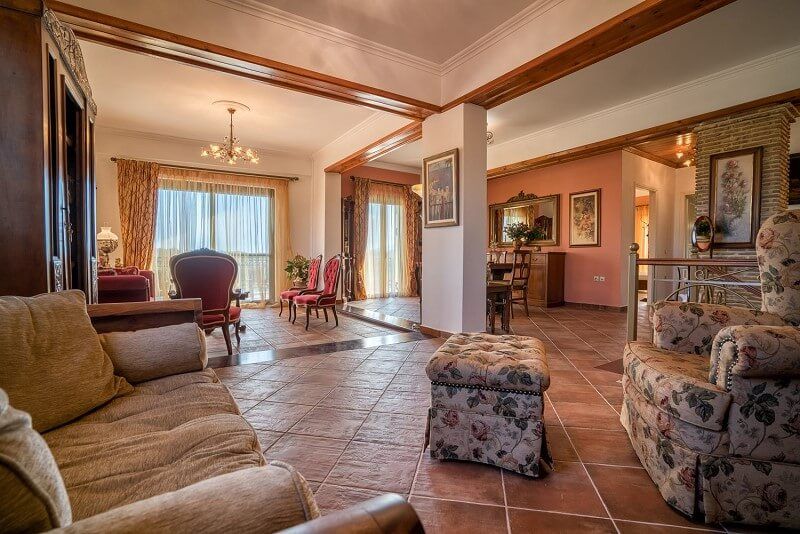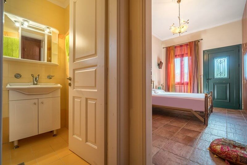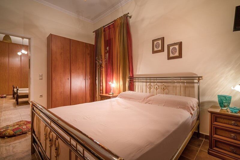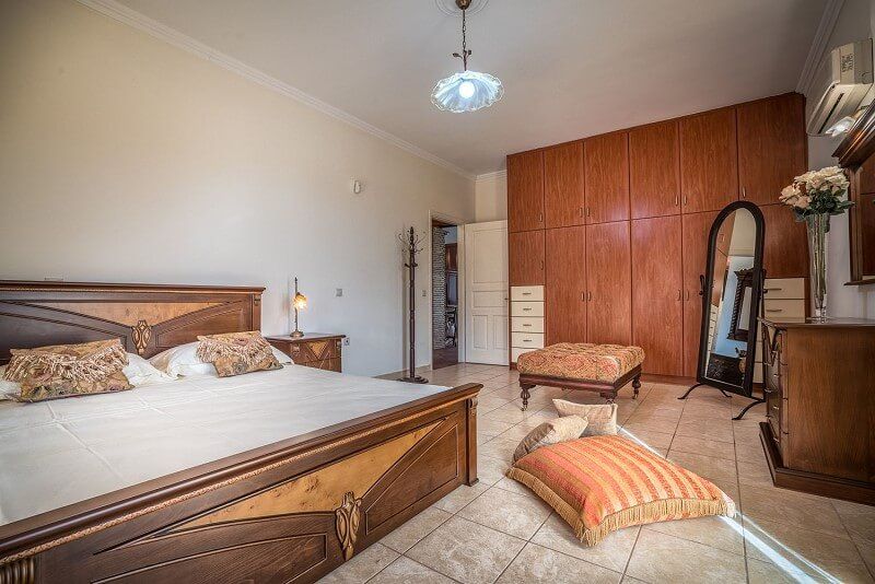 At the ground floor, there are 3 bedrooms, one with double bed, separate entrance and bathroom with shower right next to it. Two more interconnected bedrooms one with double bed and one with two singles can be isolated from the rest rooms through a door. Also at the ground floor there is the main living room and dining room as well as the fully equipped spacious kitchen and a bathroom with Jacuzzi bathtub.