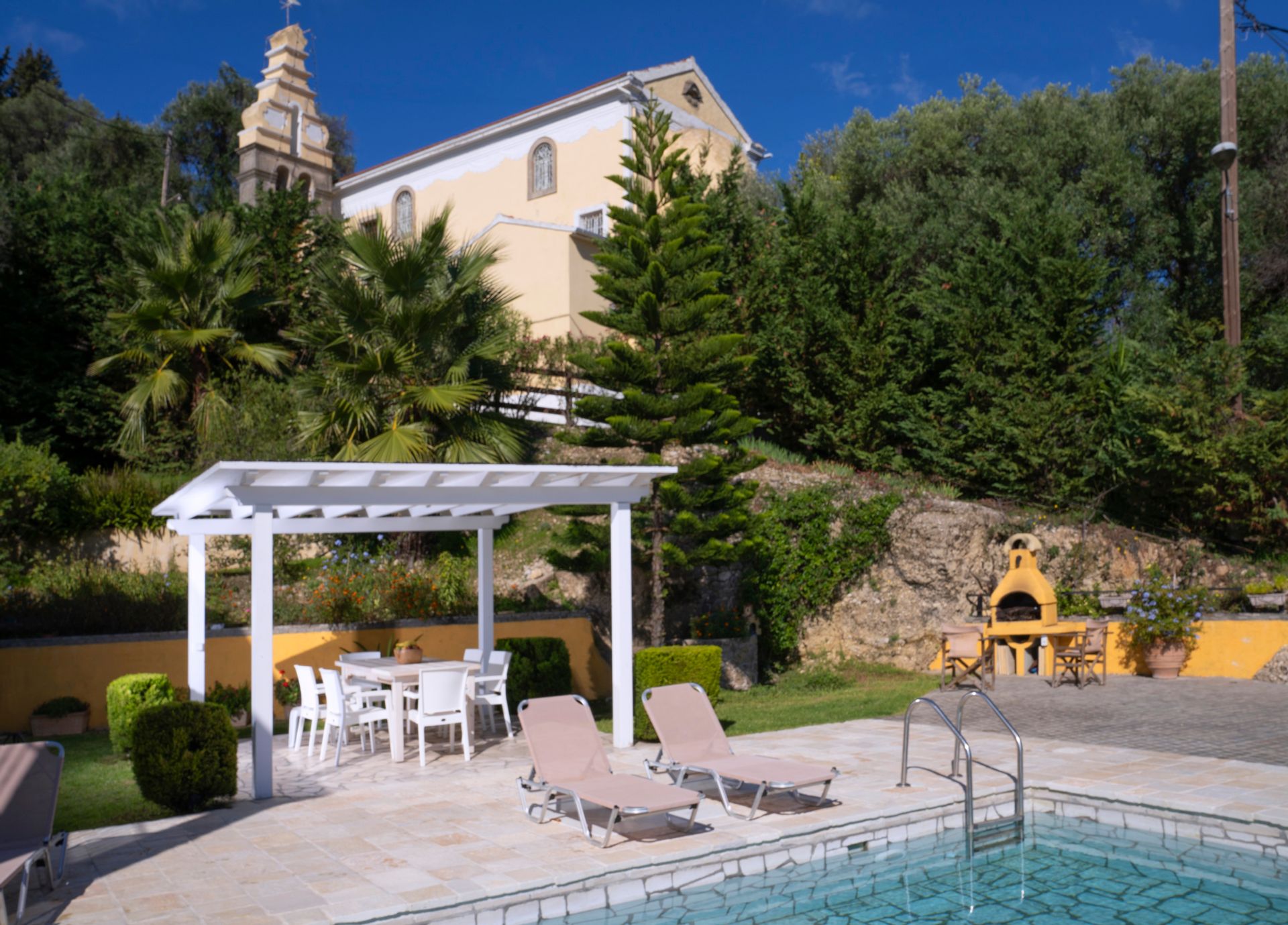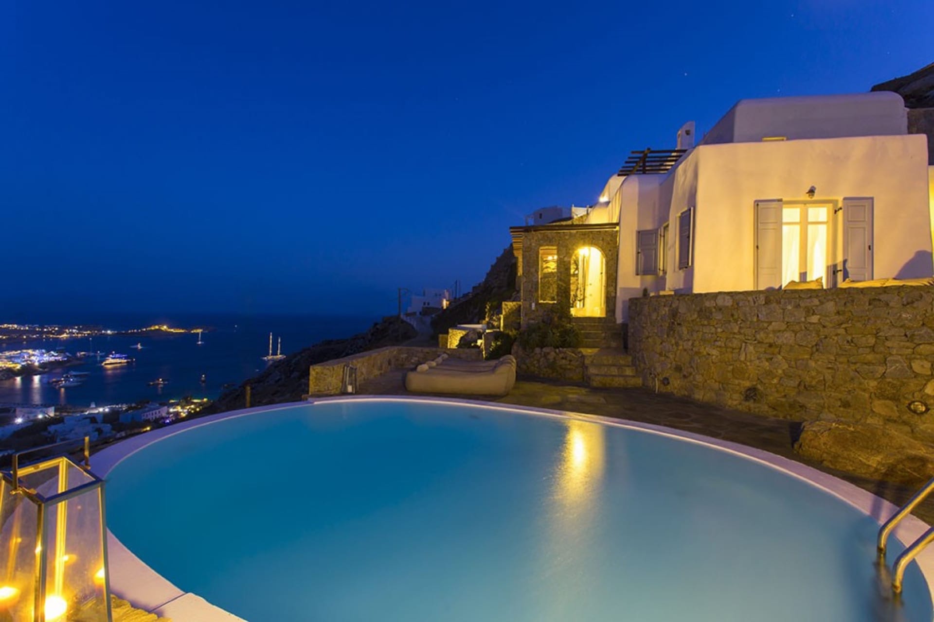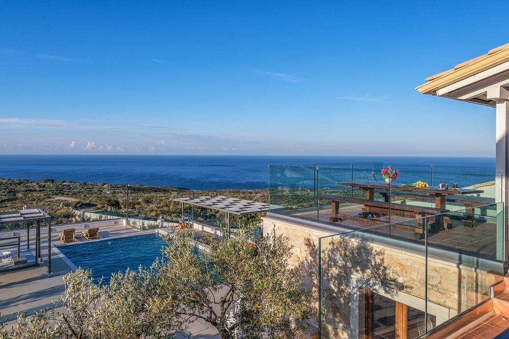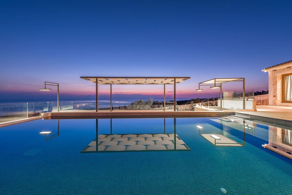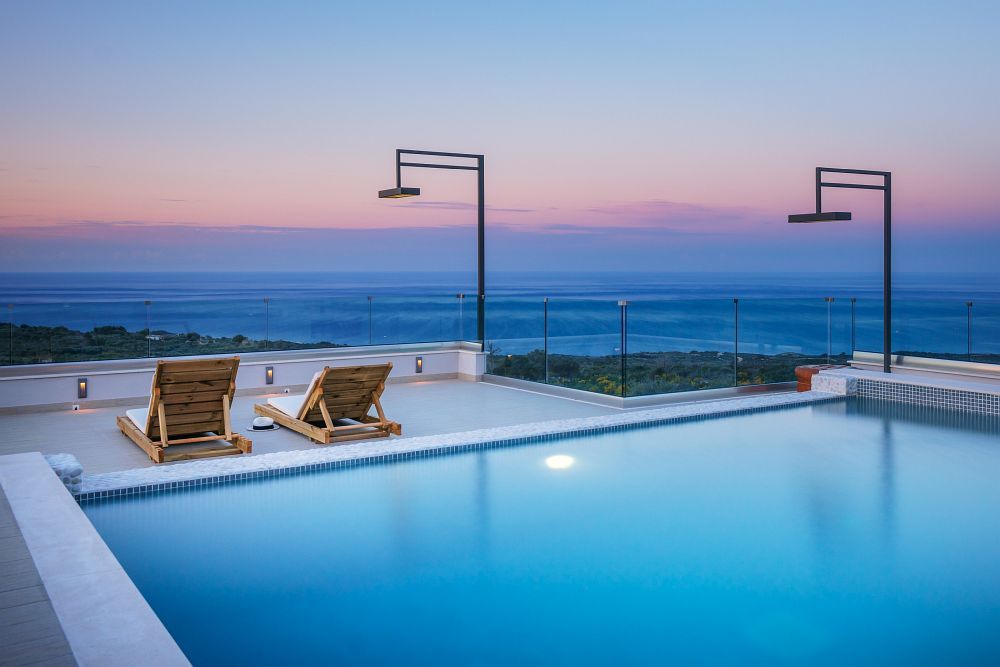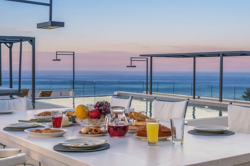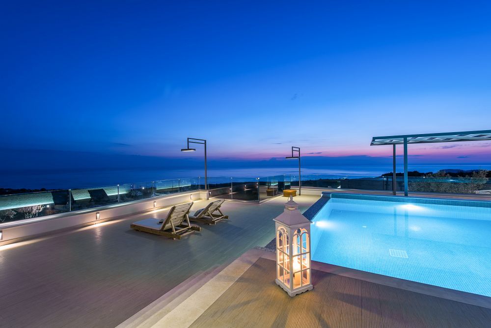 The surrounding area of this villa is as impressive as the internal; as the big heated private pool blends with the blue sky and sea, whereas the fully equipped bar and BBQ facilities complete a faultless picture.