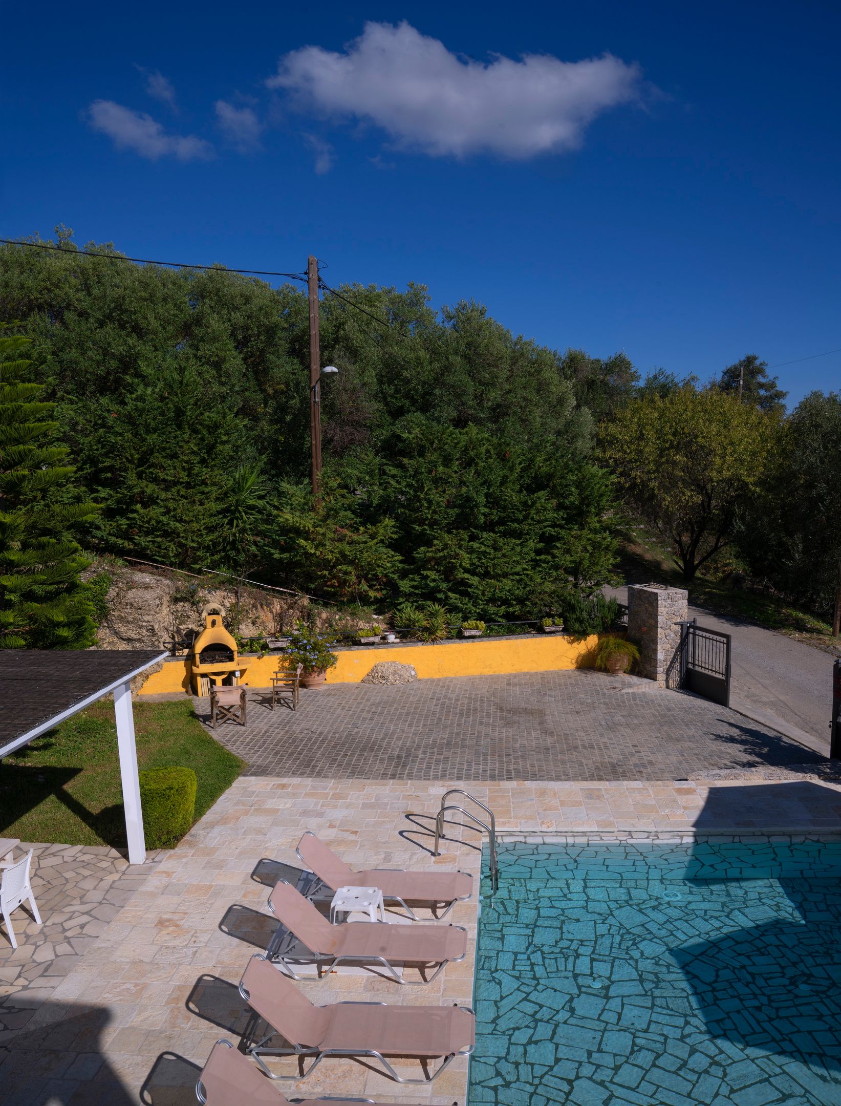 Additionally, a separate guestroom with an antique double bed, bathroom with shower and kitchenette is located below the pool area and can be used by two additional guests.