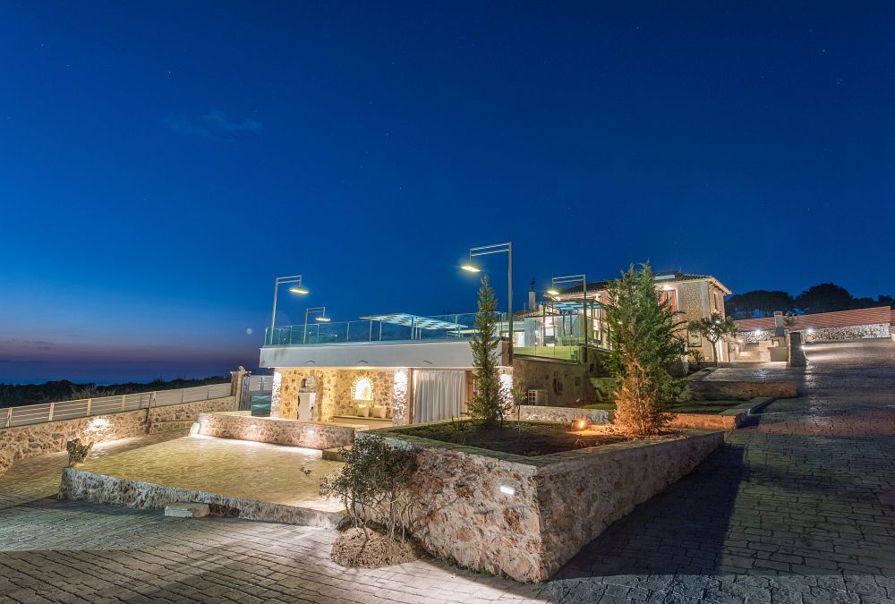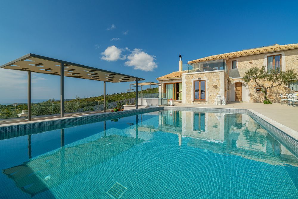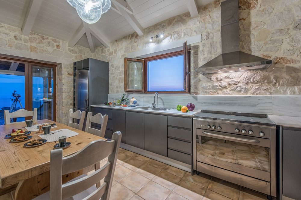 A few stairs towards the top level of the villa lead to a big, modern kitchen fully equipped with contemporary appliances and a secondary dining area where you can enjoy your breakfast or light lunch. This room opens to a big furnished veranda featuring panoramic views over the Ionian Blue Sea. The master suite is found on this level offering a queen sized bed and en-suite bathroom with Jacuzzi bathtub.