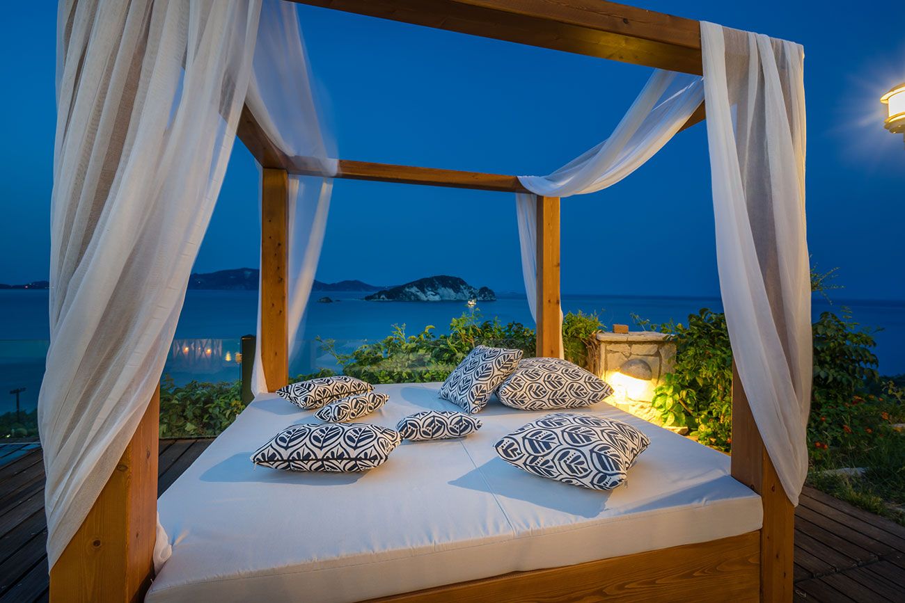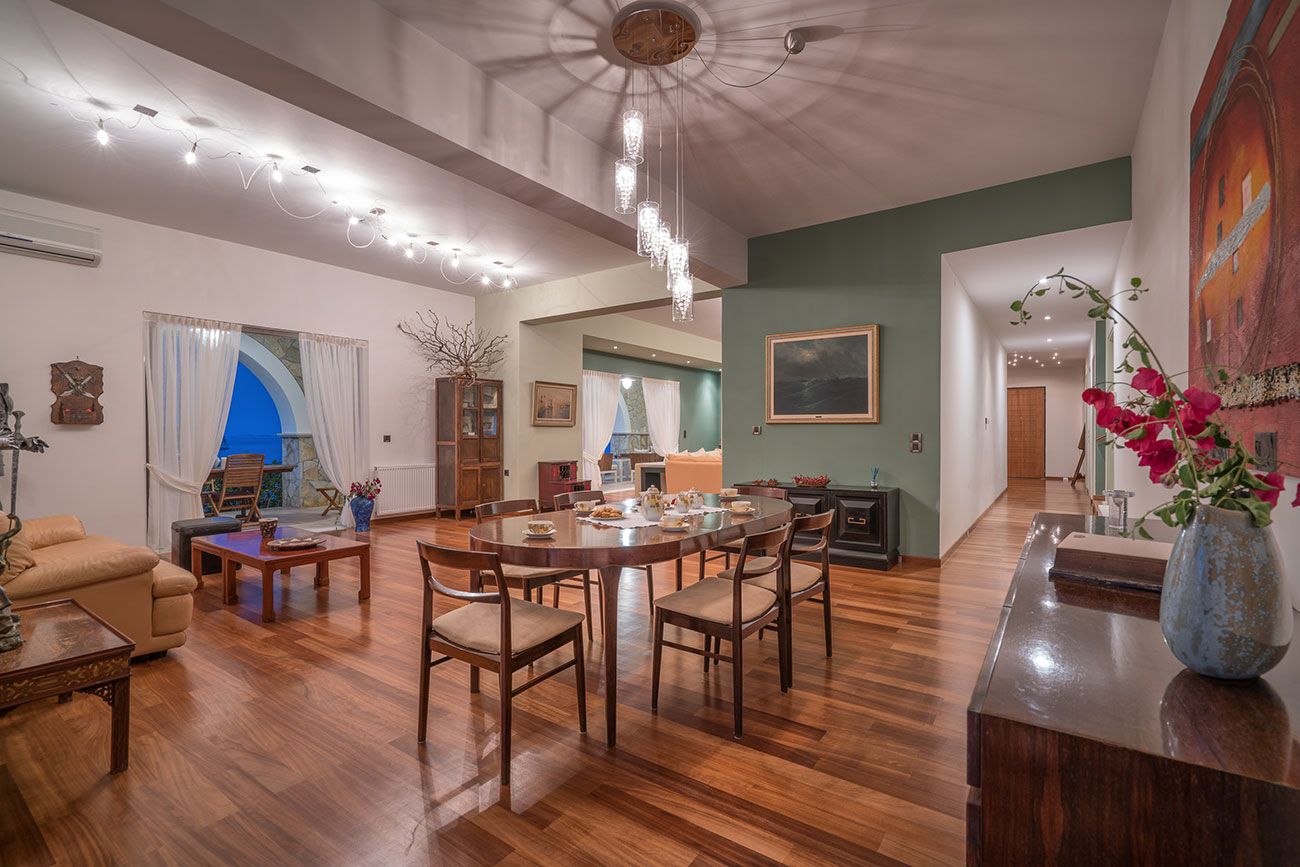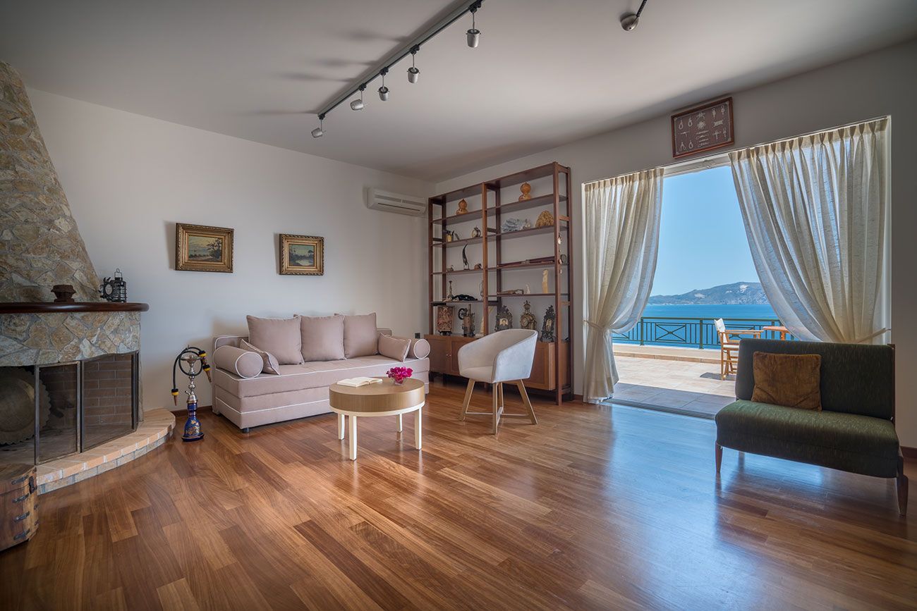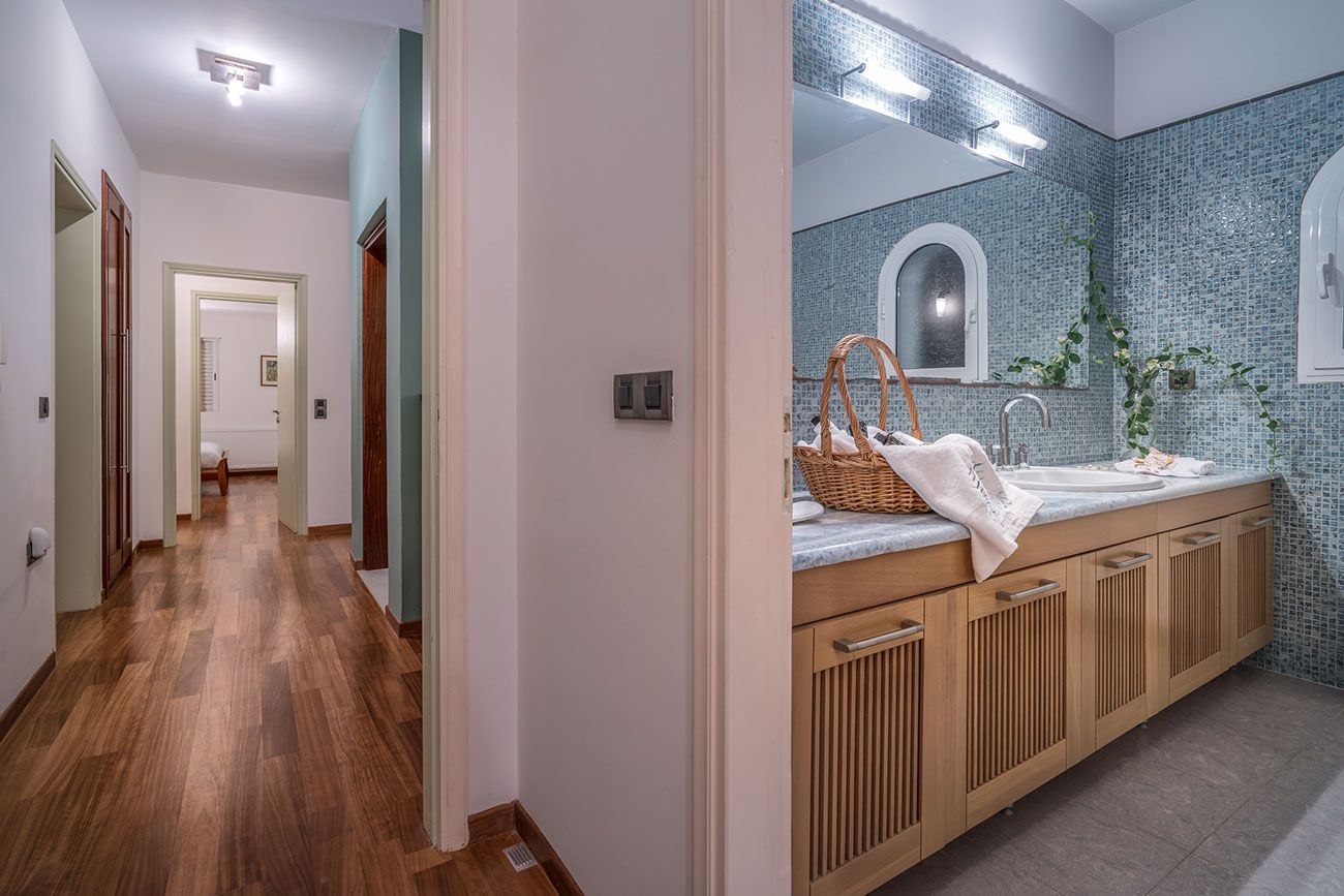 The upper floor of the villa has five guest rooms. You can request to convert one of them into an office or bedroom. While staying in the master bedroom, you can enjoy the comfort and luxury of an attached bathroom with a private Jacuzzi and various other amenities. The remaining two bedrooms share a single bathroom which also features a Jacuzzi. The villa bedrooms have huge attached verandas overlooking the Laganas Bay.