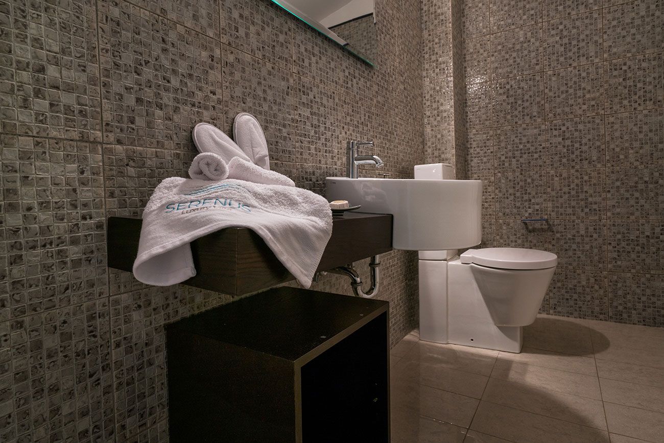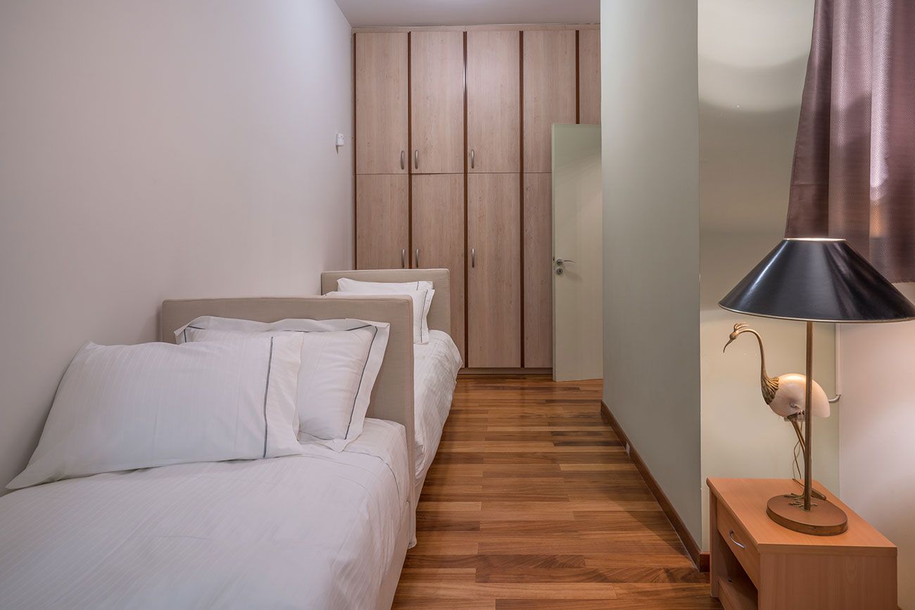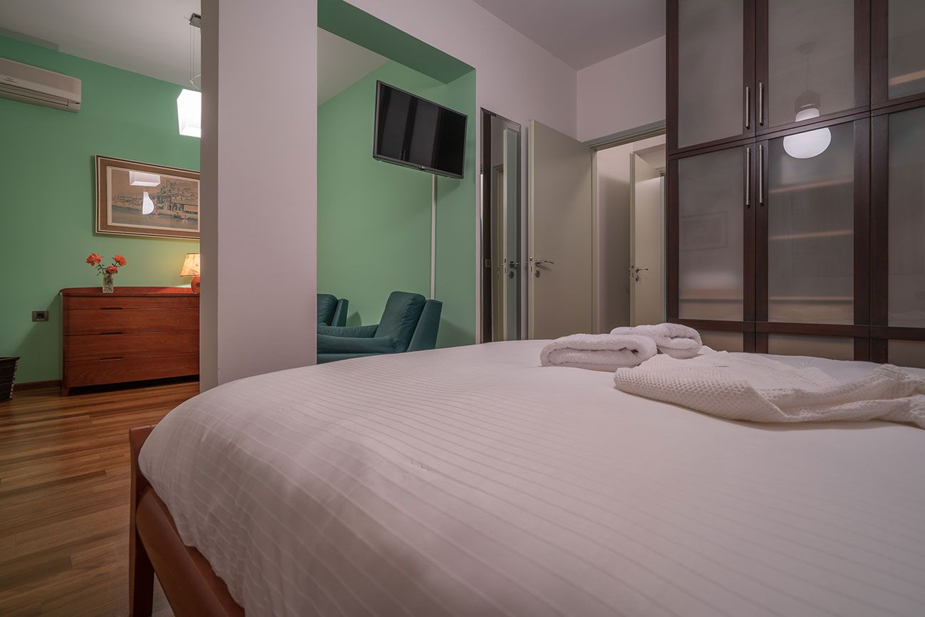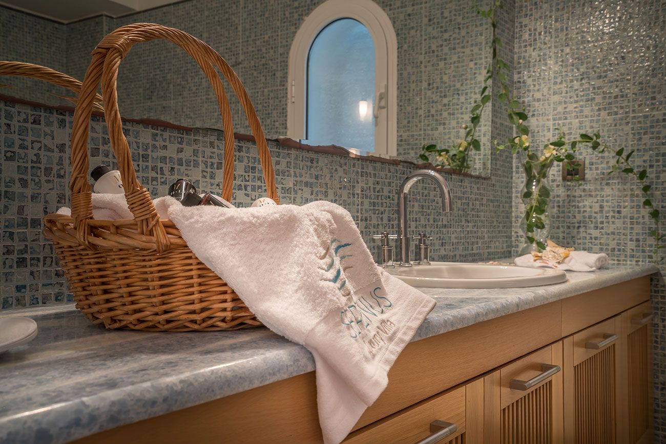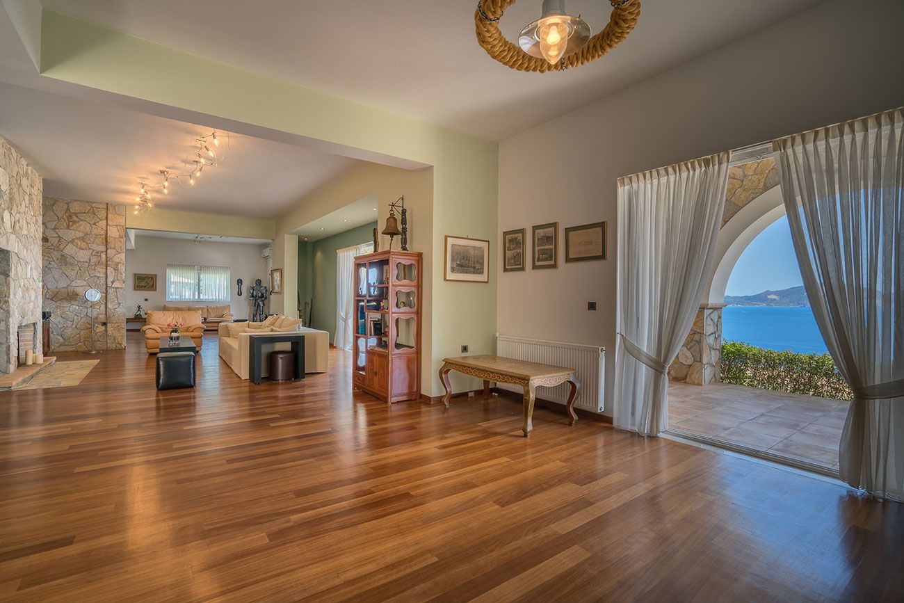 The upper floor of the villa has five guest rooms. You can request to convert one of them into an office or bedroom. While staying in the master bedroom, you can enjoy the comfort and luxury of an attached bathroom with a private Jacuzzi and various other amenities. The remaining two bedrooms share a single bathroom which also features a Jacuzzi. The villa bedrooms have huge attached verandas overlooking the Laganas Bay.