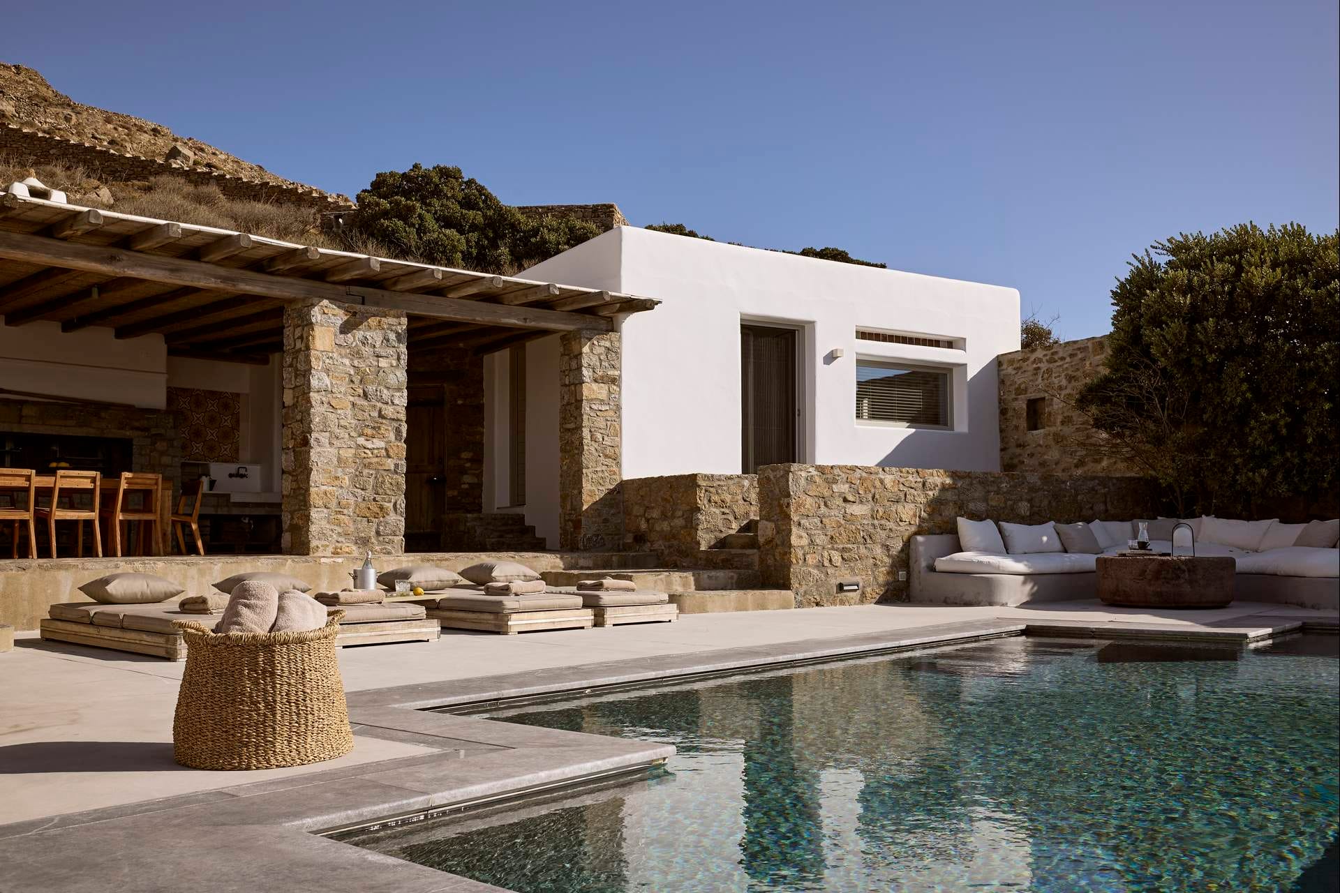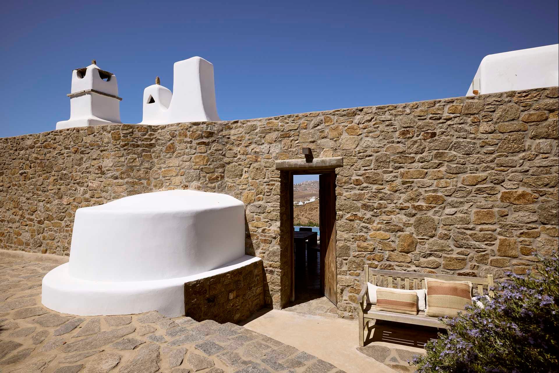 Fellini Villa is built in a private plot (measuring 3500 square meters), in the quiet village of Pantokratoras.