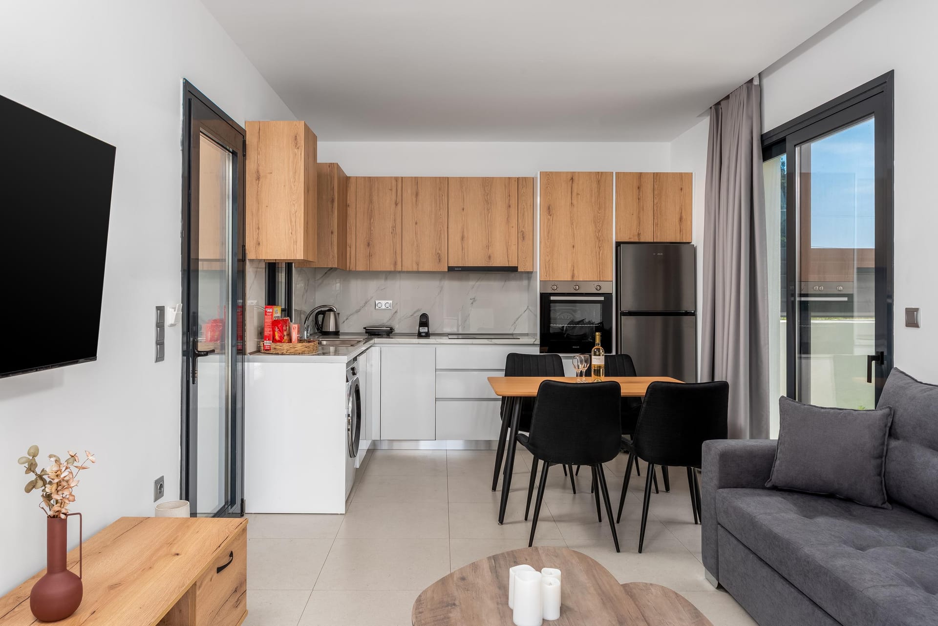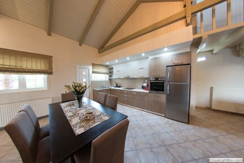The ground floor features an open plan living room and kitchen area. The living room includes a fireplace, flat screen TV and playstation (PS3). The kitchen features a dining table and is fully equipped with modern appliances such as a large refrigerator, electric cooker, microwave oven, kettle, coffee machine, frappe mixer, Tassimo coffee machine and toaster.