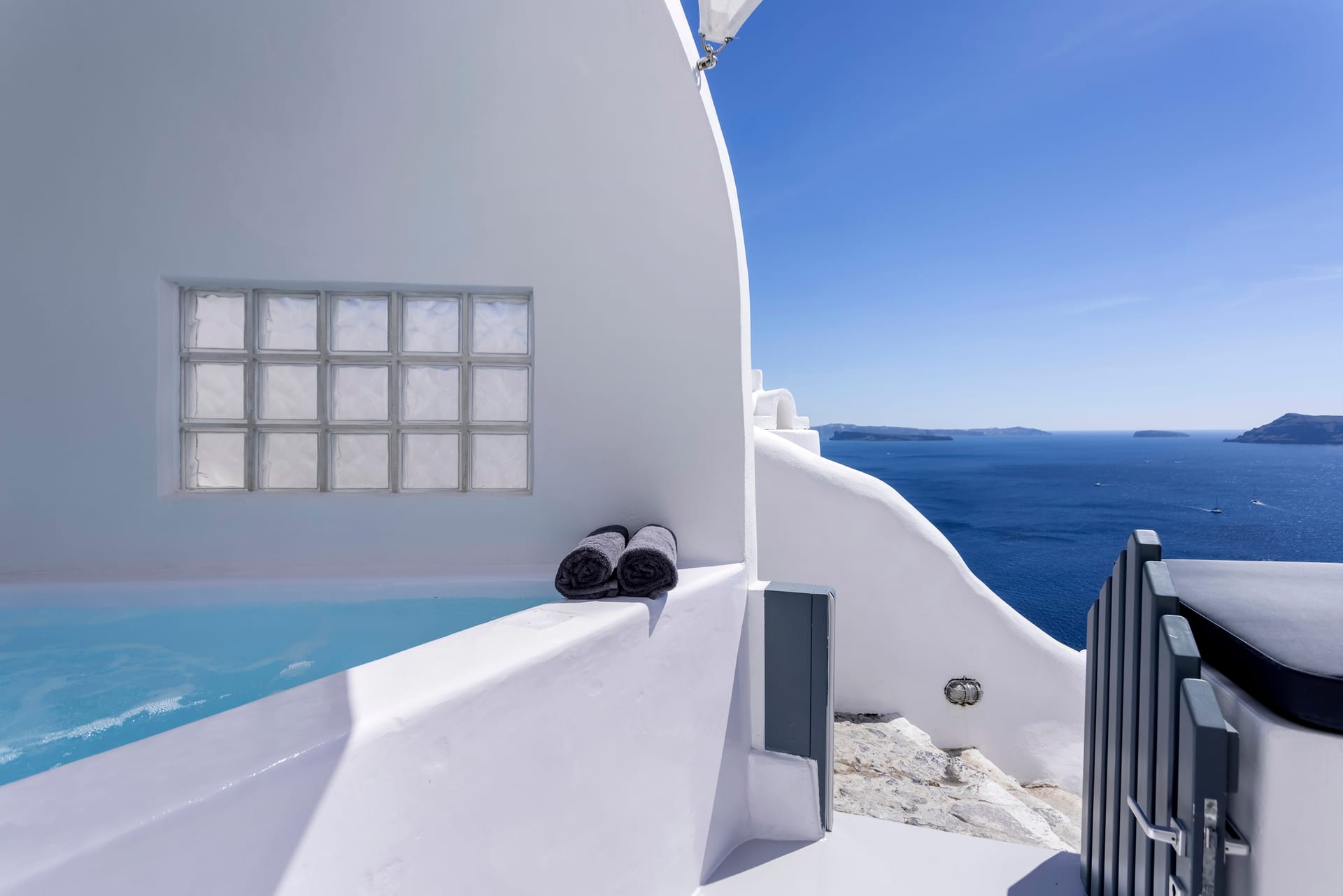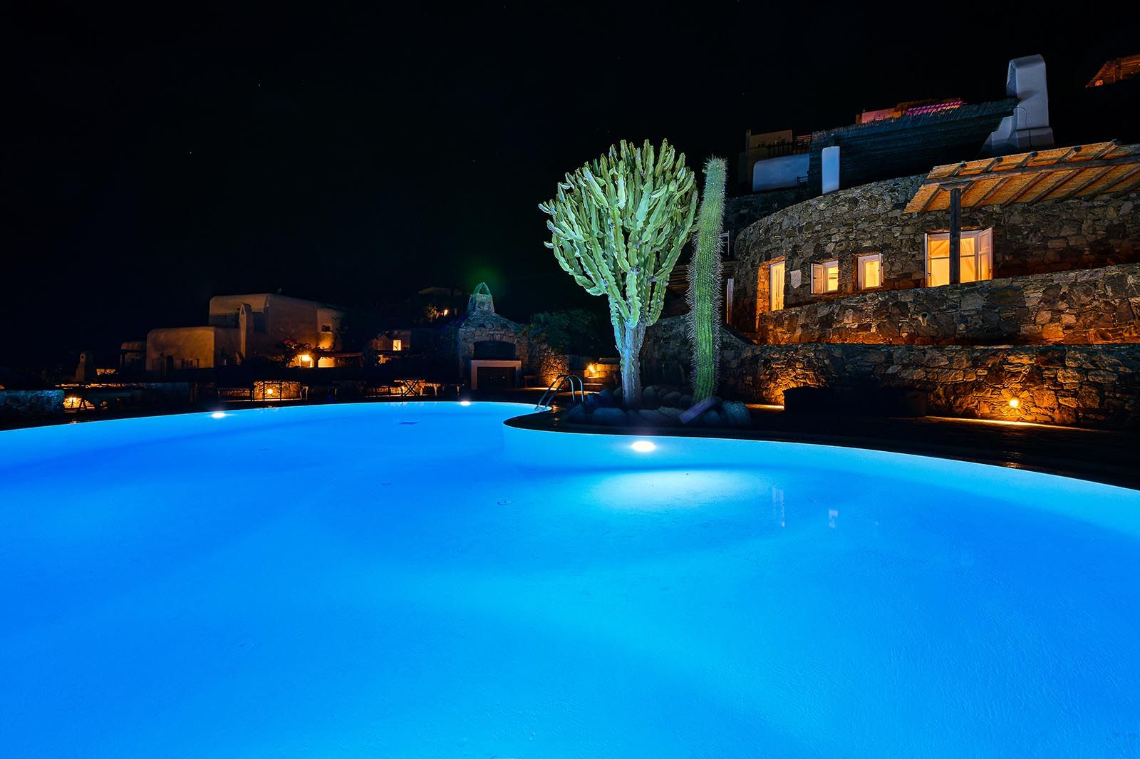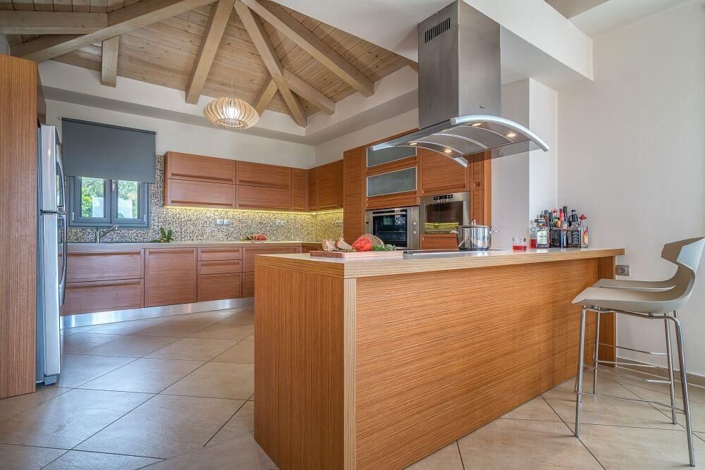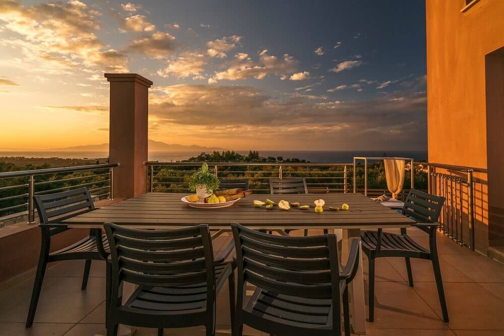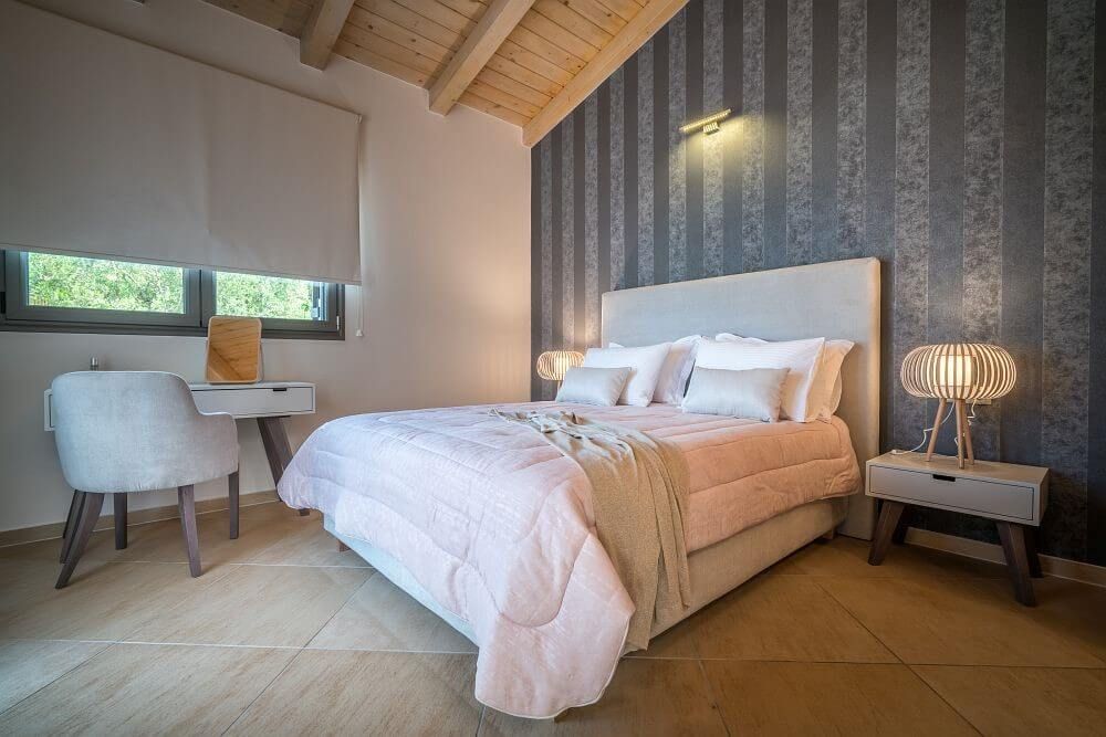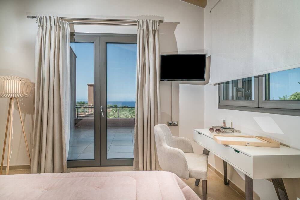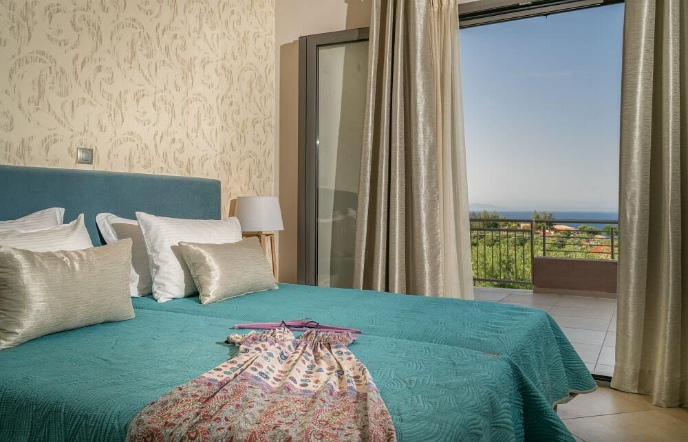 The Villa is spread across two levels both offering access to the private swimming pool. The main entrance of the villa leads to the top floor and the modern living area with windows that reveal the endless panoramic and amazing views of the beautiful Ionian sea.