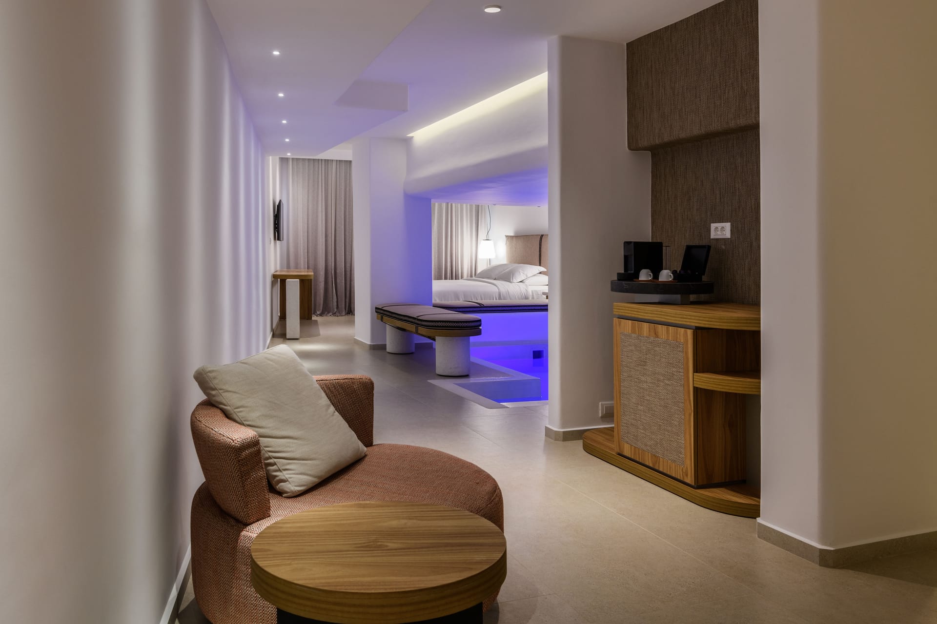 The area of Elia is one of the most cosmopolitan areas in Mykonos, as it has many restaurants, bars and shops. The spacious outdoor areas, are ideal for sunbathing, outdoor dining and lounging during the whole day.
