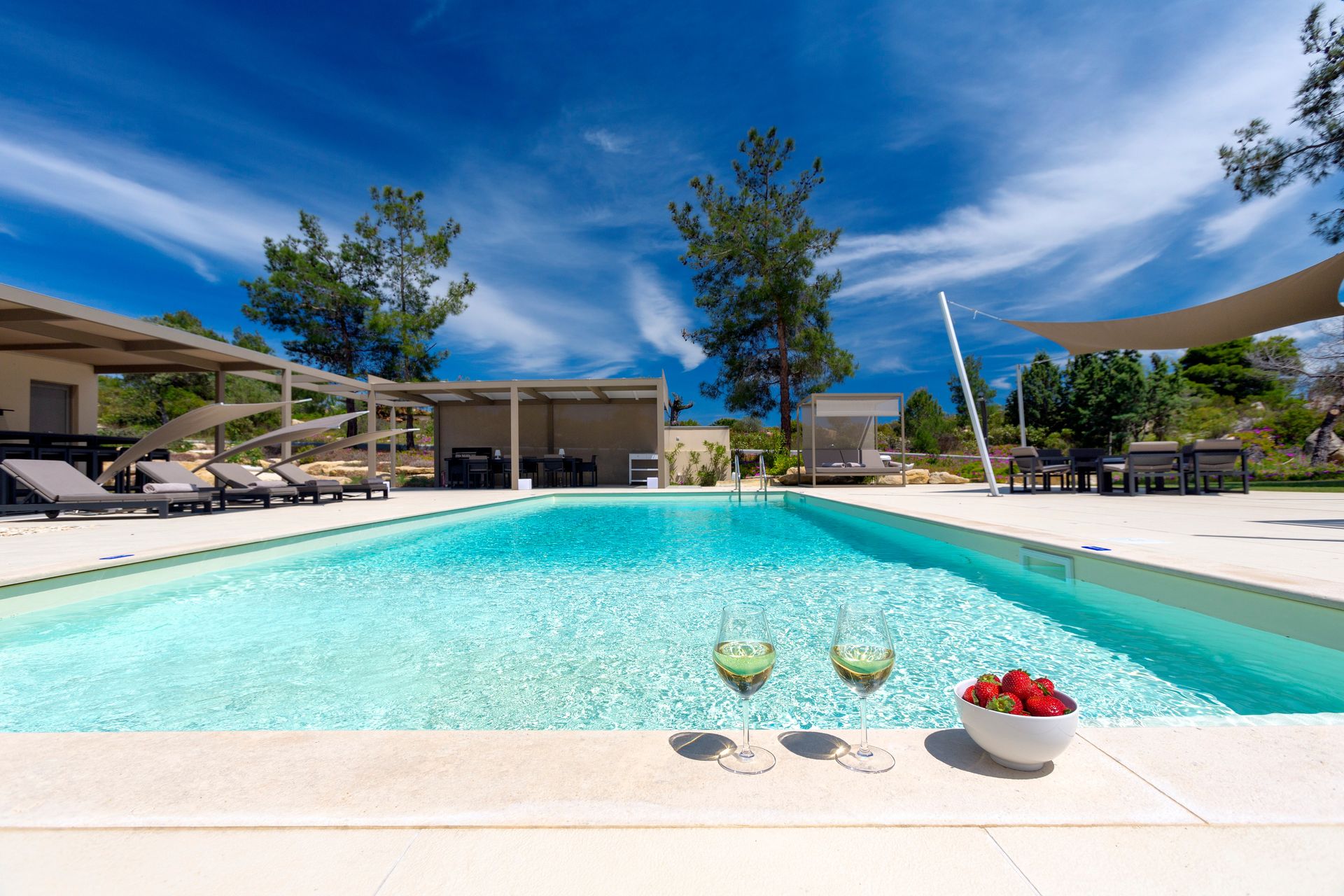 The exclusive villa features 7 spacious bedrooms, 7 bathrooms/1 WC, a comfortable living room and dining area and a fully equipped kitchen. The interior of the villa as well as the exterior was created using material of the highest quality, designers furniture and state of the art technology and equipment to extend to its select guests an enlarged experience of simplistic sophistication. On the vast outdoor area of the villa lies a refreshing large outdoor private pool and a outdoor lounge and sitting area with lavish sun beds and a bar area where guests can have memorable entertaining moments throughout the day and night.