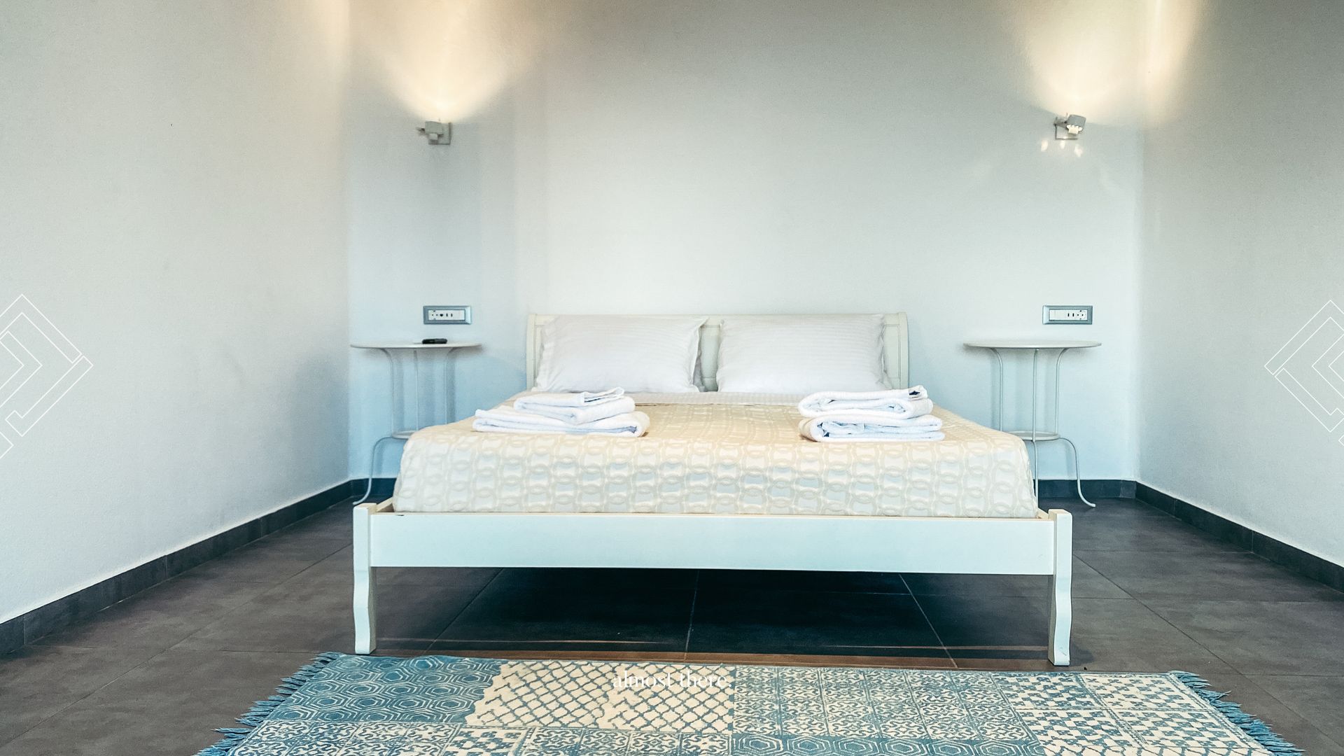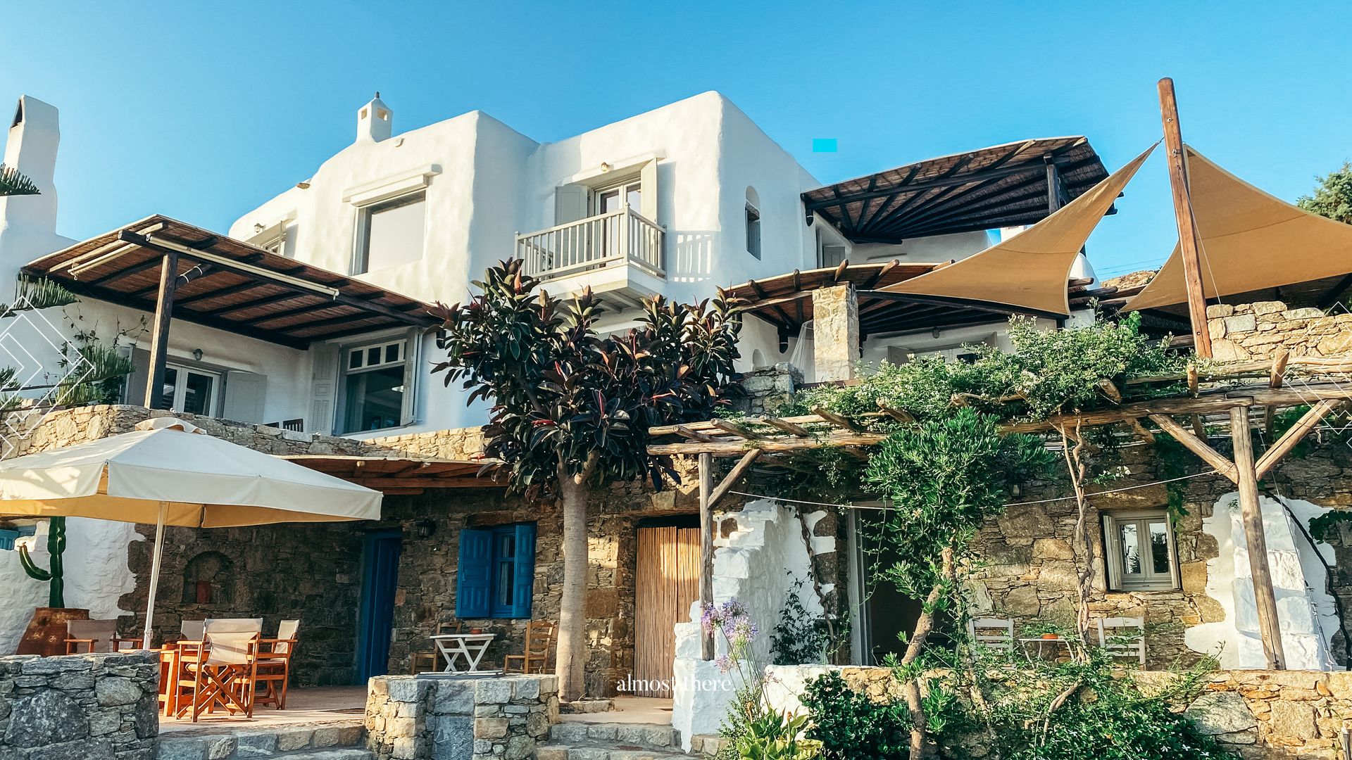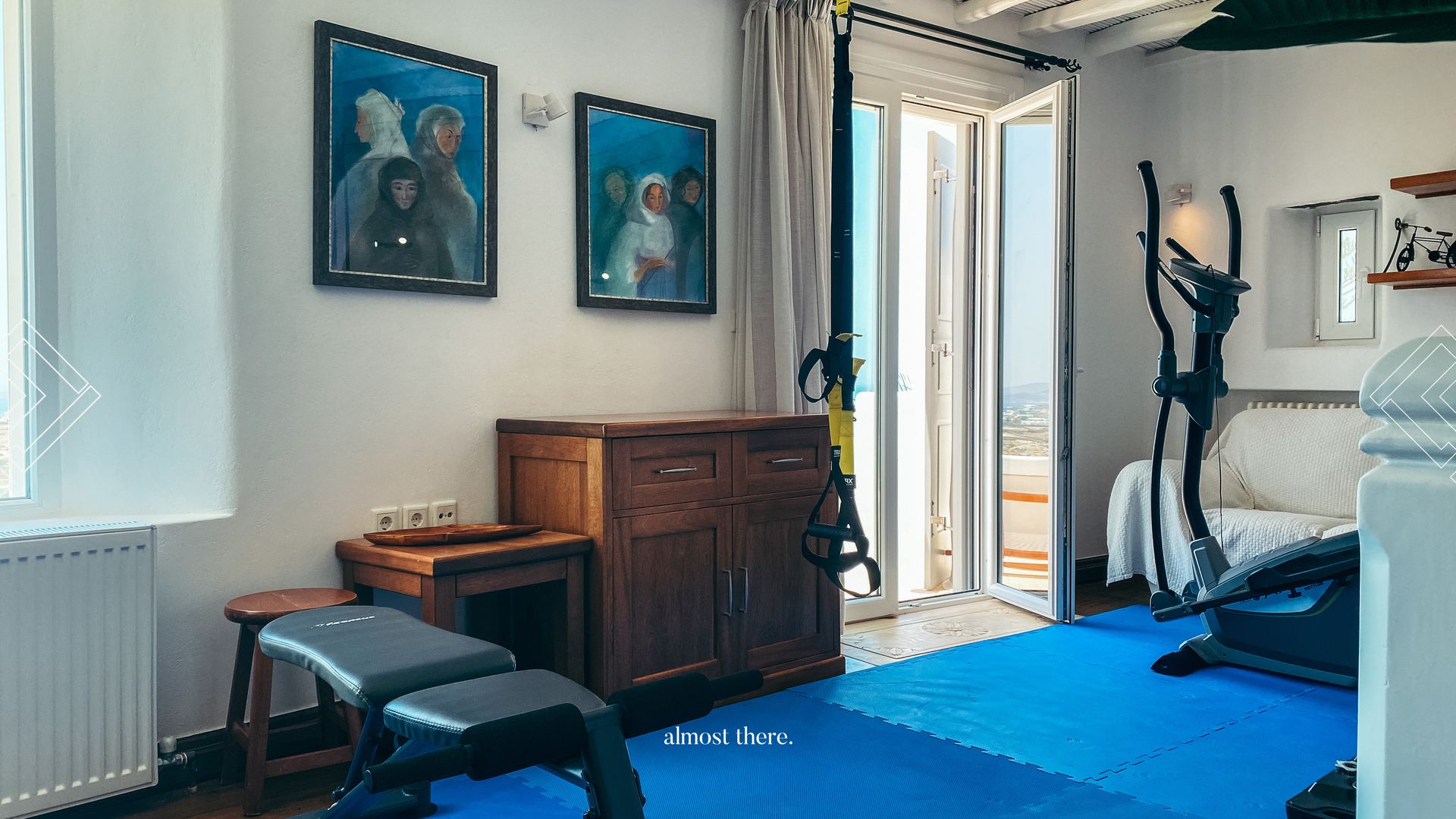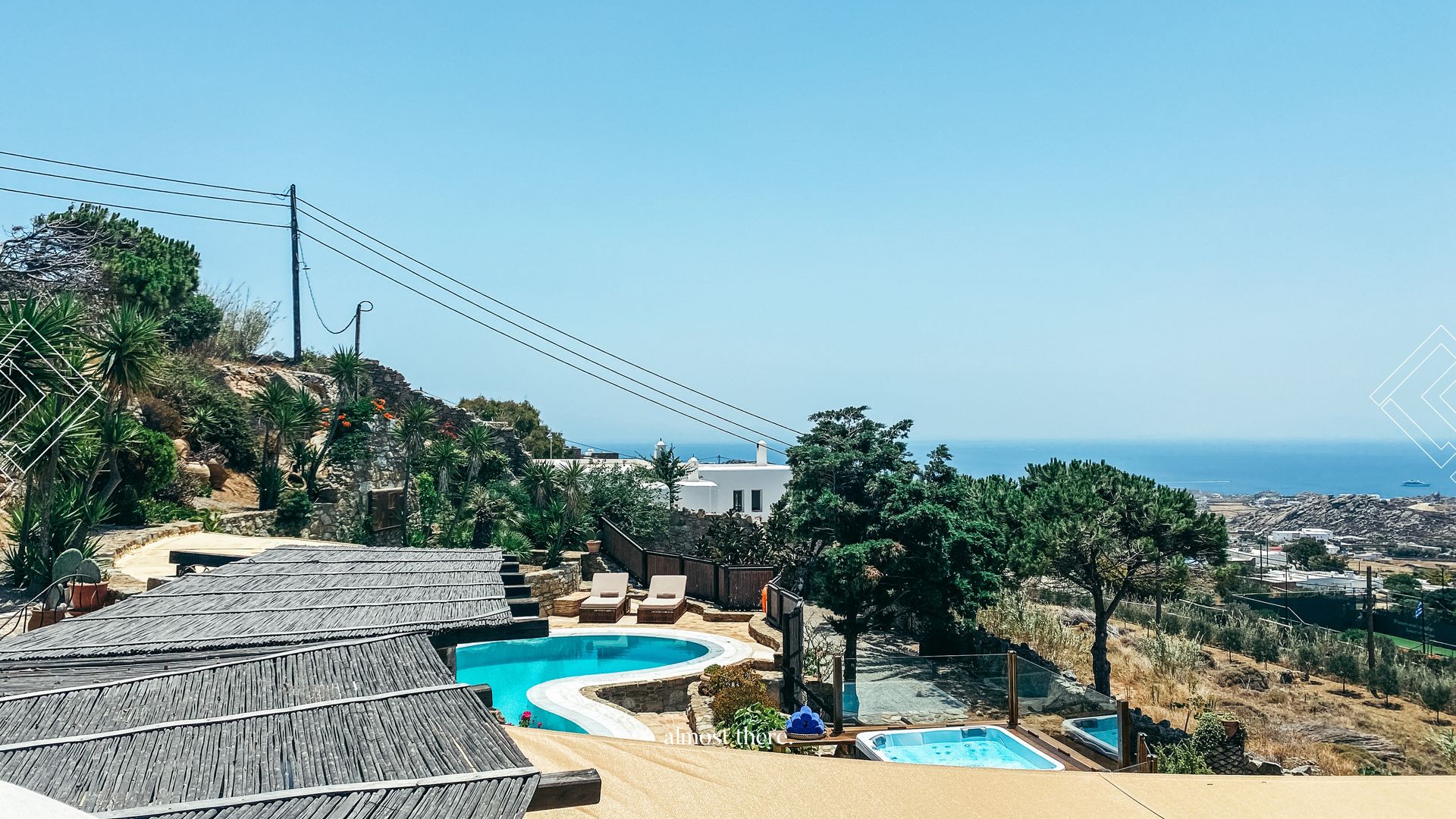 On the ground floor you find the main house, with the kitchen, living room and dining room in a spacious common area, as well as two bedrooms and two bathrooms that can take you outside to relax on the sunbeds or outdoor bed. On the first floor, you will find a private gym, next to the perfect sunset balcony, as well as the master bedroom. Your guests can find their privacy right below the pool, where 5 rooms with private balconies are located.