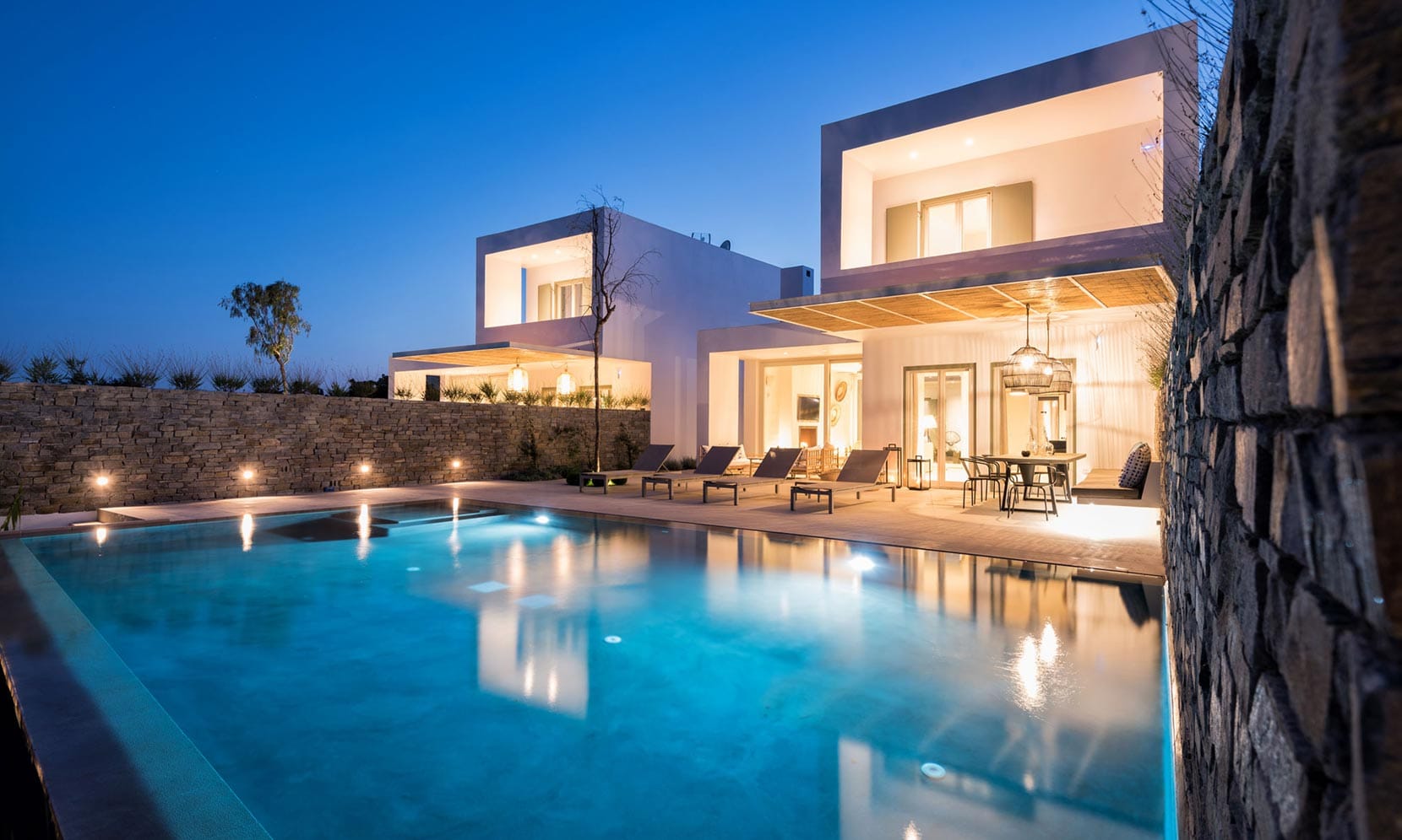 Villa Vicente 1 is a hillside hideaway in a secluded nearly rural area although close to the town, where you can relax after a long day at the magnificent beaches of the island or a long night in the vivid nightlife. Carved on a hill, 50 m from the coast, in an extraordinary setting framed by beautiful countryside, it blends uniquely in the rocky topography of its hillside, prime and unspoiled, setting.