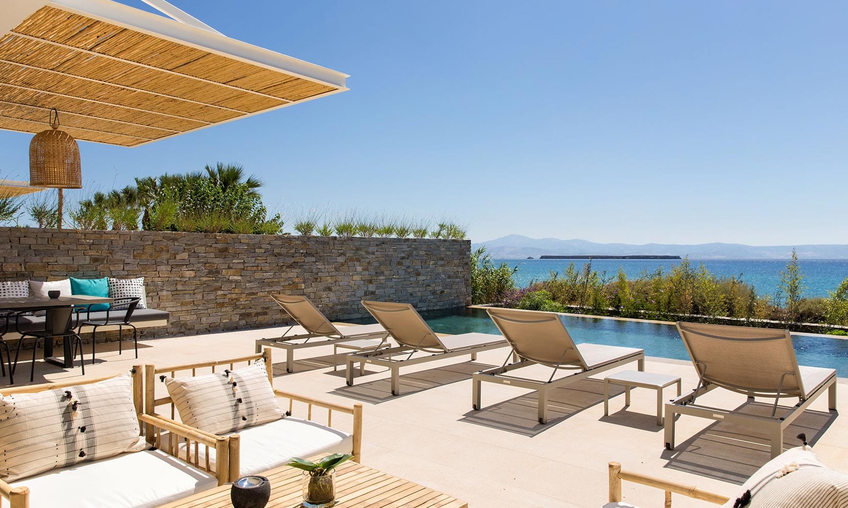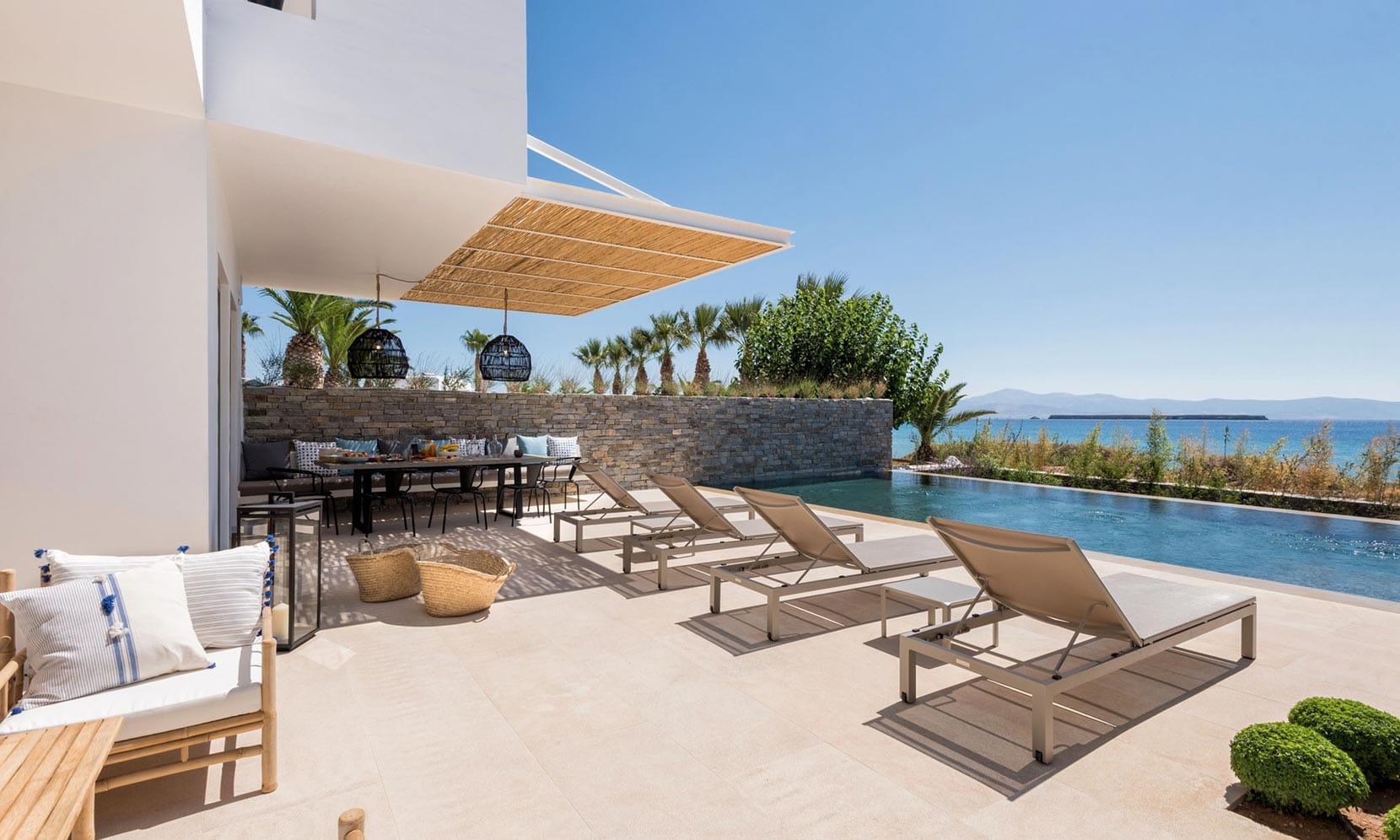 Latters are surrounded by a spacious sun deck setting which includes a large outdoor and pergola shaded lounge area equipped with comfortable sofas with cushions sun beds deck chairs paired with a large dining table which predisposes guests to enjoy a delicious meal or cocktail while watching the majestic sunrise, listening to the sounds of the sea and overlooking Mykonos’s Little Venice. The excellent landscaped garden is filled with palm trees and a selection of flowers calming the senses and creating a romantic atmosphere of relaxation and wellness.