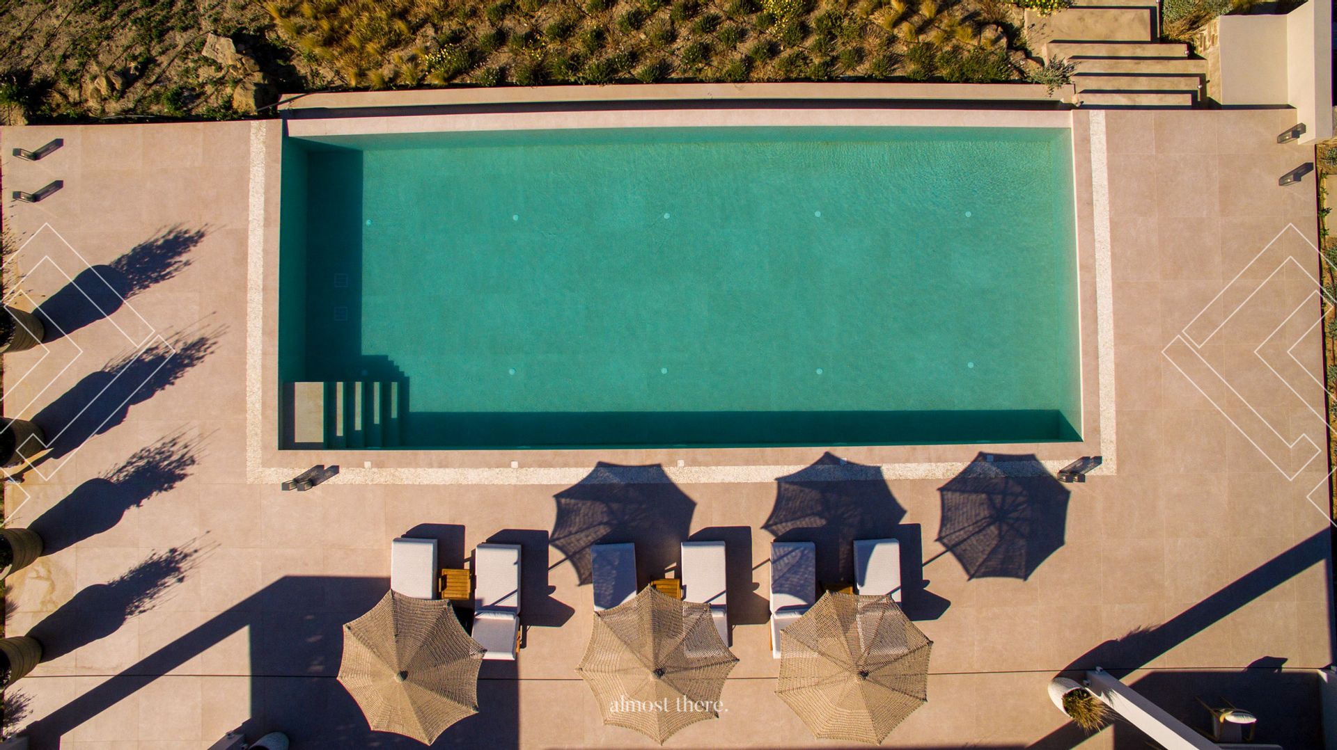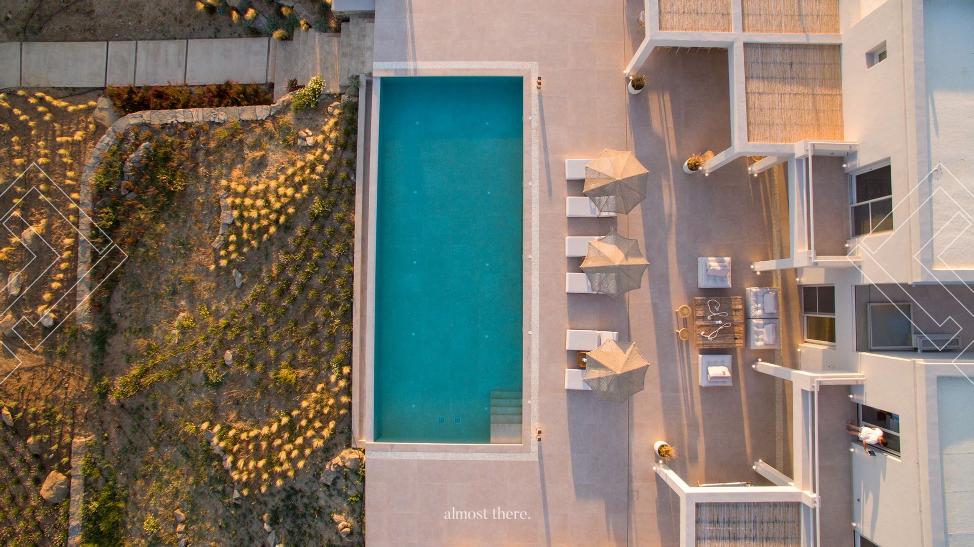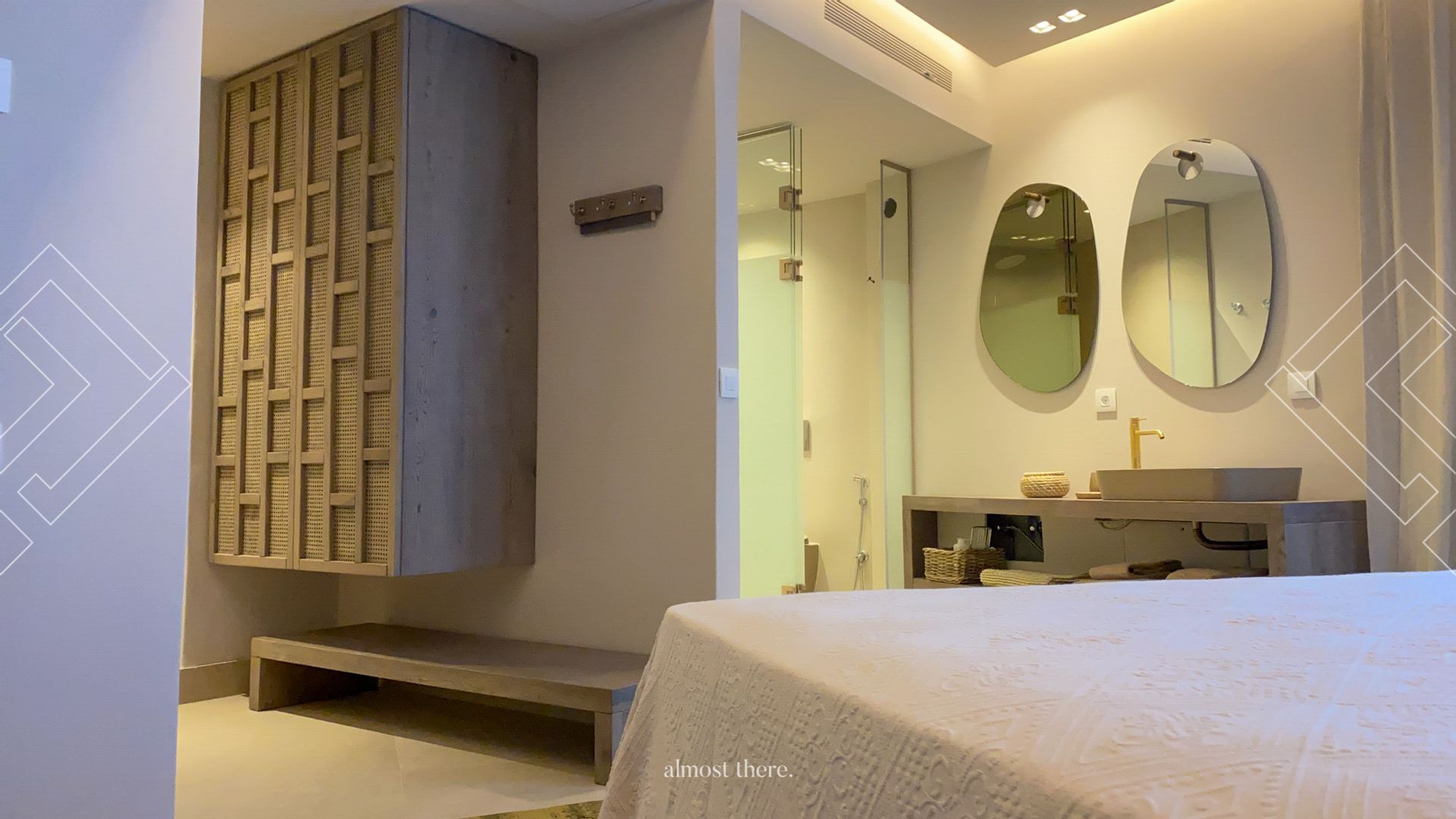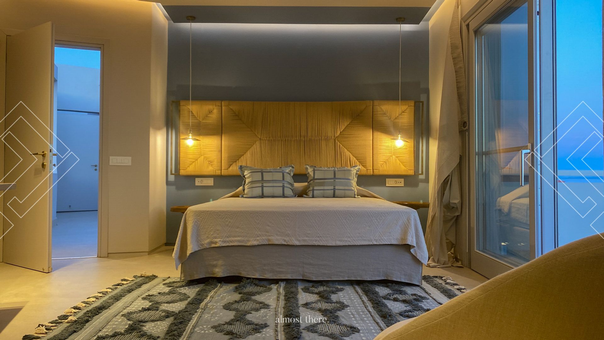 On the ground floor, you will find the master bedroom along with the fully equipped, wide-benched kitchen and the spacious living room. The whole aesthetic is carefully directed by the large windows, which allow you a constant view of the sea and sunset. Take a quick stroll outside, relax at the minimal exterior as the sunset reflects on the infinity pool. Make sure to take your breakfast on the large marble banquette outside the kitchen!