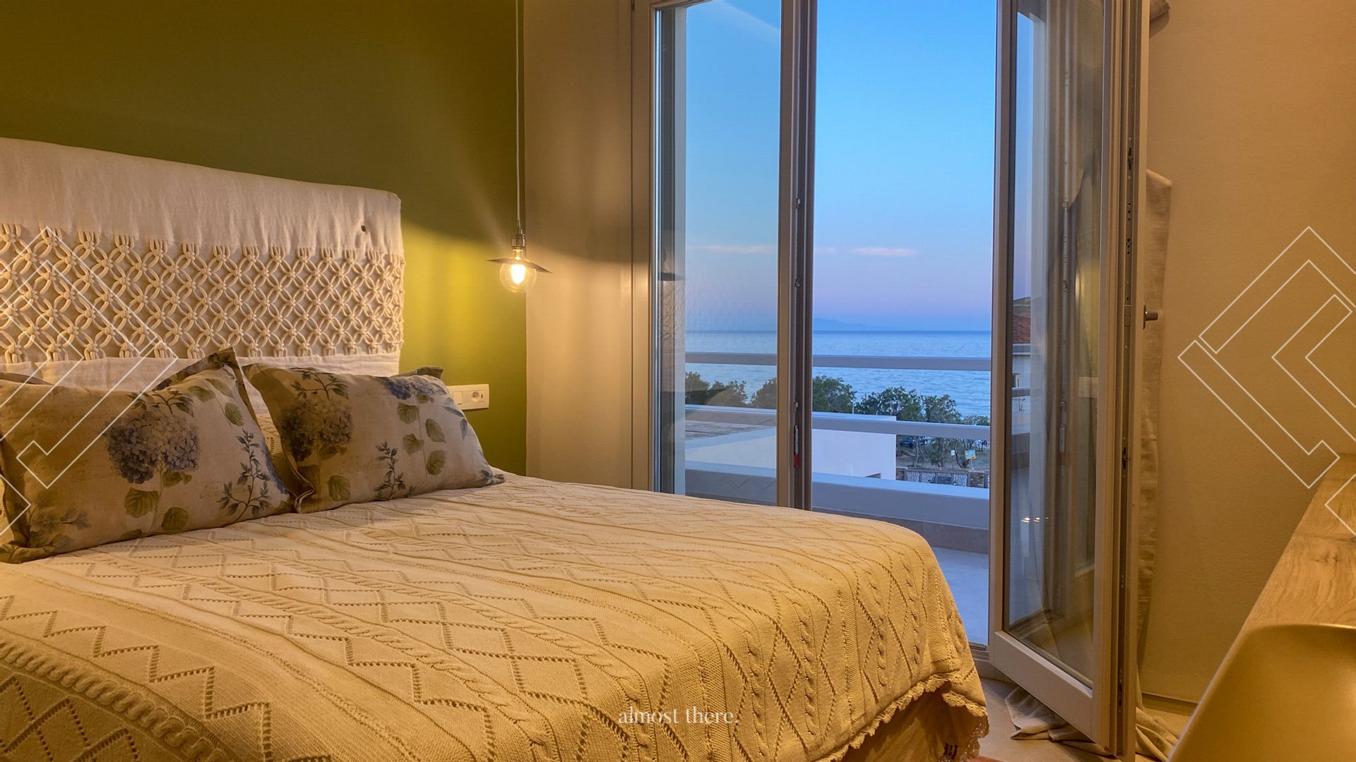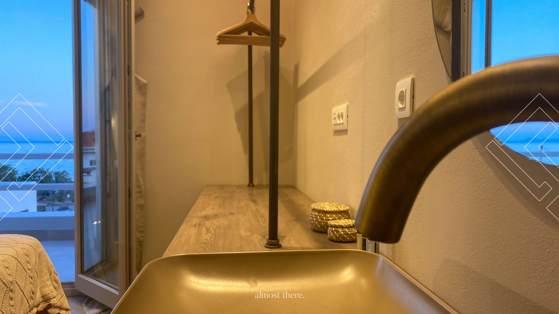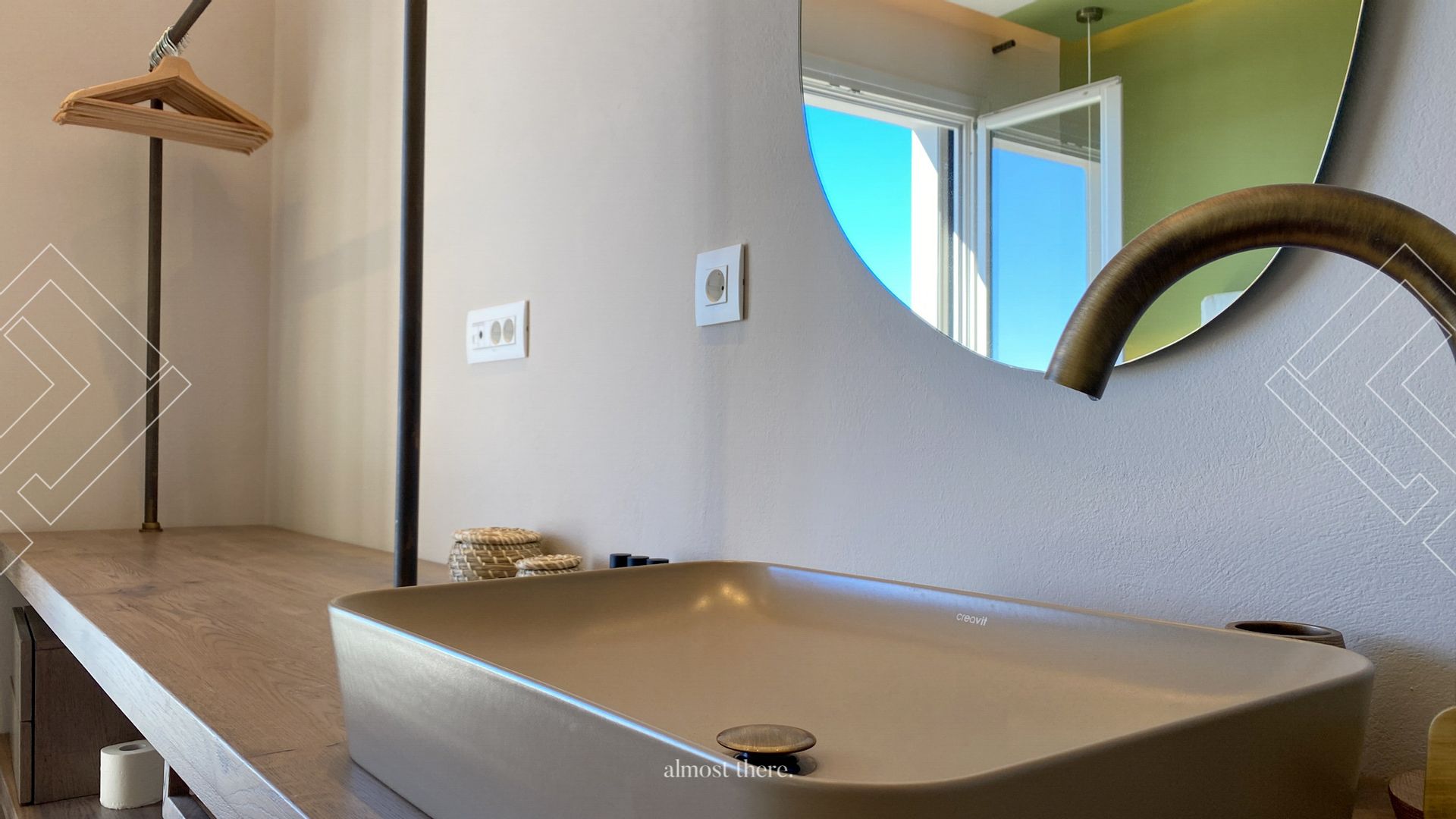 On the ground floor, you will find the master bedroom along with the fully equipped, wide-benched kitchen and the spacious living room. The whole aesthetic is carefully directed by the large windows, which allow you a constant view of the sea and sunset. Take a quick stroll outside, relax at the minimal exterior as the sunset reflects on the infinity pool. Make sure to take your breakfast on the large marble banquette outside the kitchen!