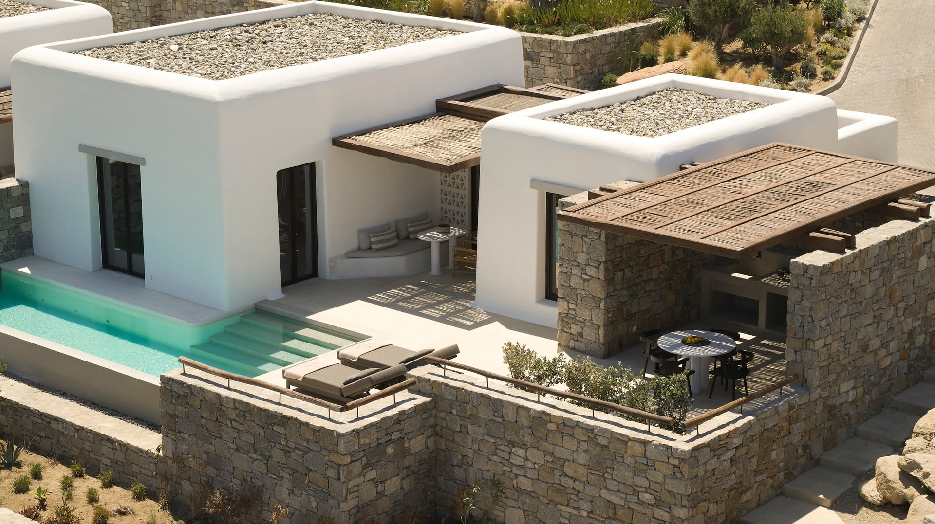 Our luxurious villas offer unobstructed views of the Aegean Sea and the majestic Mykonian sunrise. Each villa opens onto an expansive terrace/garden with a private, heated infinity pool (up to 23°C/73°F), a private kitchen for BBQs, two dining areas and a double sun lounger. The bedroom features a king size bed (2mX2m/6.5ftX6.5ft mattress), a sofa bed (1.60mX2m/5.2ftX6.5ft mattress), and a satellite mirror TV. The spacious bathroom includes a walk-in shower, double sink, and a freestanding bathtub with sea views. For fans of al fresco bathing, the outdoor shower on the patio is a sublime experience.