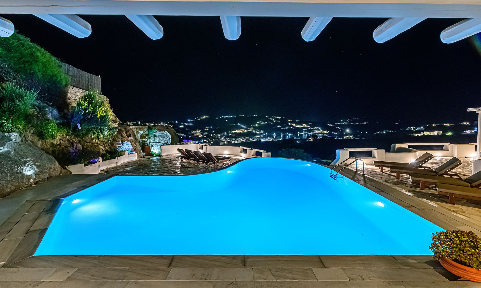 The 200 sq.m. villa is spread over three stories and will accommodate spaciously up to 8-9 guests. The entrance is on the ground floor opening to the living room, the dining area, and the kitchen, along with a WC. The large windows all around the space offer amazing views for the guests. On the first floor, there is the master bedroom with a king-size bed, two bedrooms with queen-size beds, and two bathrooms with showers. The large heated indoor plunge pool with an entertainment lounge is in the basement along with the fourth bedroom and the third bathroom with a shower.