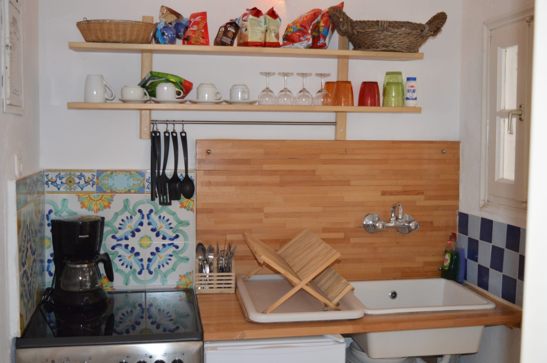 Studio for four guests (two rooms, not autonomous-the one room is the main bedroom with two single beds or a double bed and the other room is the entrance/living room with two sofa beds (about 6-8 sqm - Not a two-bedroom apartment). In between of the two rooms are the bathroom and the kitchenette, with private balcony/veranda overlooking the beach of Kalo Livadi (Sea View), in room equipped with a/c, flat TV set, DVD player, safe box, wireless internet access, fully equipped kitchen with all the equipment, refrigerator, bathroom with shower (30 sqm).