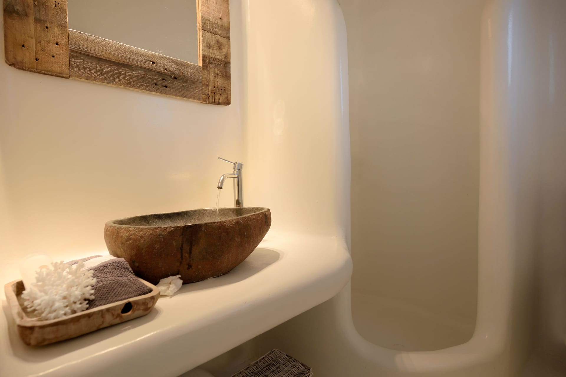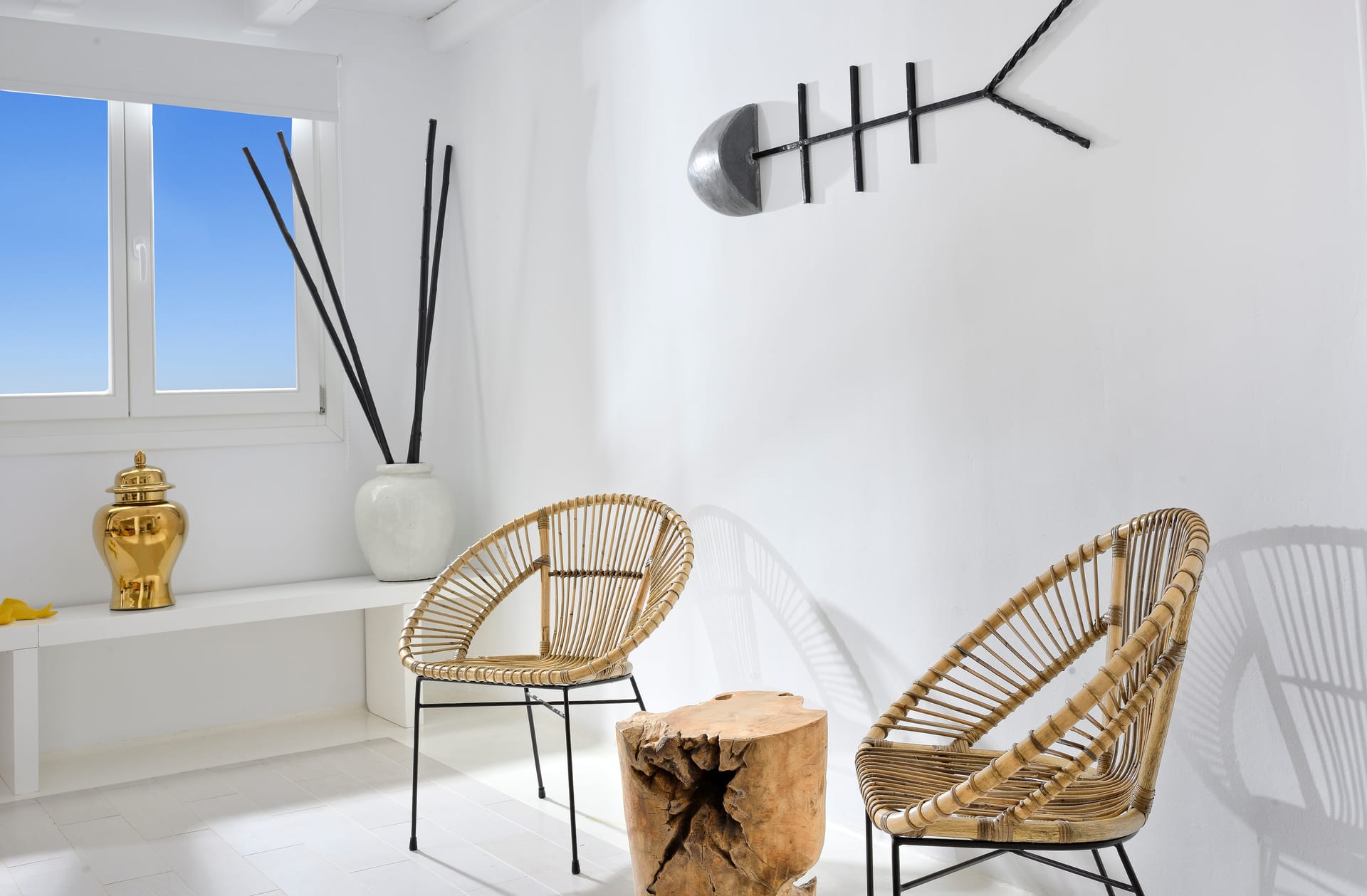 Indoor and outdoor luxury is foremost in this villa to delight in Mykonos style. The grand covered outdoor terrace commands a spectacular view which you can enjoy seated in the comfortable outdoor living area. Inside, enjoy casual snacks or morning coffee at the breakfast table next to the modern kitchen. Fully equipped, the kitchen has everything you need to prepare a feast for your guests. The indoor dining area and living room are open and spacious with windows and doors which open to the view.