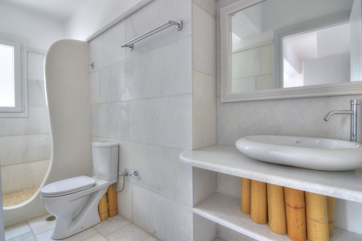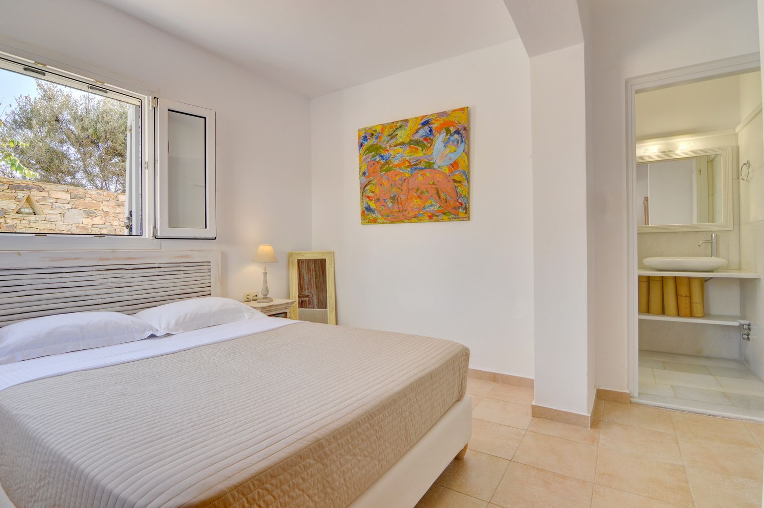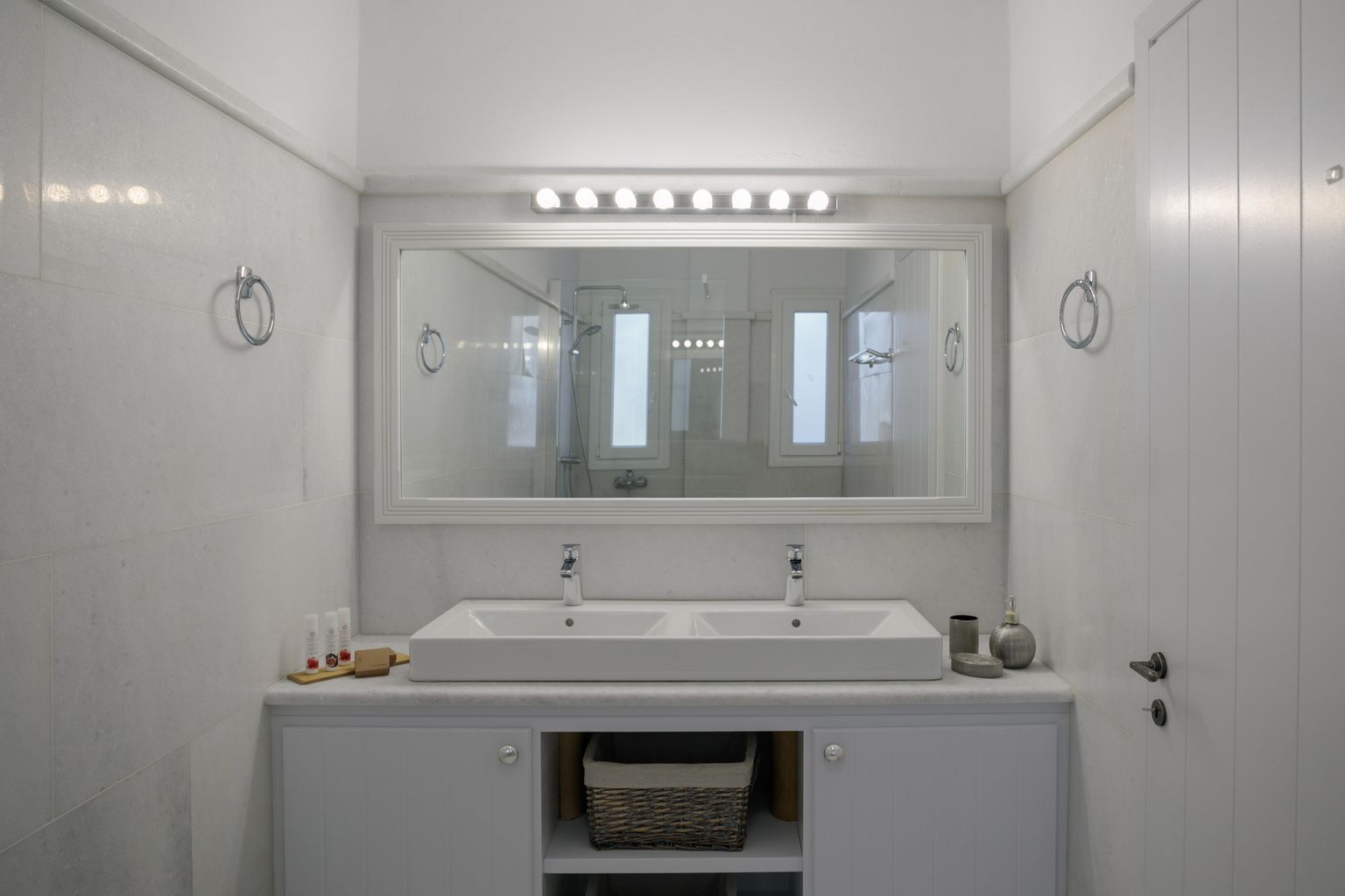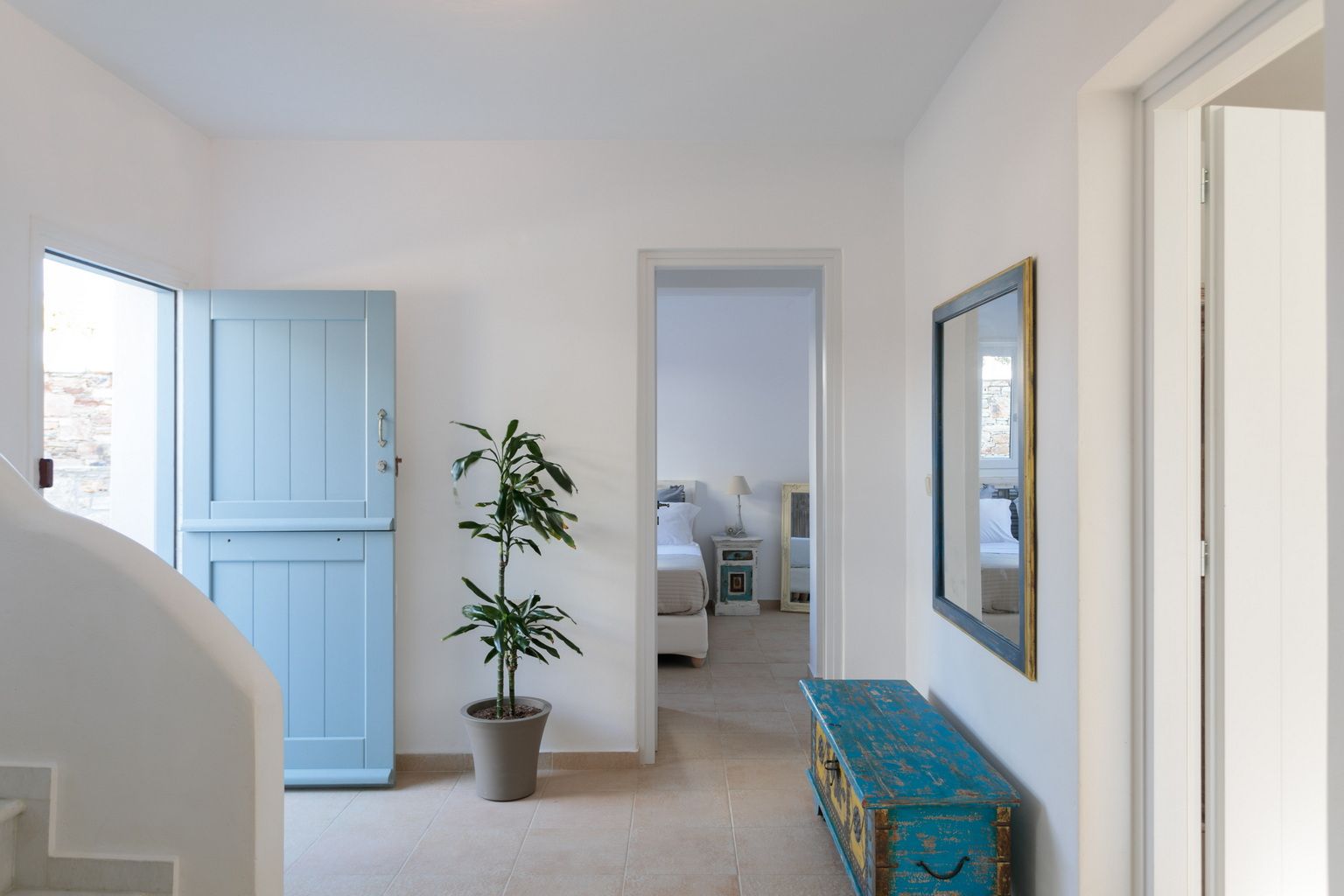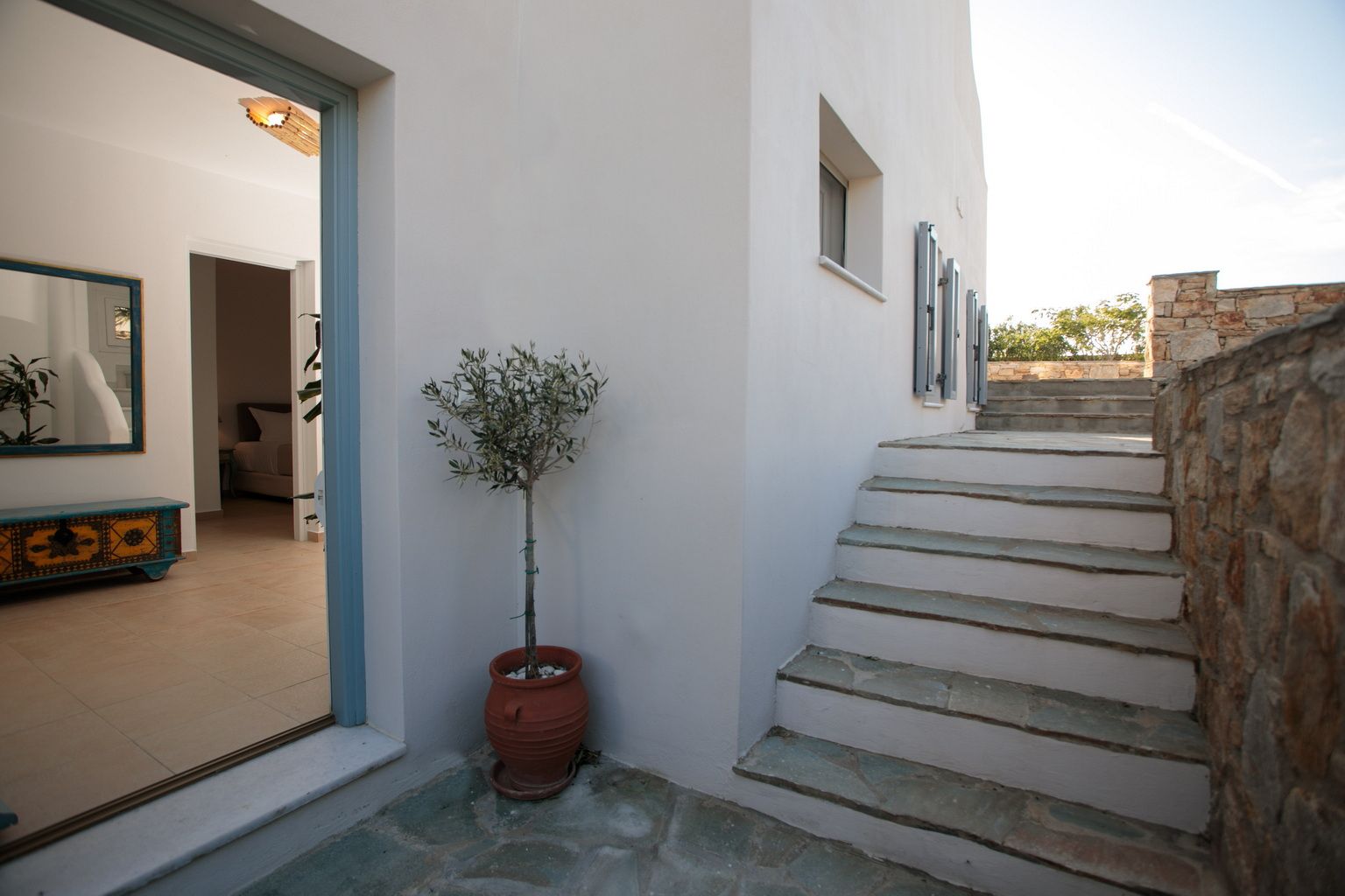A beautiful white marble staircase with a handmade steel banister leads to the first floor. The upper level is a more "private" space of the house with a charming luminous master en-suite bedroom and wonderful views of the outside scenery. It's private terrace, overlooking the Aegean Sea is one of the best spots of the house to enjoy in serenity the colorful sunset. The bathroom is designed to offer you maximum relaxation, choosing between a Jacuzzi and a rain forest shower.