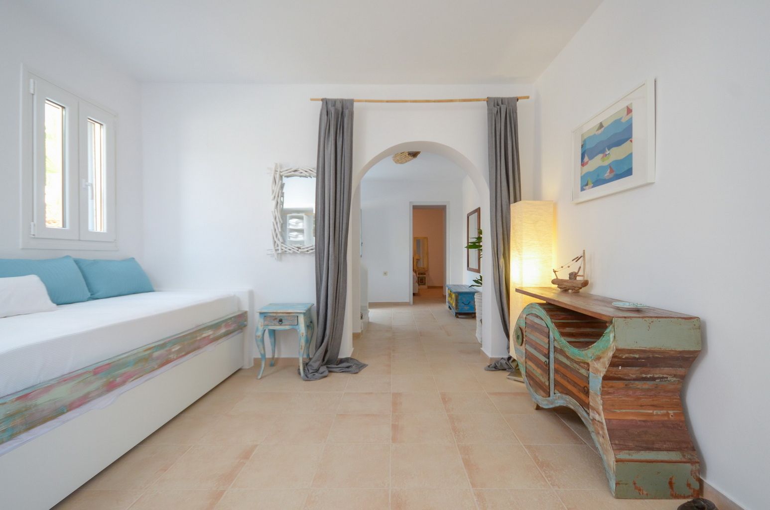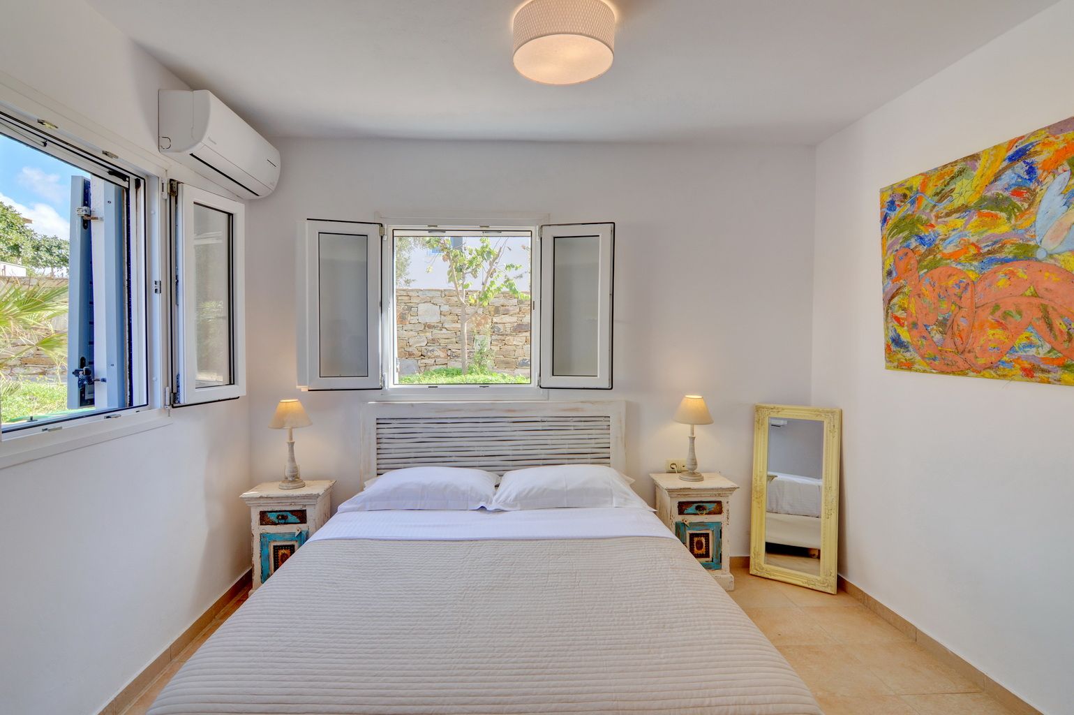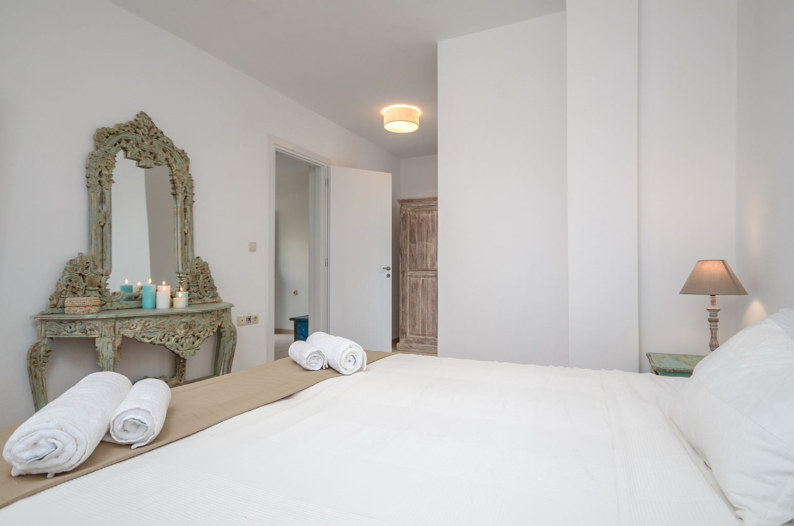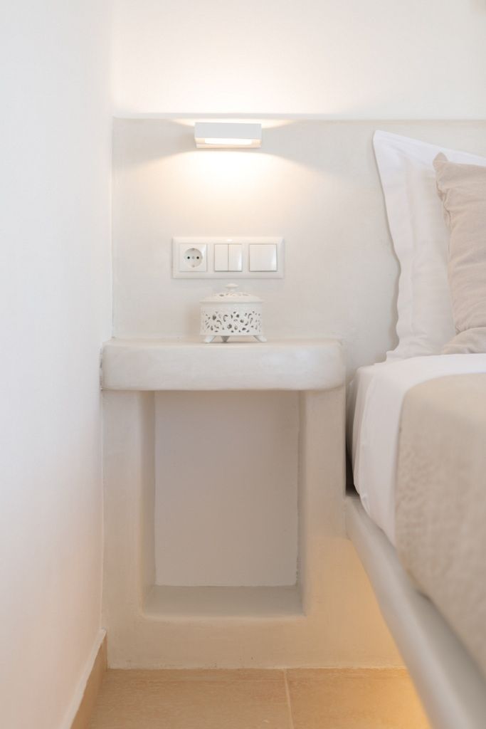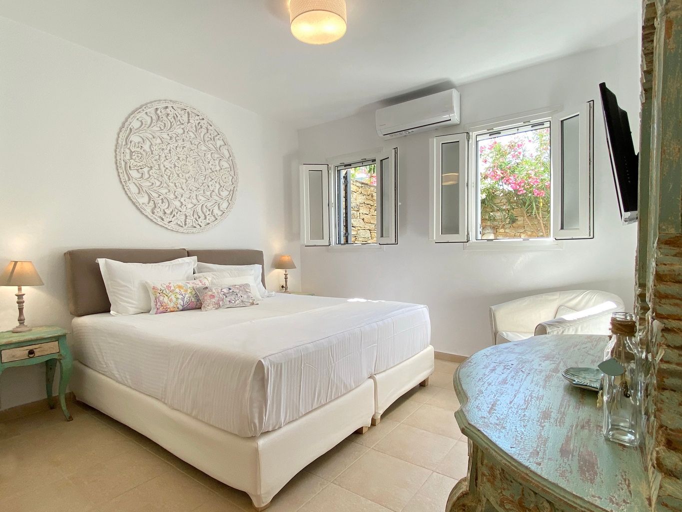 A beautiful white marble staircase with a handmade steel banister leads to the first floor. The upper level is a more "private" space of the house with a charming luminous master en-suite bedroom and wonderful views of the outside scenery. It's private terrace, overlooking the Aegean Sea is one of the best spots of the house to enjoy in serenity the colorful sunset. The bathroom is designed to offer you maximum relaxation, choosing between a Jacuzzi and a rain forest shower.