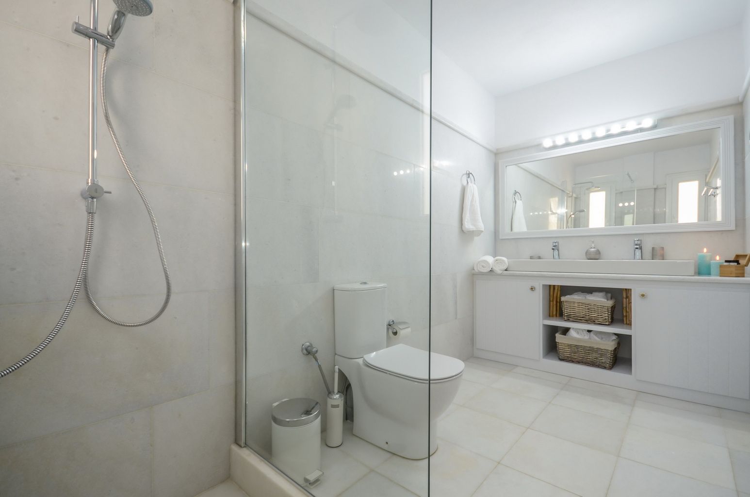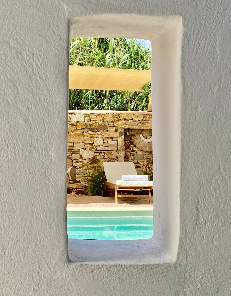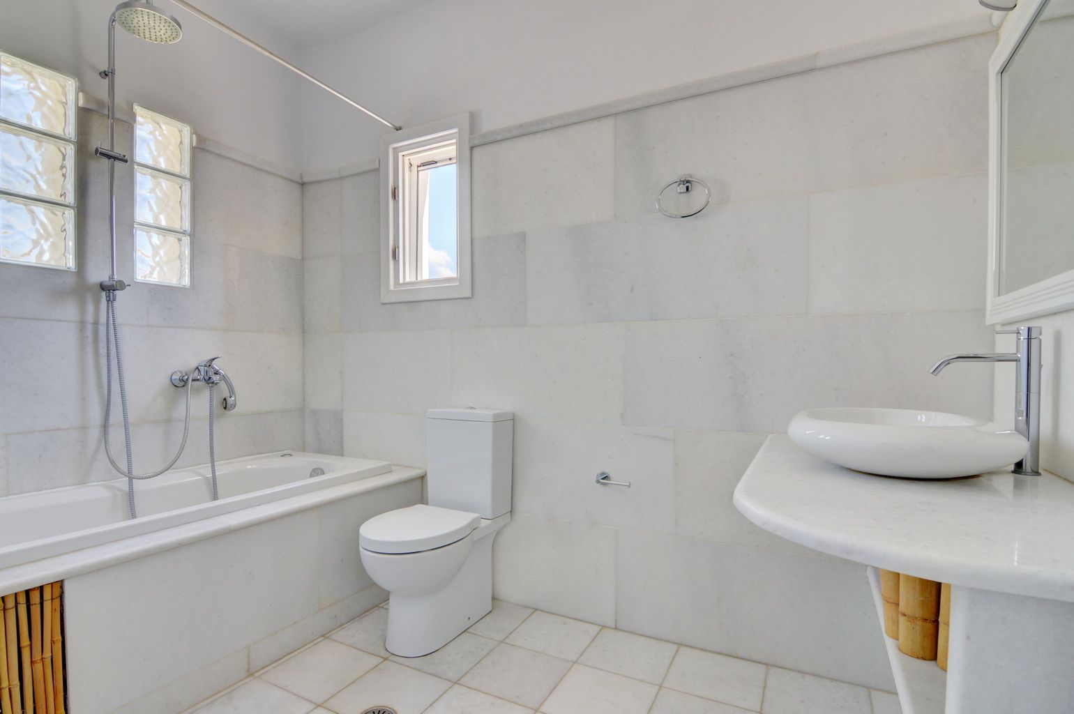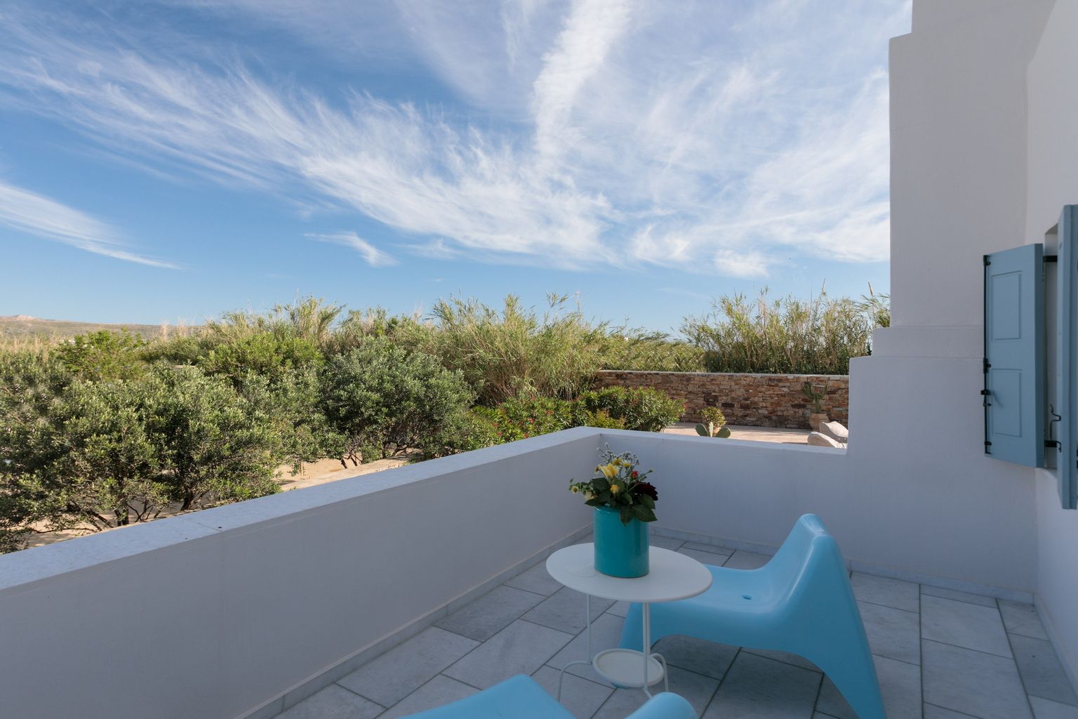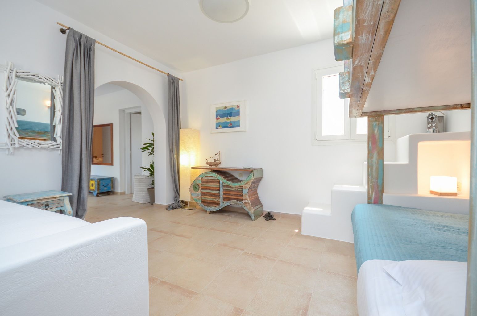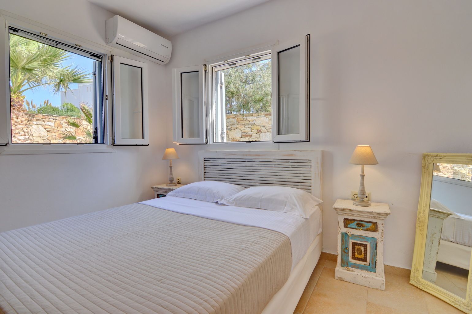 A beautiful white marble staircase with a handmade steel banister leads to the first floor. The upper level is a more "private" space of the house with a charming luminous master en-suite bedroom and wonderful views of the outside scenery. It's private terrace, overlooking the Aegean Sea is one of the best spots of the house to enjoy in serenity the colorful sunset. The bathroom is designed to offer you maximum relaxation, choosing between a Jacuzzi and a rain forest shower.