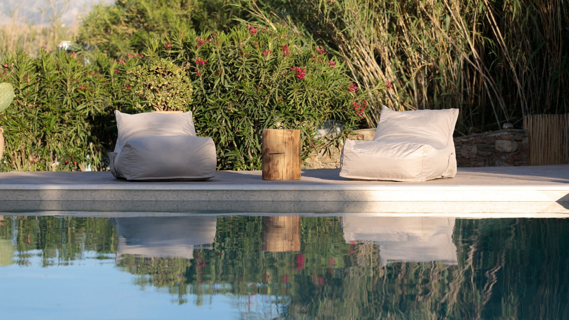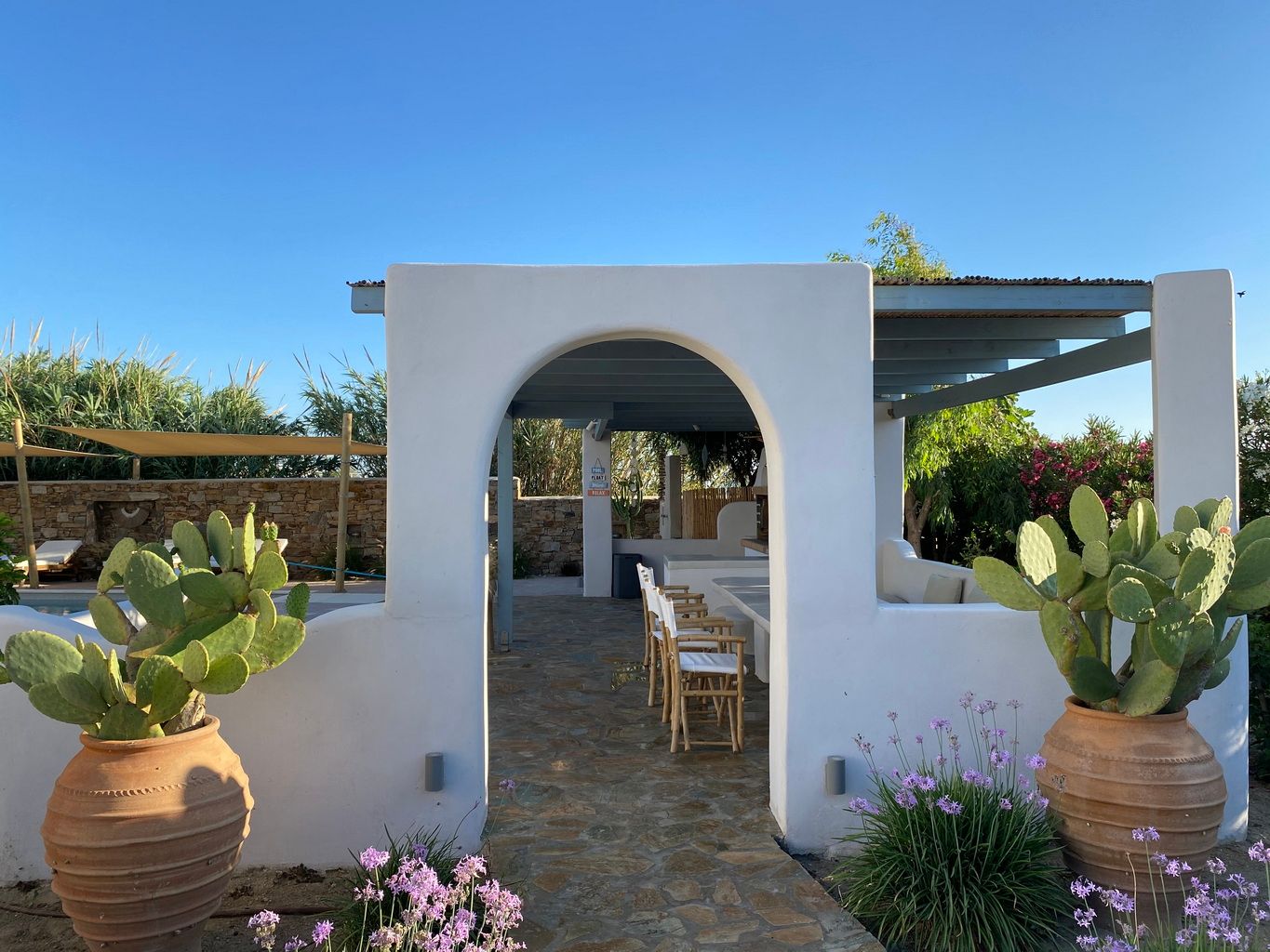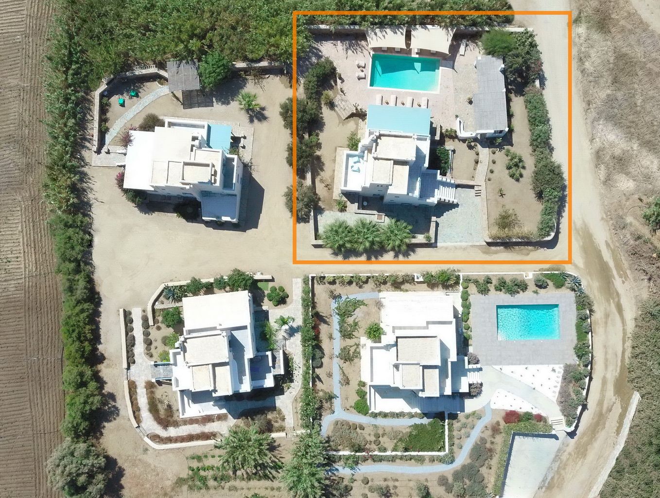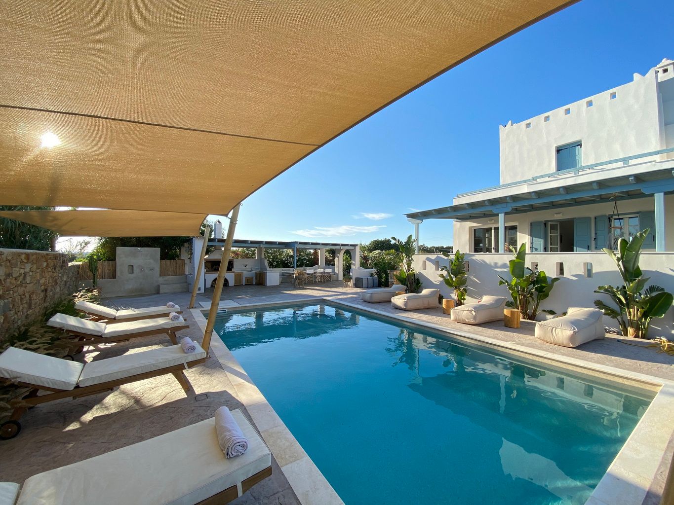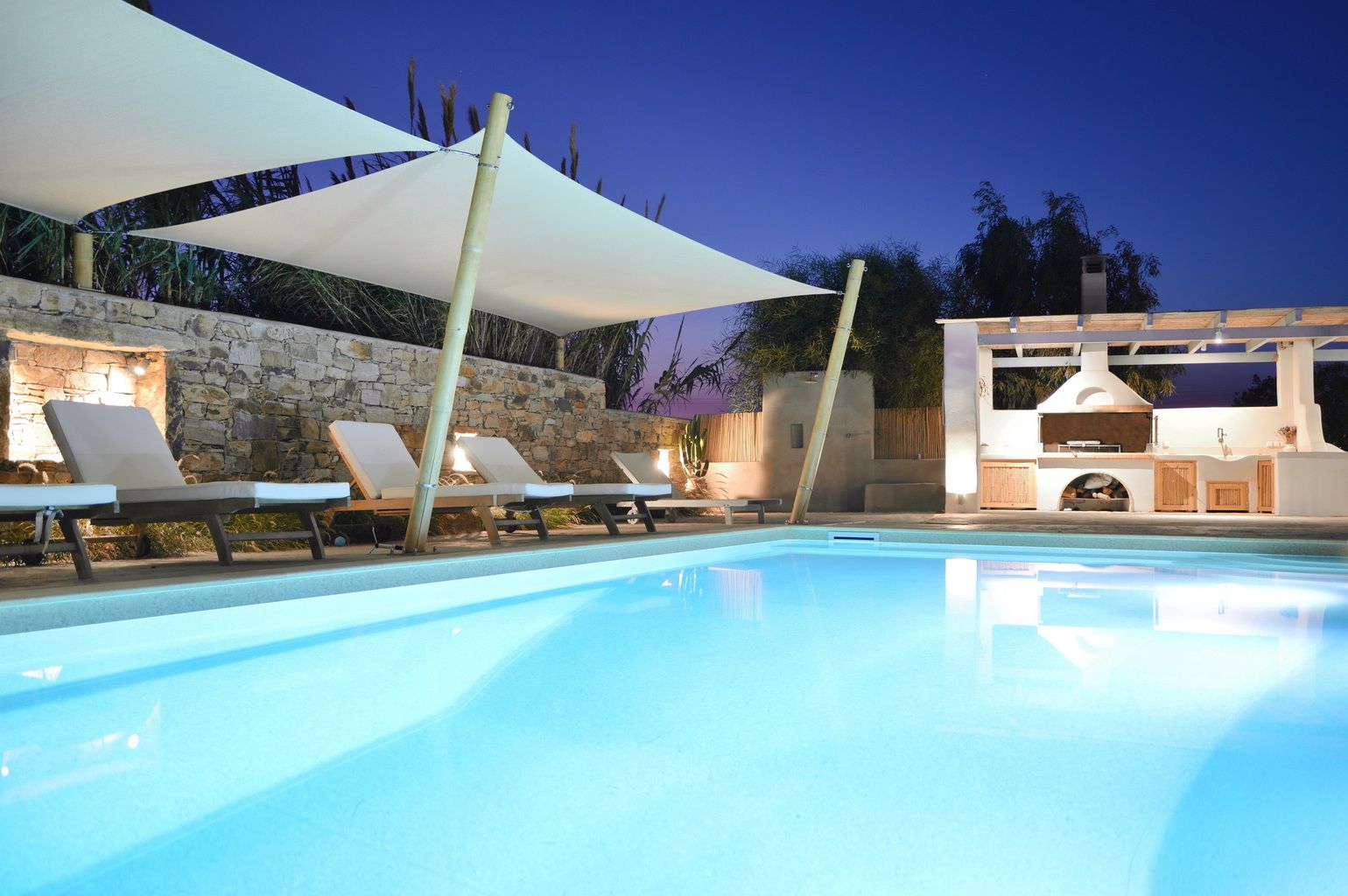 A beautiful white marble staircase with a handmade steel banister leads to the first floor. The upper level is a more "private" space of the house with a charming luminous master en-suite bedroom and wonderful views of the outside scenery. It's private terrace, overlooking the Aegean Sea is one of the best spots of the house to enjoy in serenity the colorful sunset. The bathroom is designed to offer you maximum relaxation, choosing between a Jacuzzi and a rain forest shower.