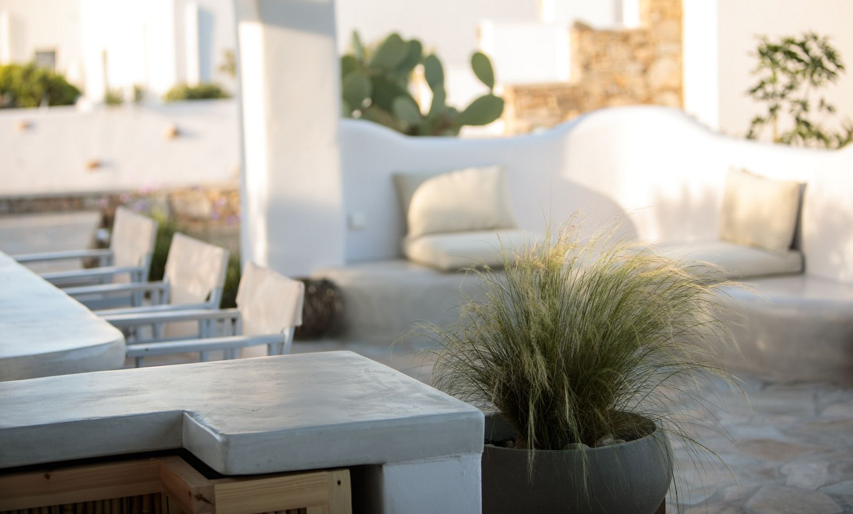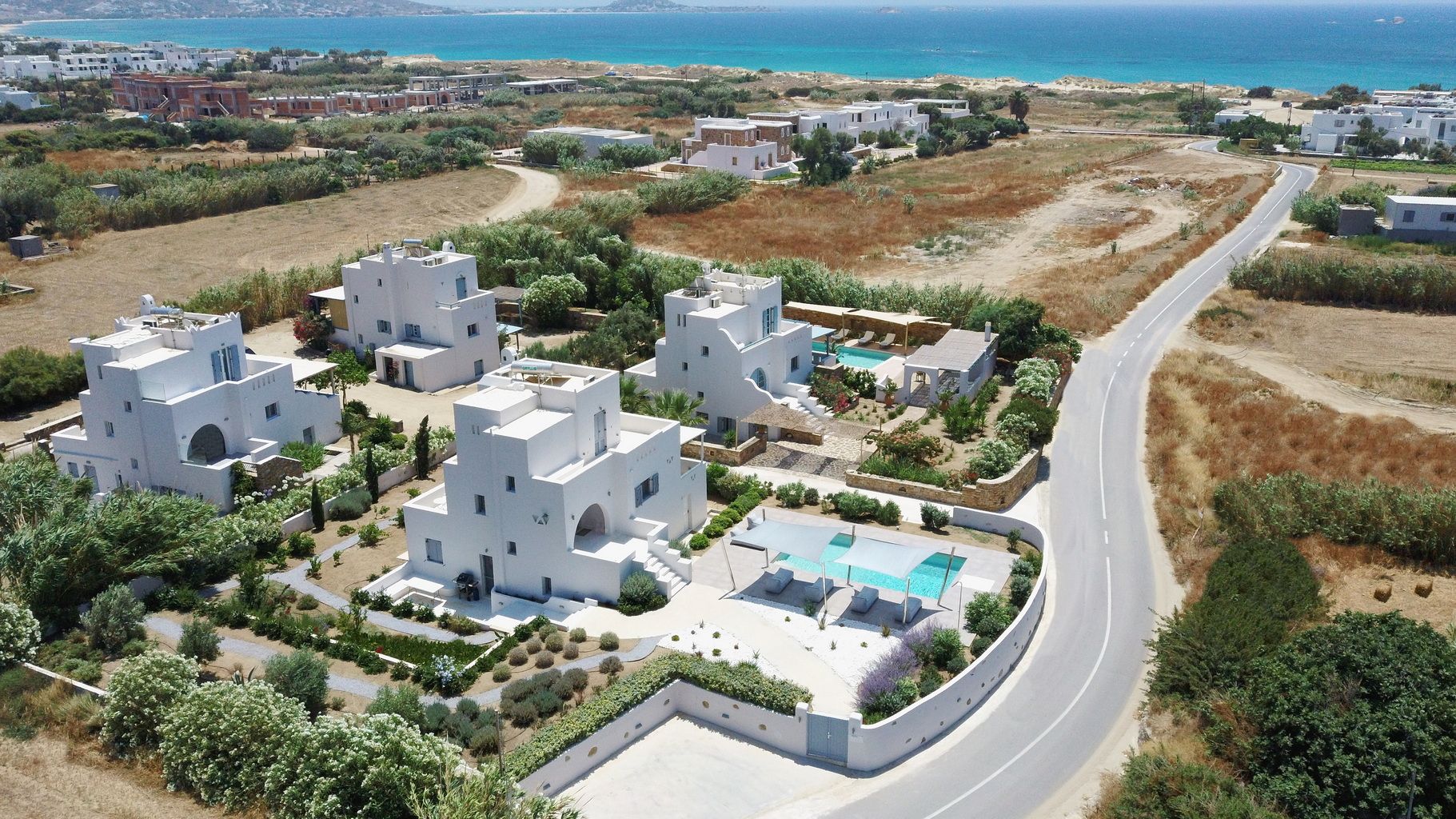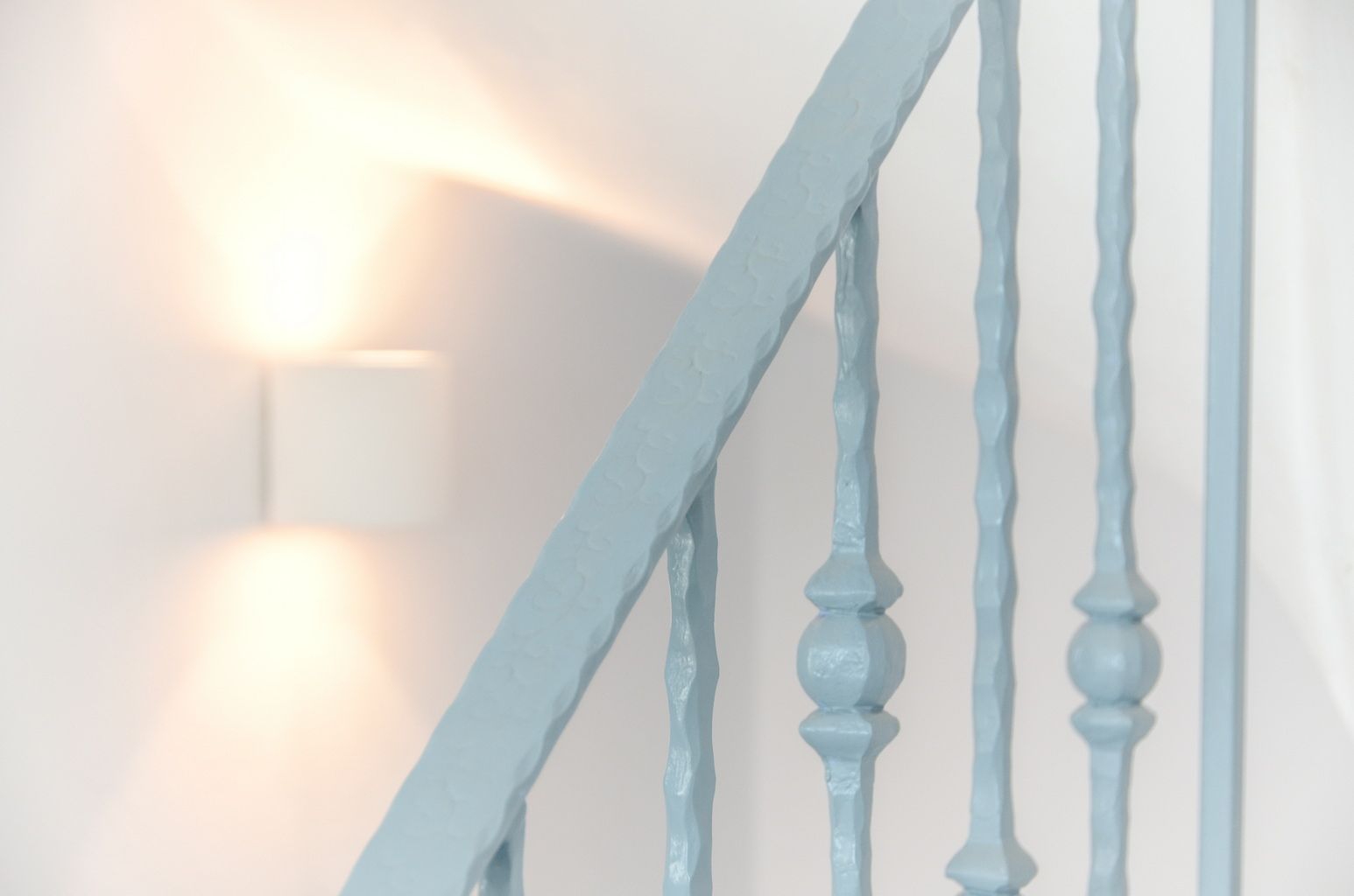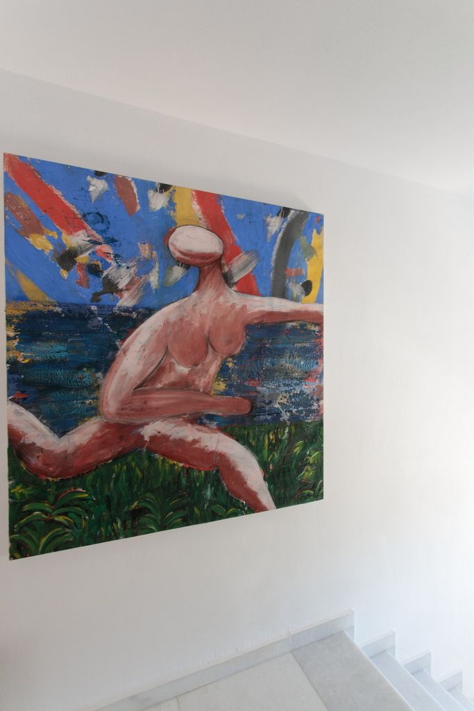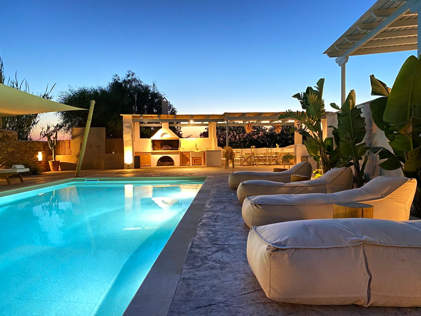 A beautiful white marble staircase with a handmade steel banister leads to the first floor. The upper level is a more "private" space of the house with a charming luminous master en-suite bedroom and wonderful views of the outside scenery. It's private terrace, overlooking the Aegean Sea is one of the best spots of the house to enjoy in serenity the colorful sunset. The bathroom is designed to offer you maximum relaxation, choosing between a Jacuzzi and a rain forest shower.