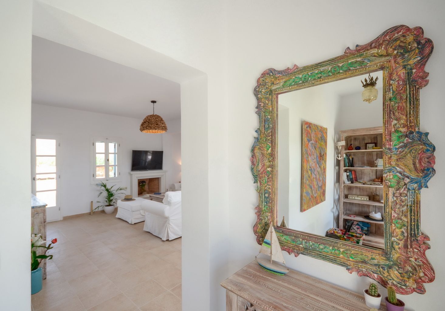 Entering through the hall you encounter an open lounge area equipped with big flat screen TV and Bluetooth audio system. The living room is bright and cozy, decorated with sophisticated simplicity featuring a charming hand-carved marble fireplace. A fully equipped open plan kitchen serves either the adjacent dining area with its traditional furnishing or the outdoors front shaded Veranda, perfect to enjoy your summer mornings, evenings and nights.