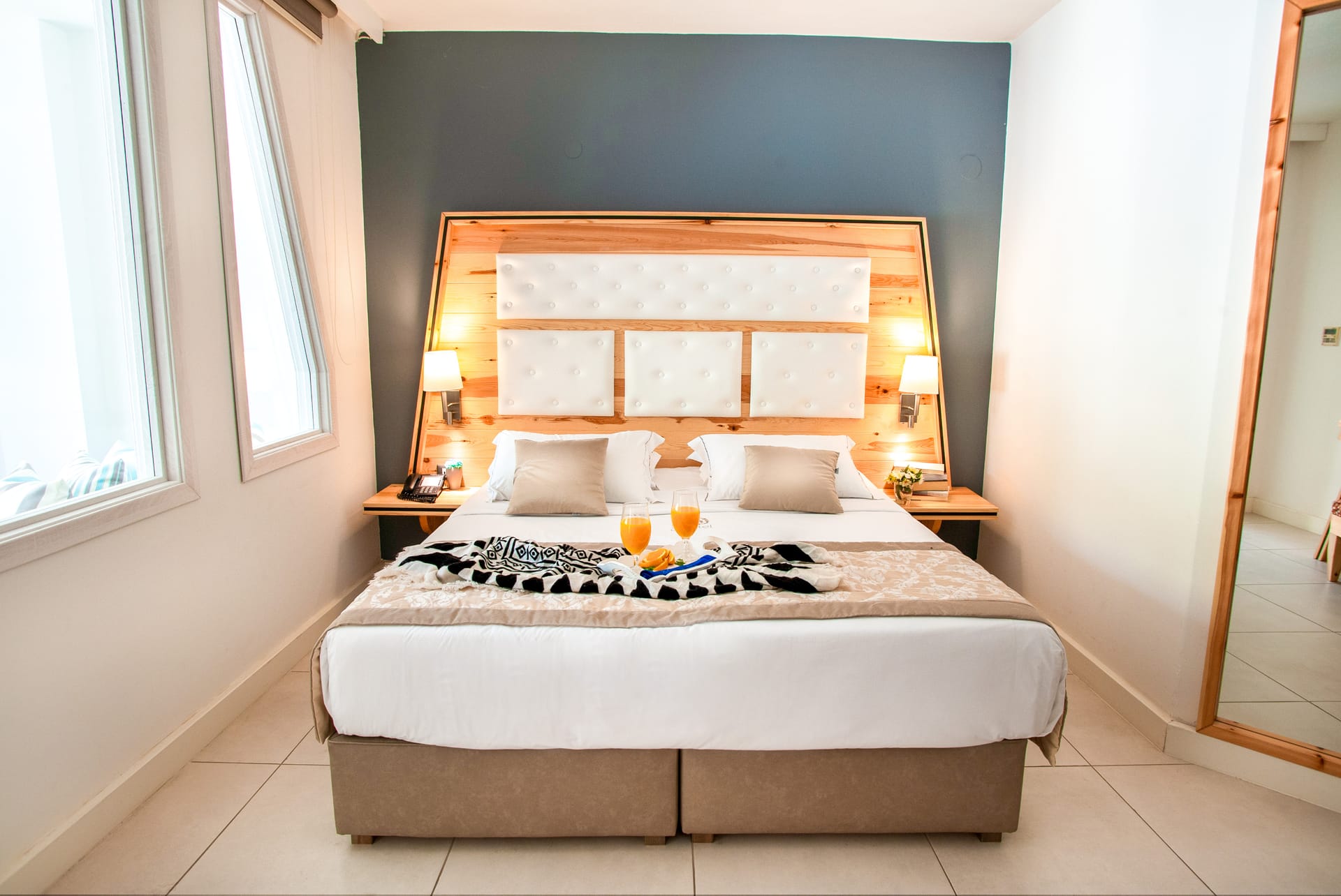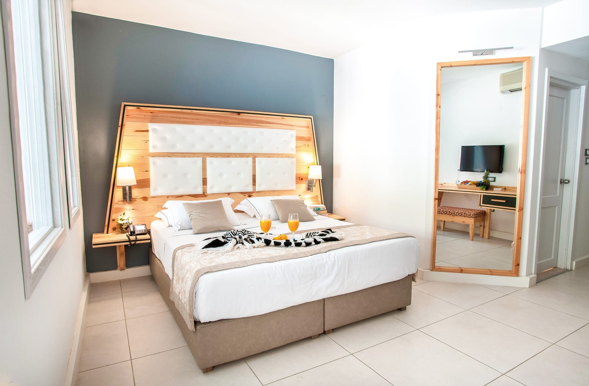 Suite Front pool: 38 sqm with terrace or balcony, 1 Bedroom & 1 Living room, minibar, telephone, 2 Sat Tvs, 2 A/C,1 matrimorial bed 150 cm, sofa as Double Bed, bathroom with shower (Hydromassage) and hairdryer.
