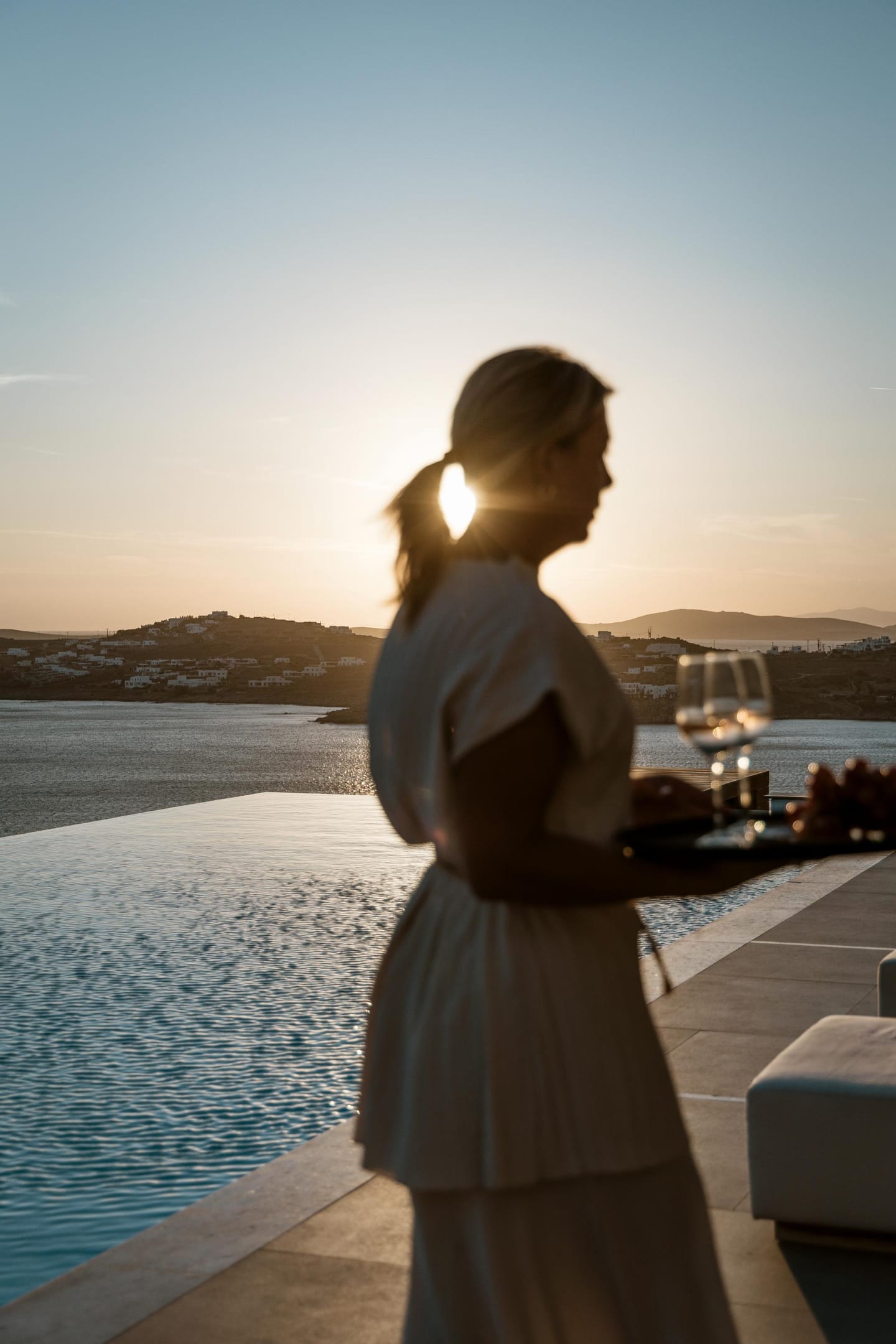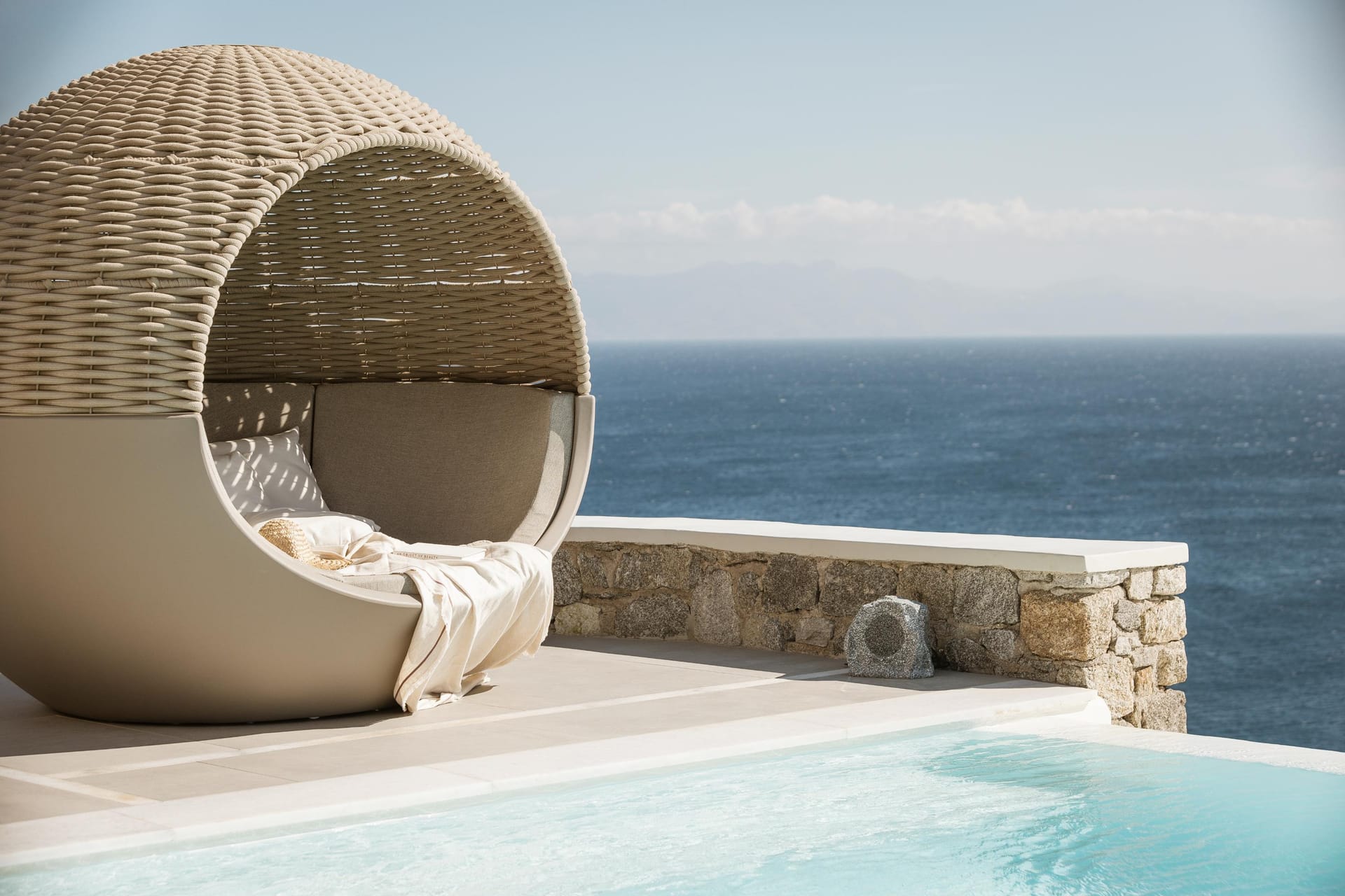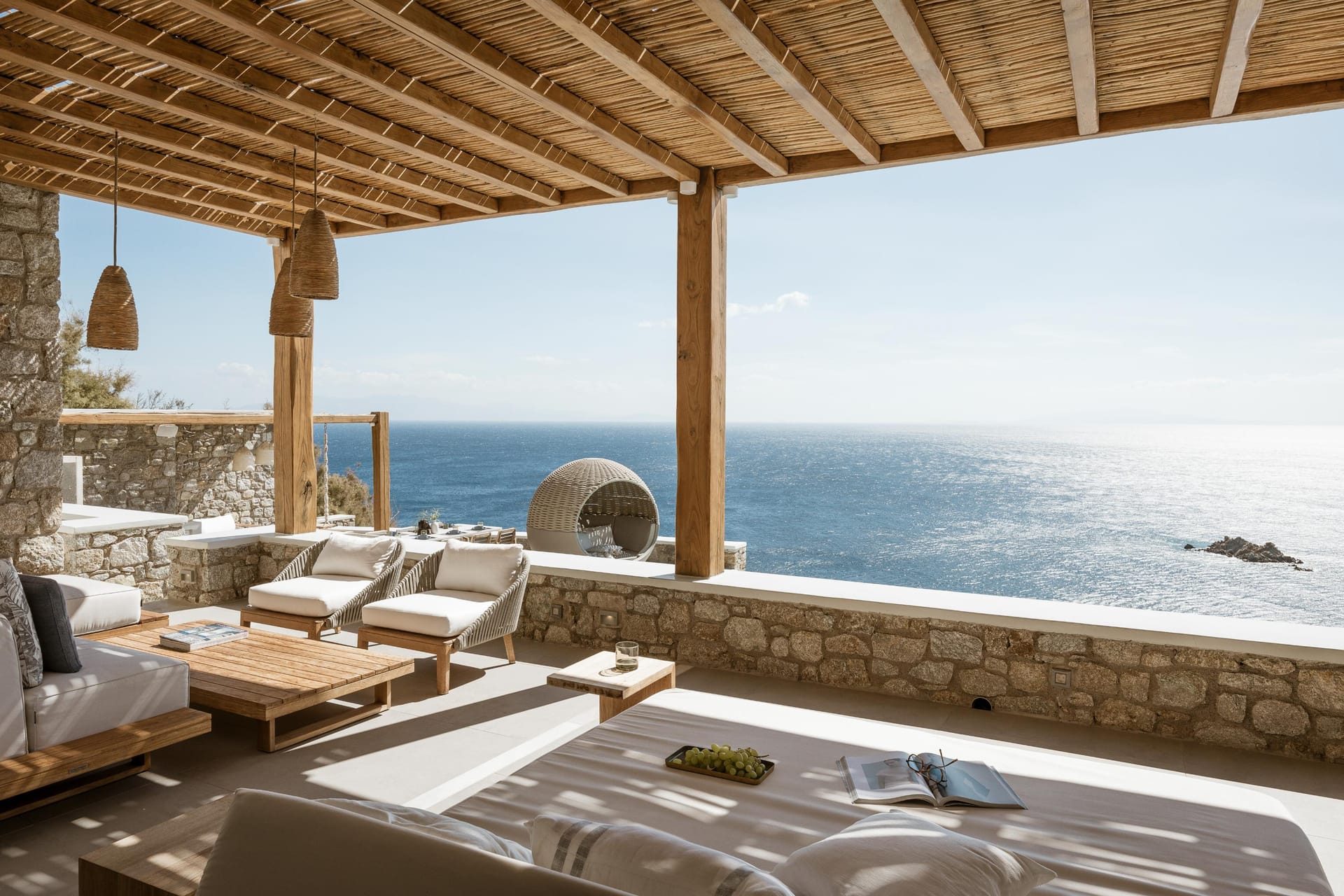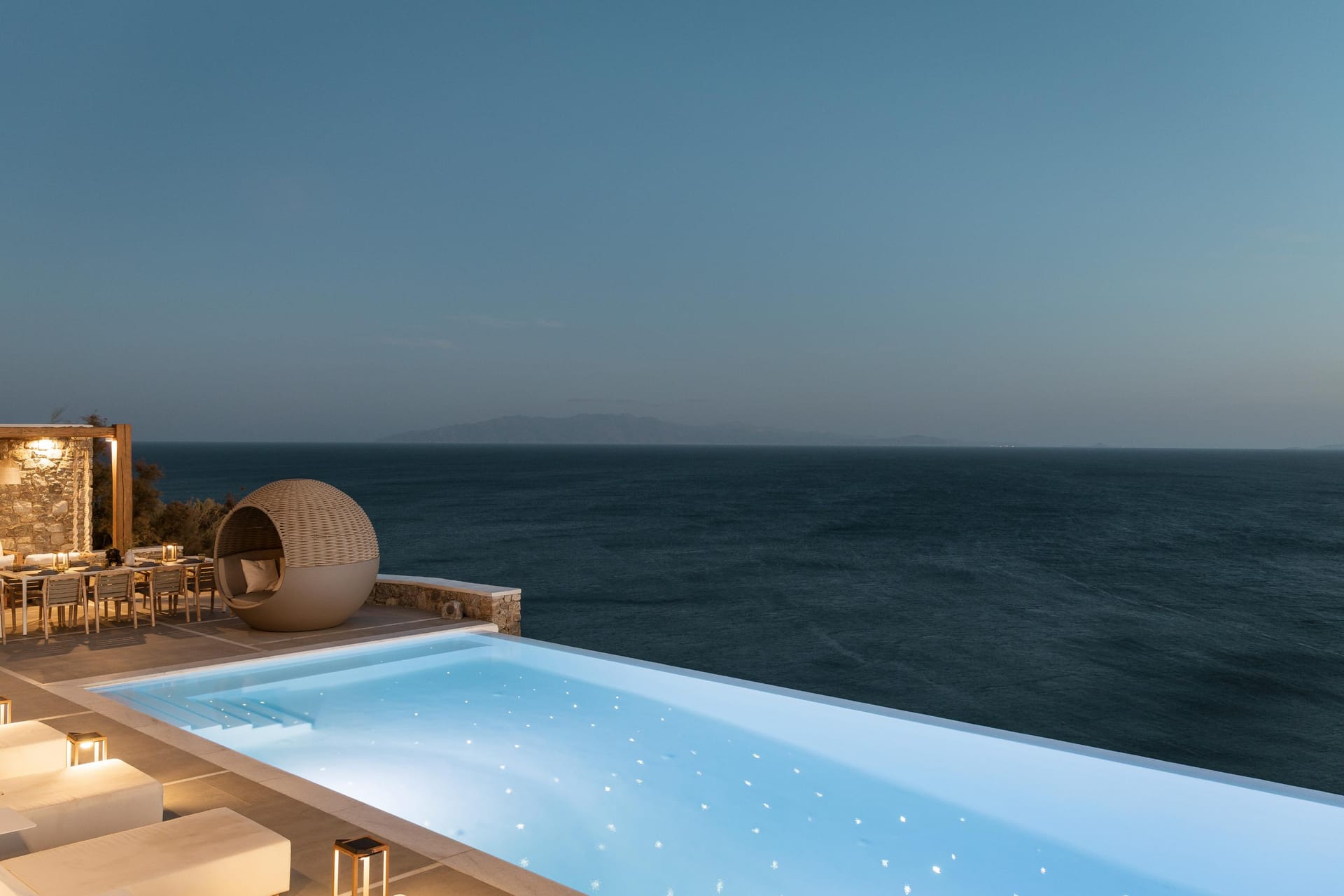 In ancient Greek mythology Nefeli, the intoxicating nymph, was worshiped as the goddess of the clouds, and hospitality. Villa Neféli is the epitome of Greek hospitality, an exhilarate property envisioned under a driving idea of creating an exclusive haven that will become a destination of its own. The alluring villa invites its refined guests to embark on an indulging journey of seductive natural beauty and sublime luxury. Laying gracefully over a generous plot of approximately 2000 square meters on an imposing cliff, Villa Neféli reveals to its most exclusive guests a one-of-a-kind, breath-taking view to the crystal blue waters of the Aegean Sea and the vibrant colors of the sunrise and sunset. Located in the area of Agios Lazaros neighboring to the most fashionable beach of the island (Psarou) and only 4 km away from the cosmopolitan Mykonos town, Villa Neféli enjoys the pulsating ambience of a celebrated destination while benefiting from the tranquil privacy offered by the property’s select prime location.