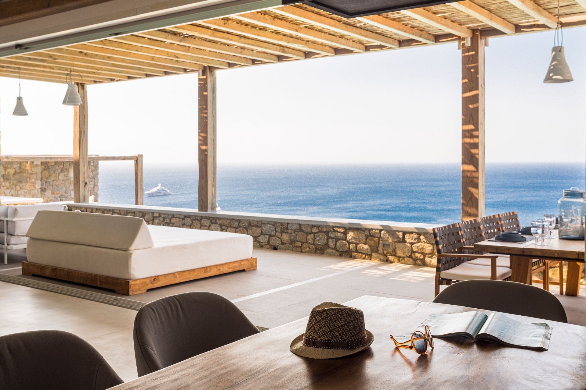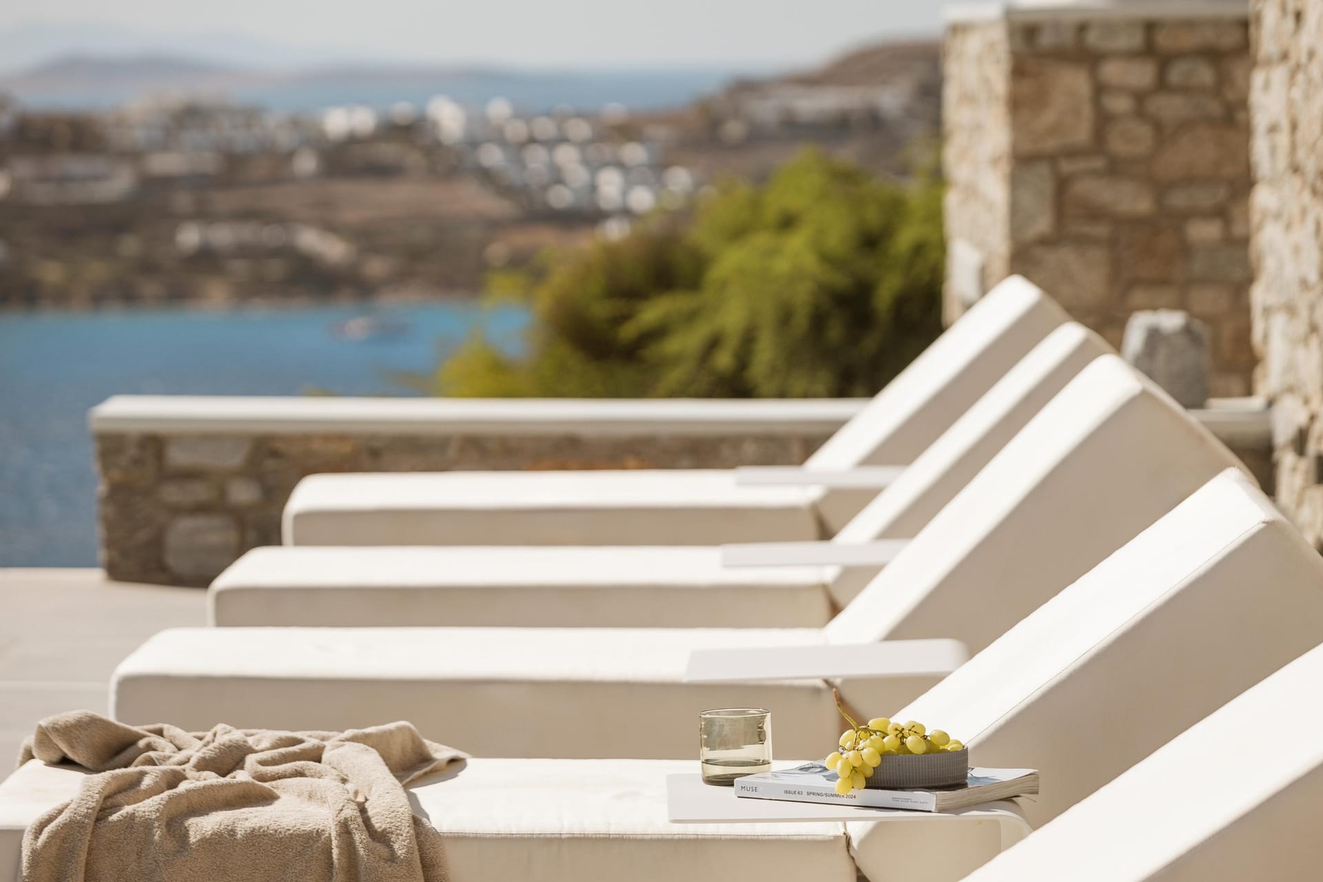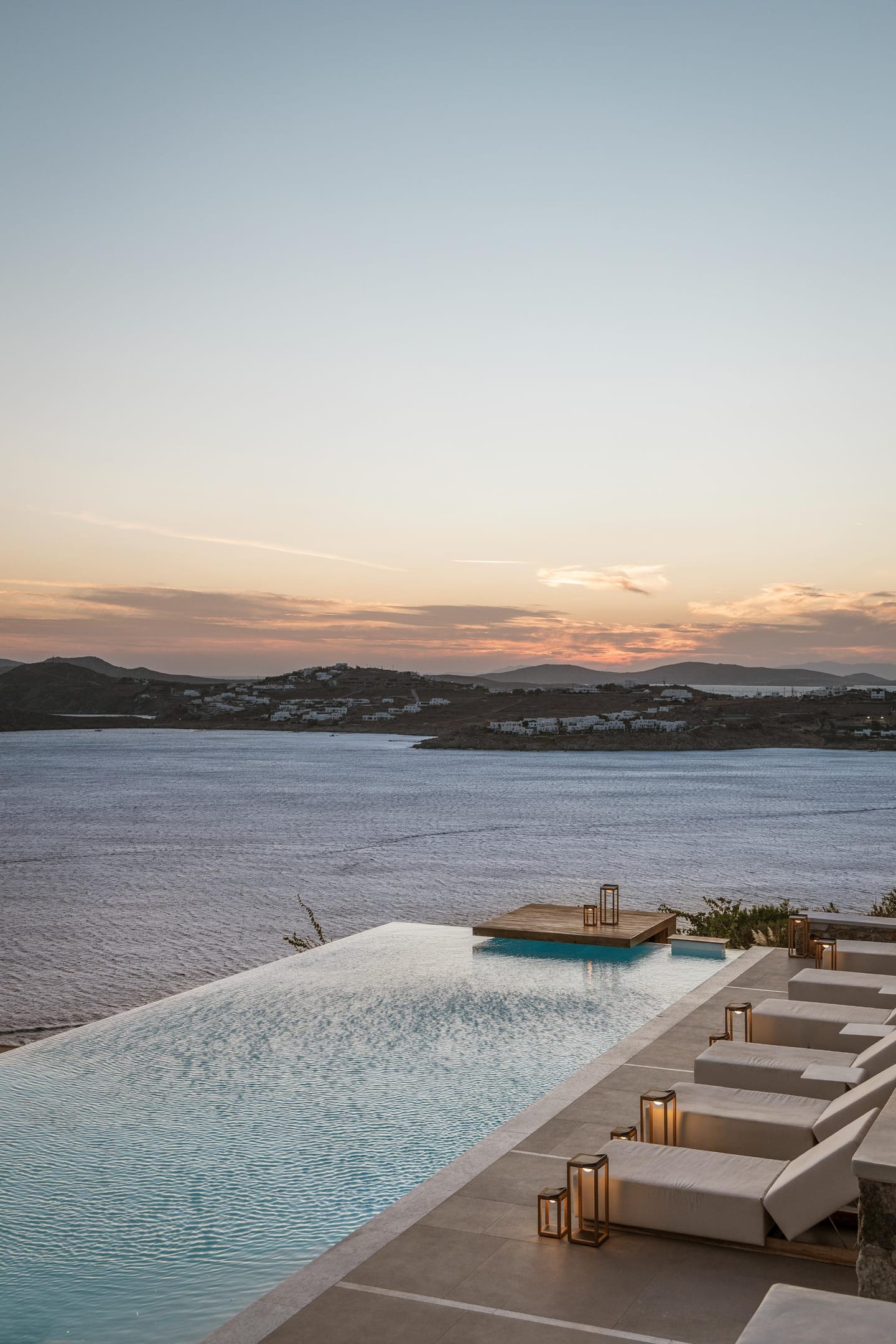 In ancient Greek mythology Nefeli, the intoxicating nymph, was worshiped as the goddess of the clouds, and hospitality. Villa Neféli is the epitome of Greek hospitality, an exhilarate property envisioned under a driving idea of creating an exclusive haven that will become a destination of its own. The alluring villa invites its refined guests to embark on an indulging journey of seductive natural beauty and sublime luxury. Laying gracefully over a generous plot of approximately 2000 square meters on an imposing cliff, Villa Neféli reveals to its most exclusive guests a one-of-a-kind, breath-taking view to the crystal blue waters of the Aegean Sea and the vibrant colors of the sunrise and sunset. Located in the area of Agios Lazaros neighboring to the most fashionable beach of the island (Psarou) and only 4 km away from the cosmopolitan Mykonos town, Villa Neféli enjoys the pulsating ambience of a celebrated destination while benefiting from the tranquil privacy offered by the property’s select prime location.