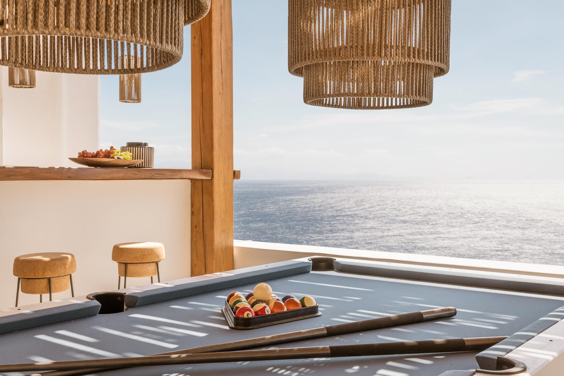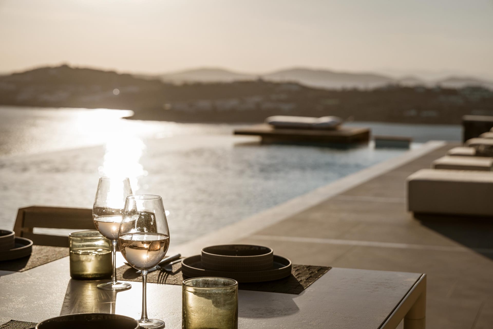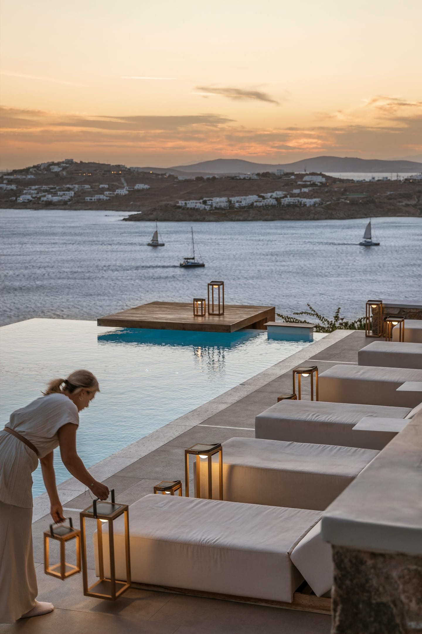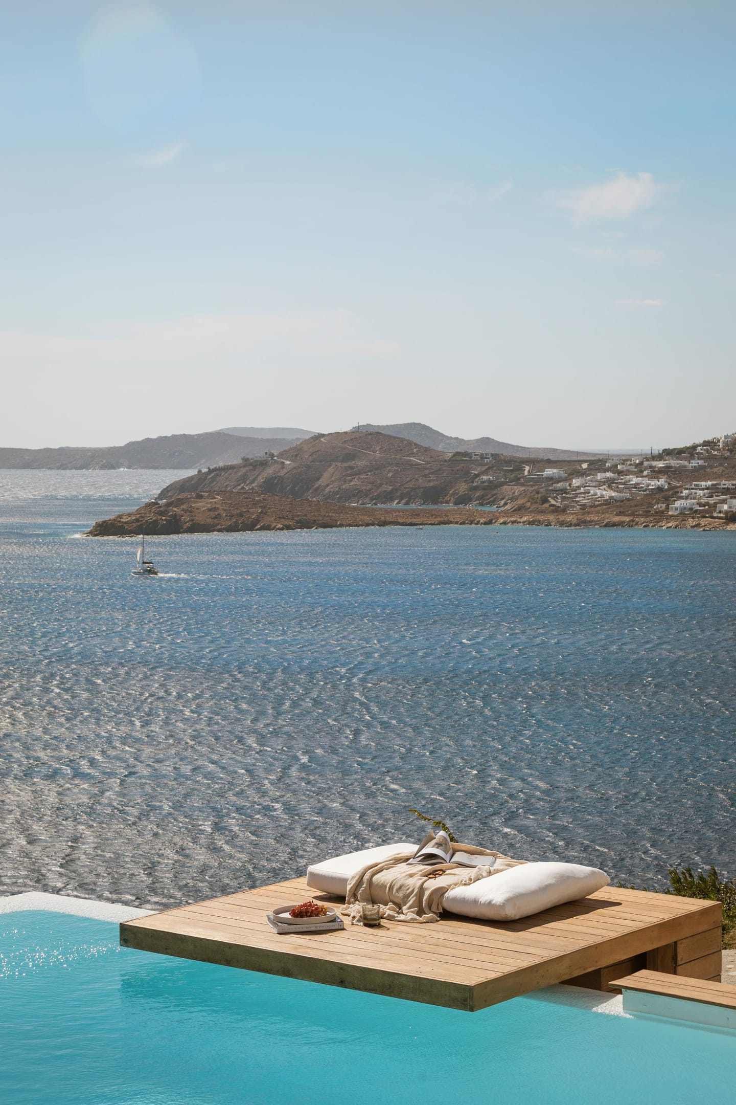 In ancient Greek mythology Nefeli, the intoxicating nymph, was worshiped as the goddess of the clouds, and hospitality. Villa Neféli is the epitome of Greek hospitality, an exhilarate property envisioned under a driving idea of creating an exclusive haven that will become a destination of its own. The alluring villa invites its refined guests to embark on an indulging journey of seductive natural beauty and sublime luxury. Laying gracefully over a generous plot of approximately 2000 square meters on an imposing cliff, Villa Neféli reveals to its most exclusive guests a one-of-a-kind, breath-taking view to the crystal blue waters of the Aegean Sea and the vibrant colors of the sunrise and sunset. Located in the area of Agios Lazaros neighboring to the most fashionable beach of the island (Psarou) and only 4 km away from the cosmopolitan Mykonos town, Villa Neféli enjoys the pulsating ambience of a celebrated destination while benefiting from the tranquil privacy offered by the property’s select prime location.
