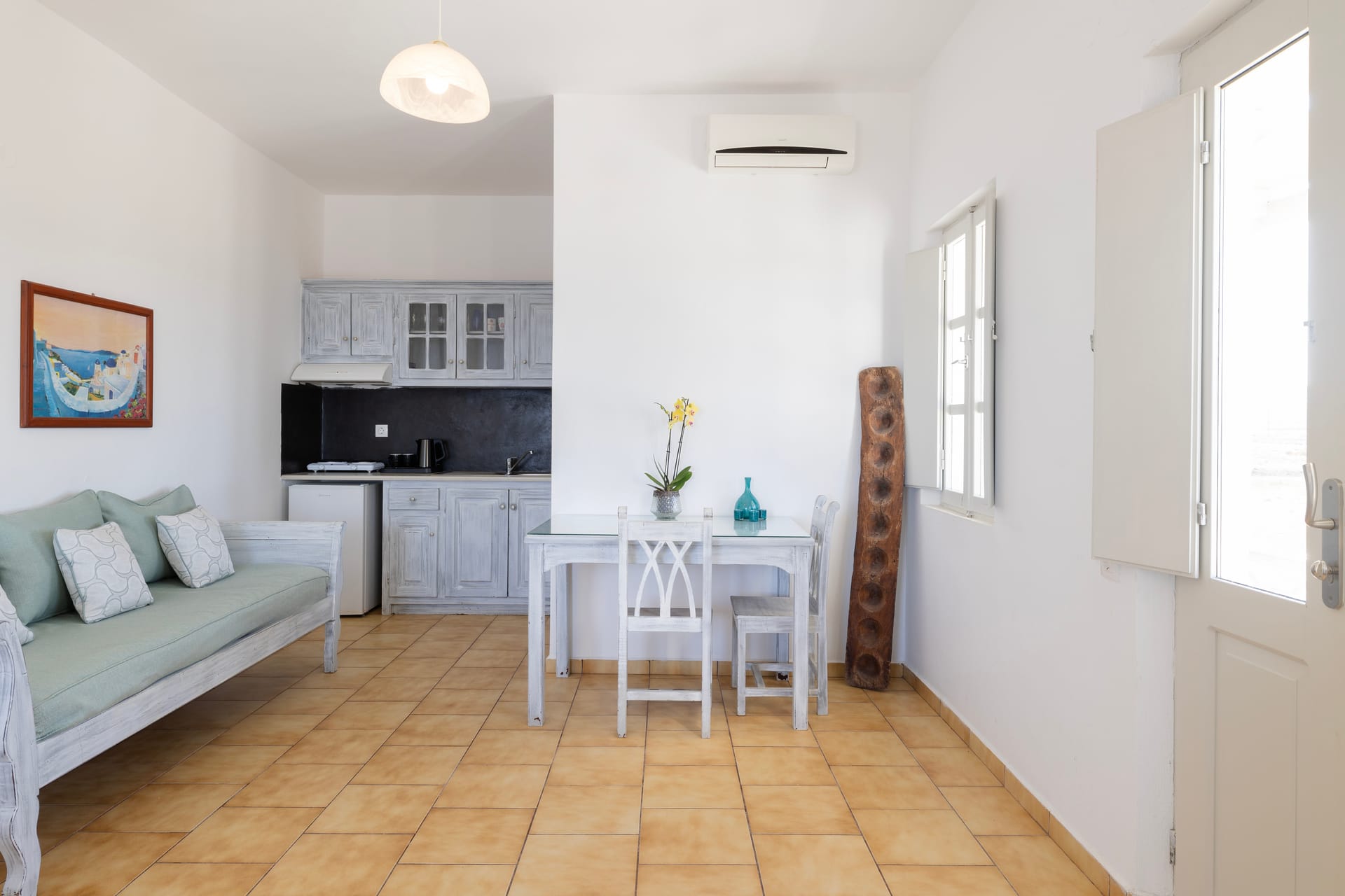 Spacious studio of 55m2 with Aegean traditional ambiance made with the typical style of Santorini. All studios have balcony or terrace, are air-conditioned, have wooden furnishings and are equipped with TV, kitchenette and refrigerator. The furnished private balconies offer scenic views of the Aegean Sea.
