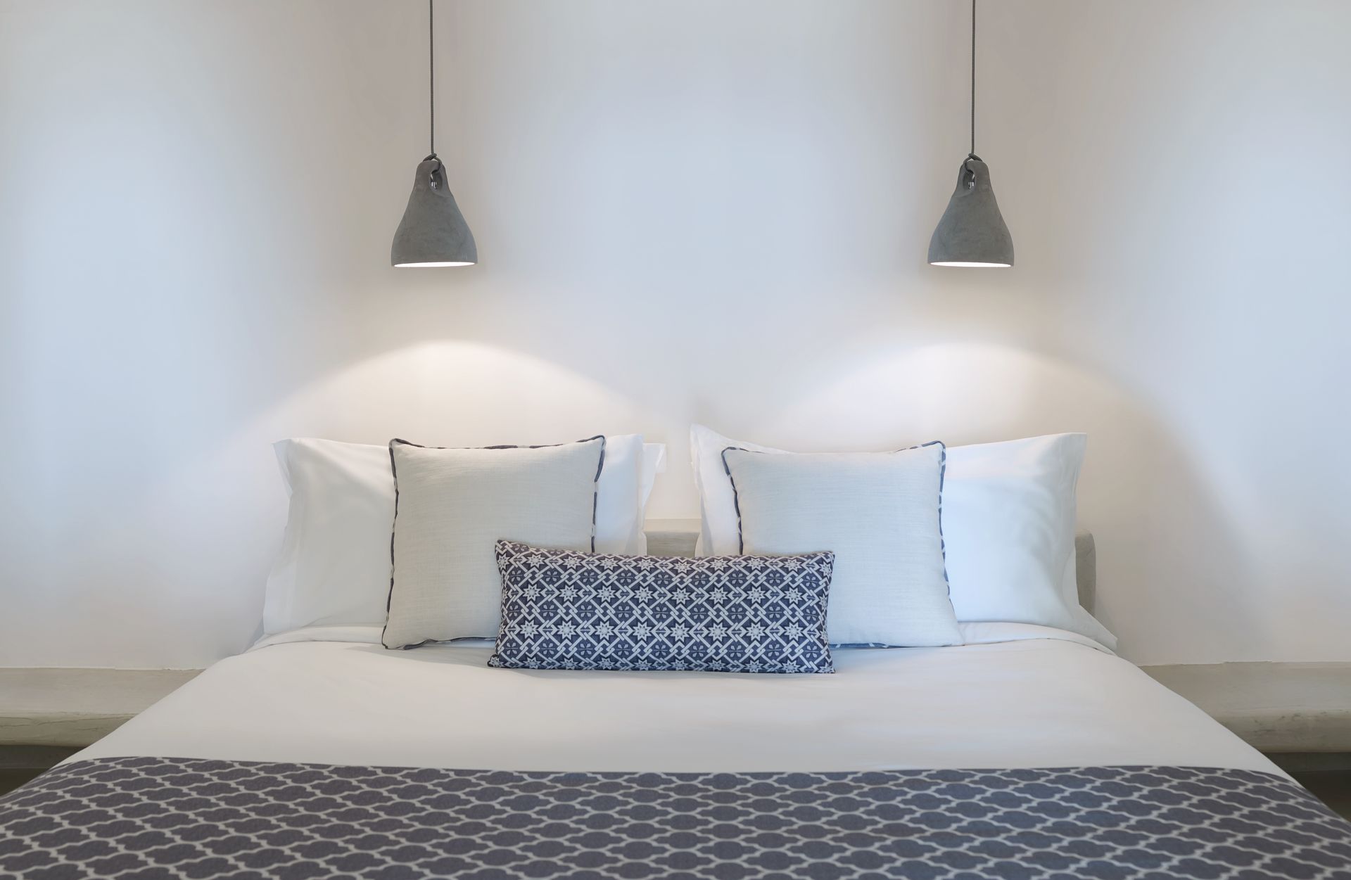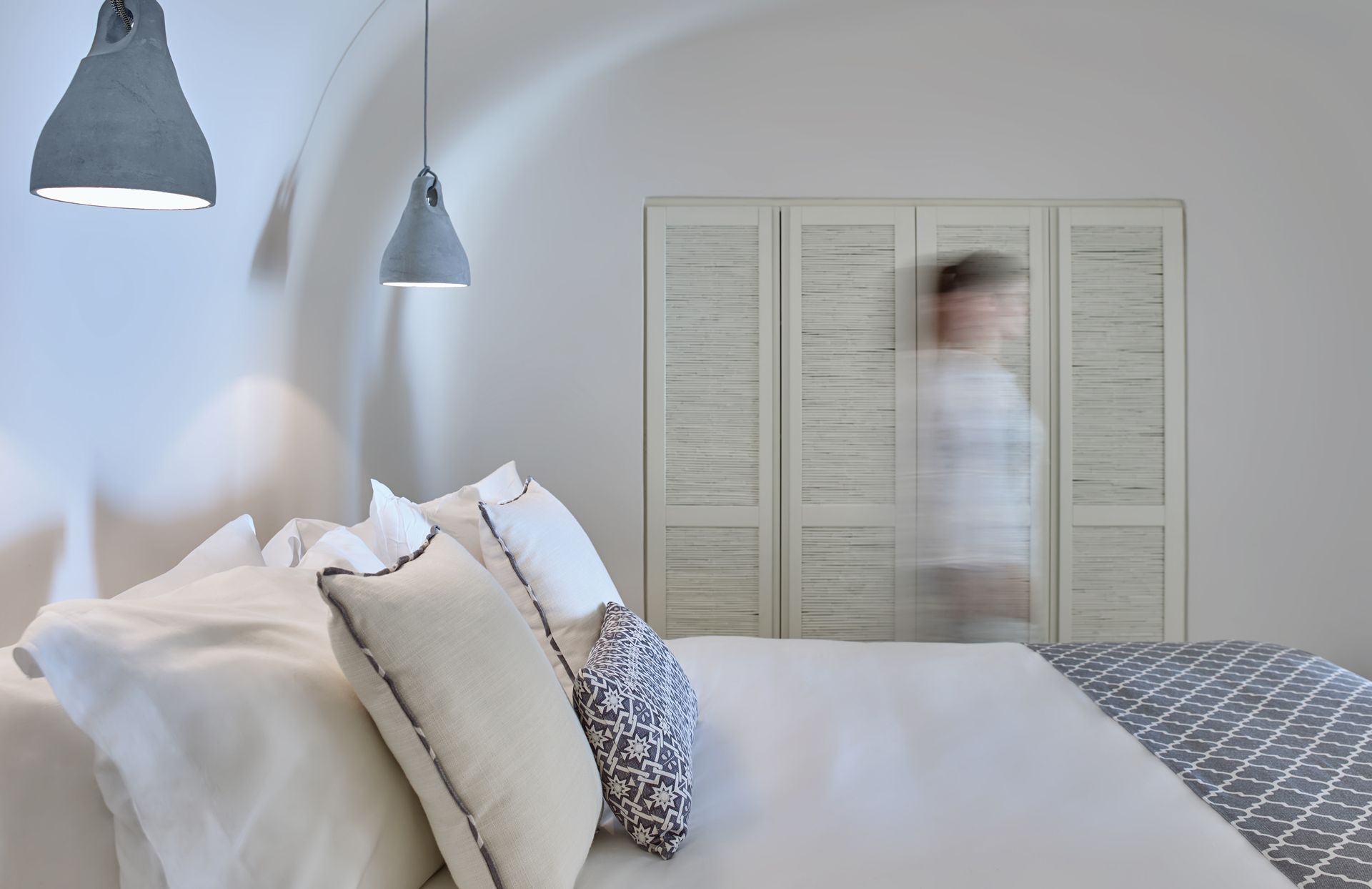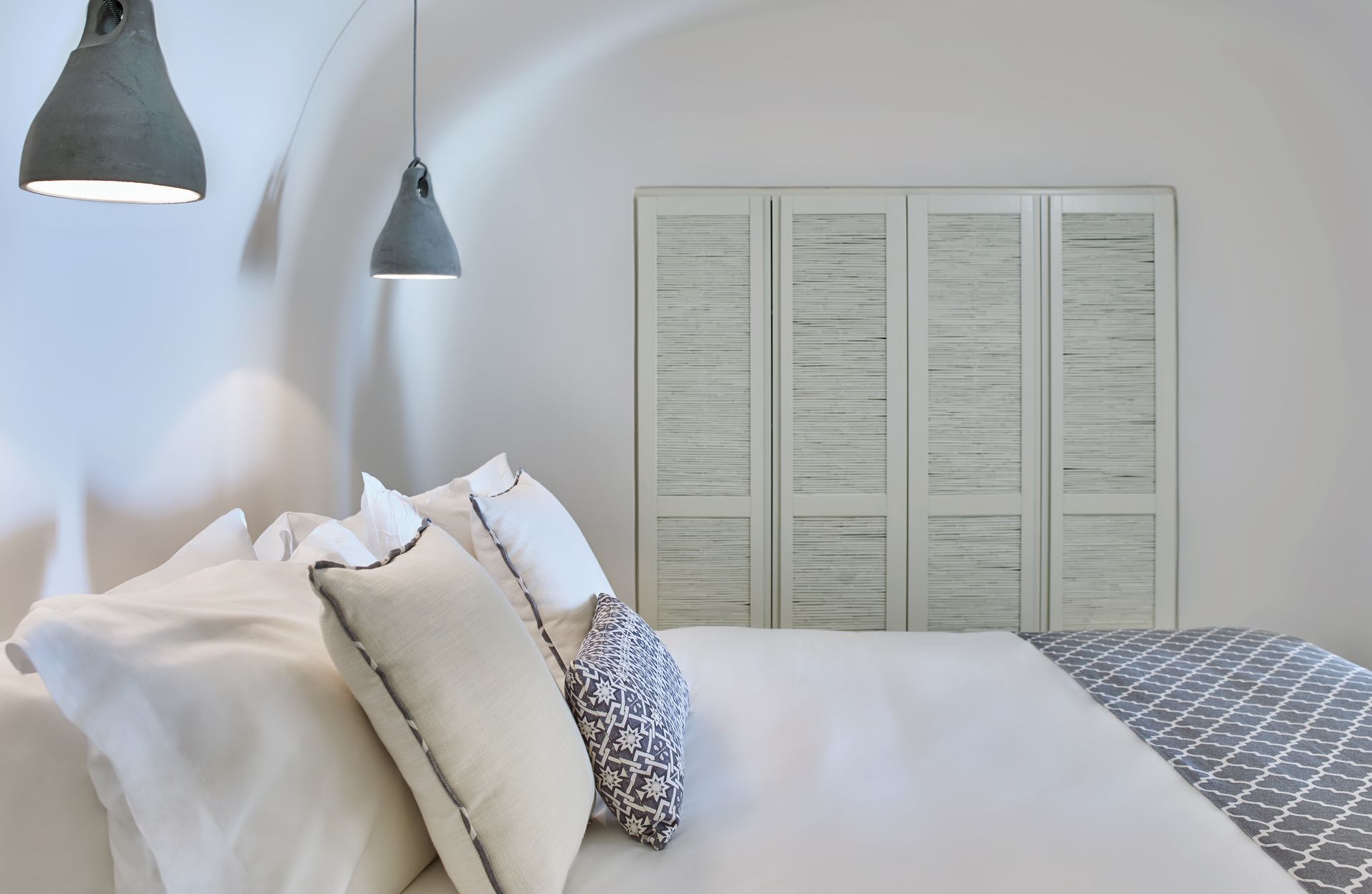 The bedroom is separated by an arch, a typical architectural element of Santorini, and has a king-size bed. The bathroom includes a large bathtub and a shower.