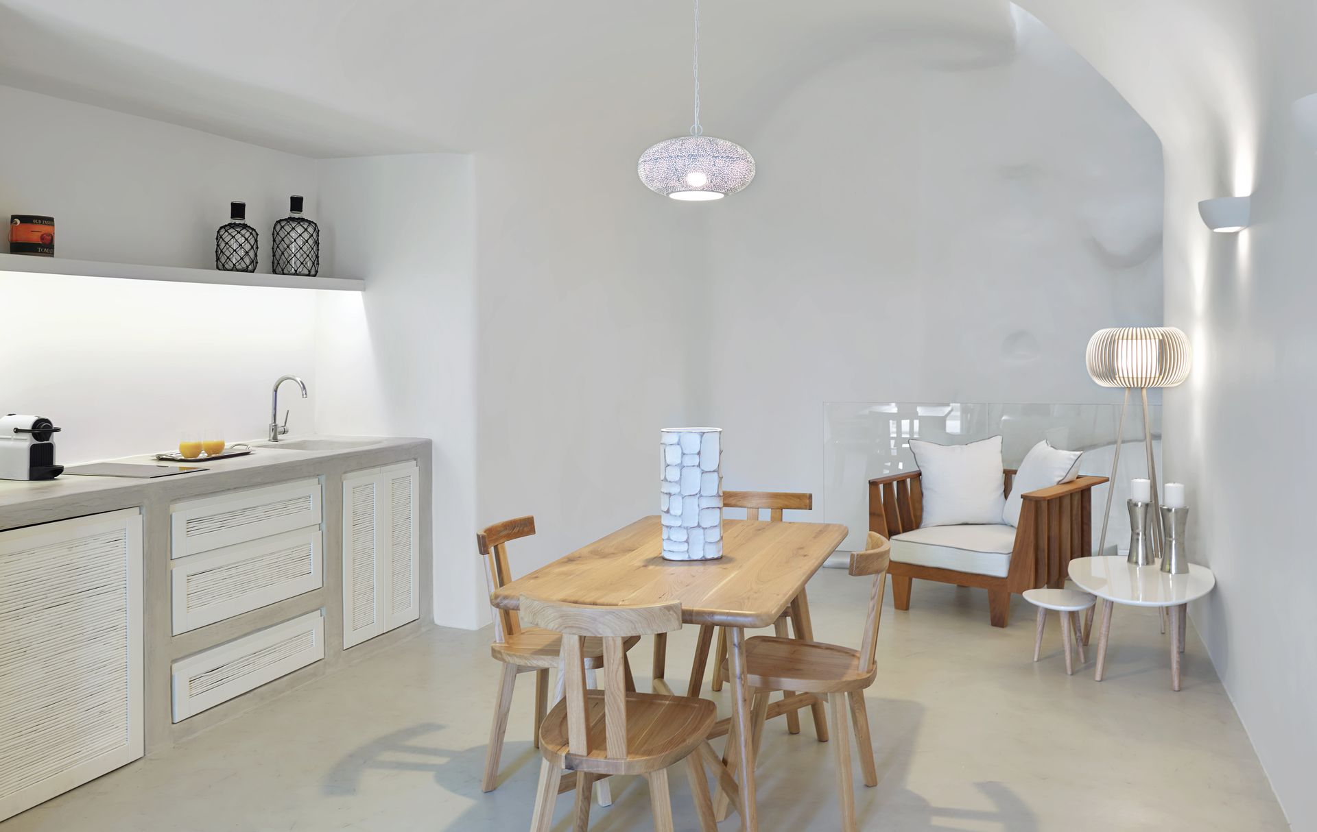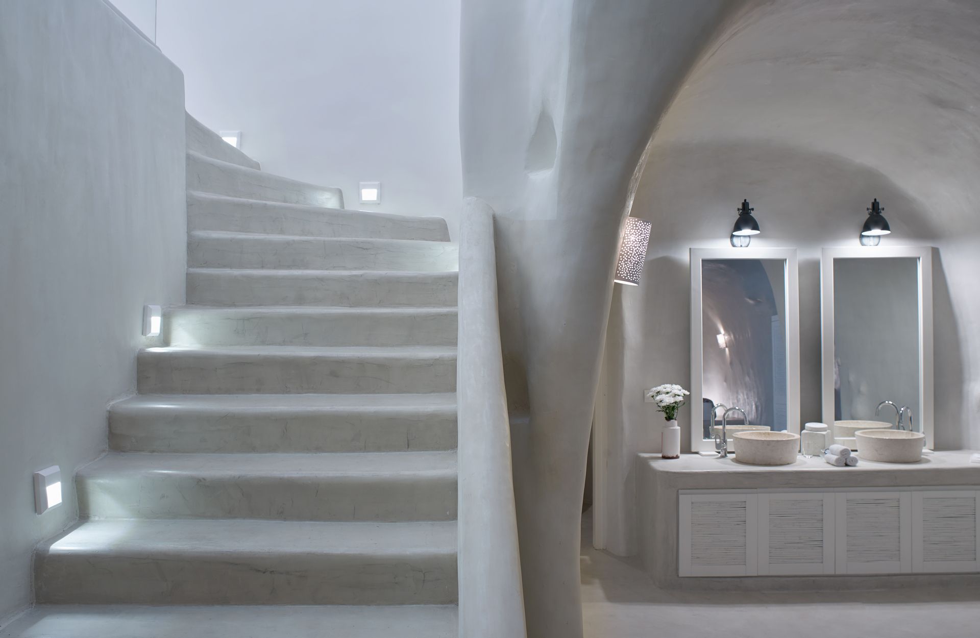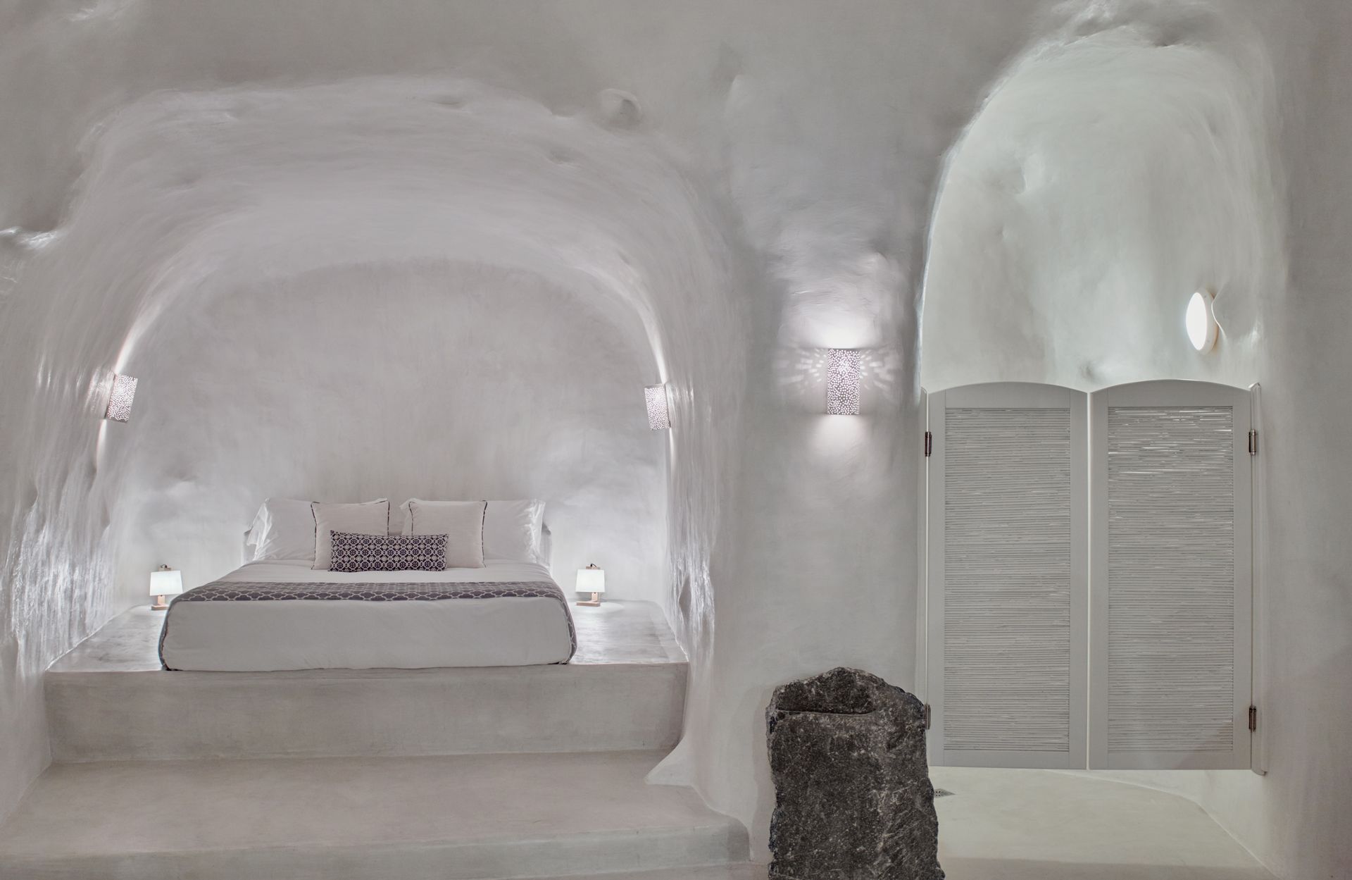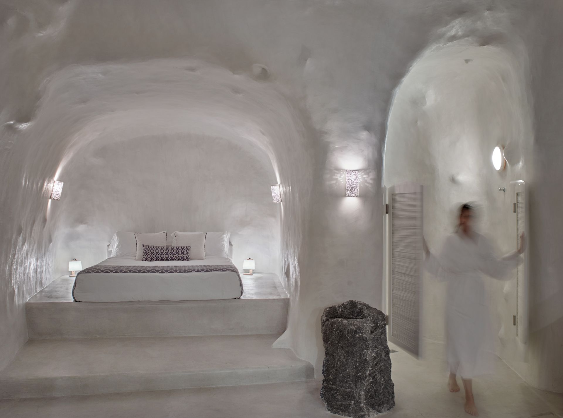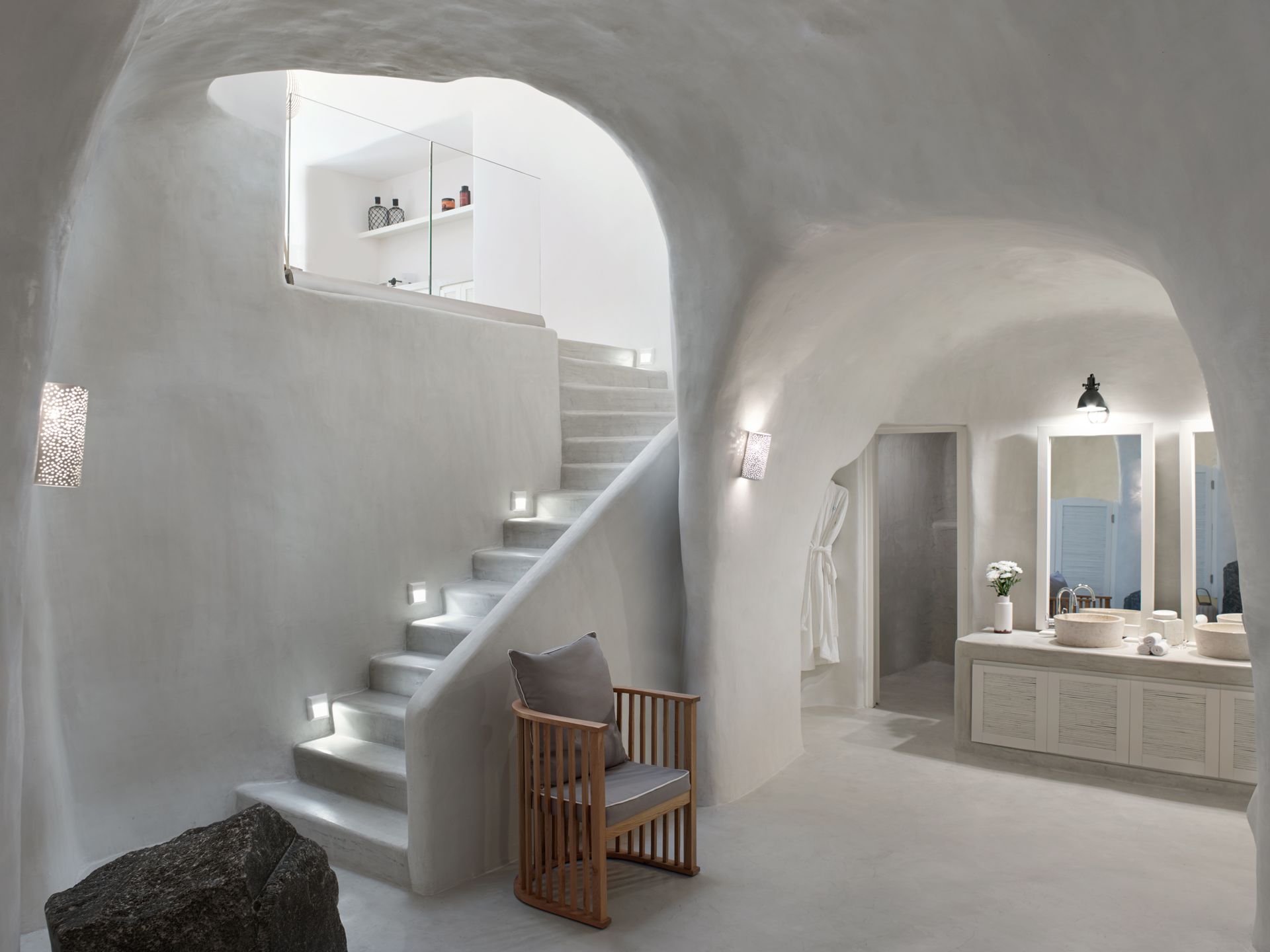 The upper floor features an airy living and dining area and a fully equipped kitchenette. The lower floor features a dramatic cave-style bedroom with a king-size bed and a uniquely designed en-suite bathroom with a spacious shower.