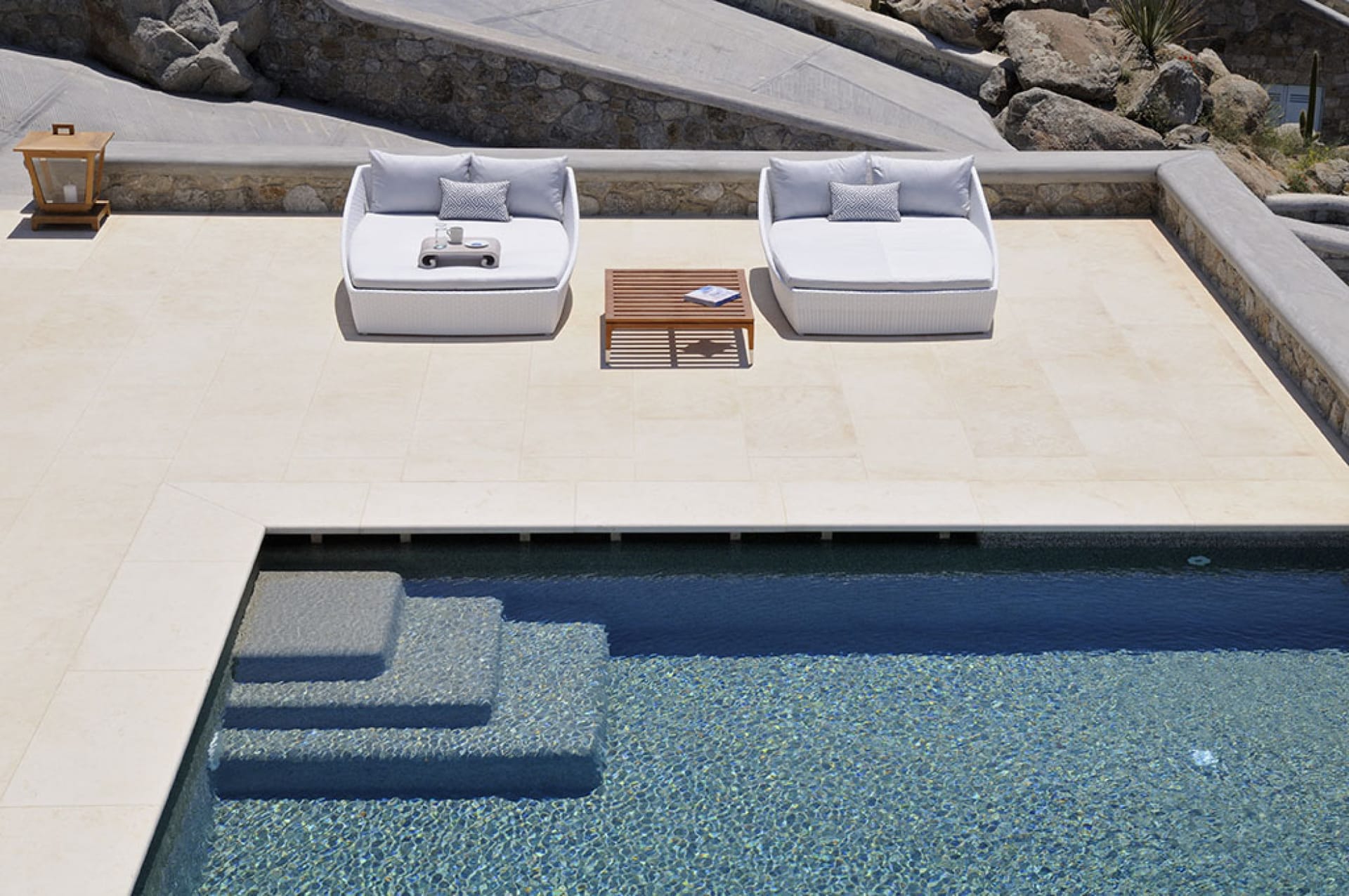 The stunning views of Delos and Rhenia are perfectly matched by whitewashed architectural elements and natural stone walls. The built-in dining area and lounge offers an inviting respite as the dappled sunlight plays