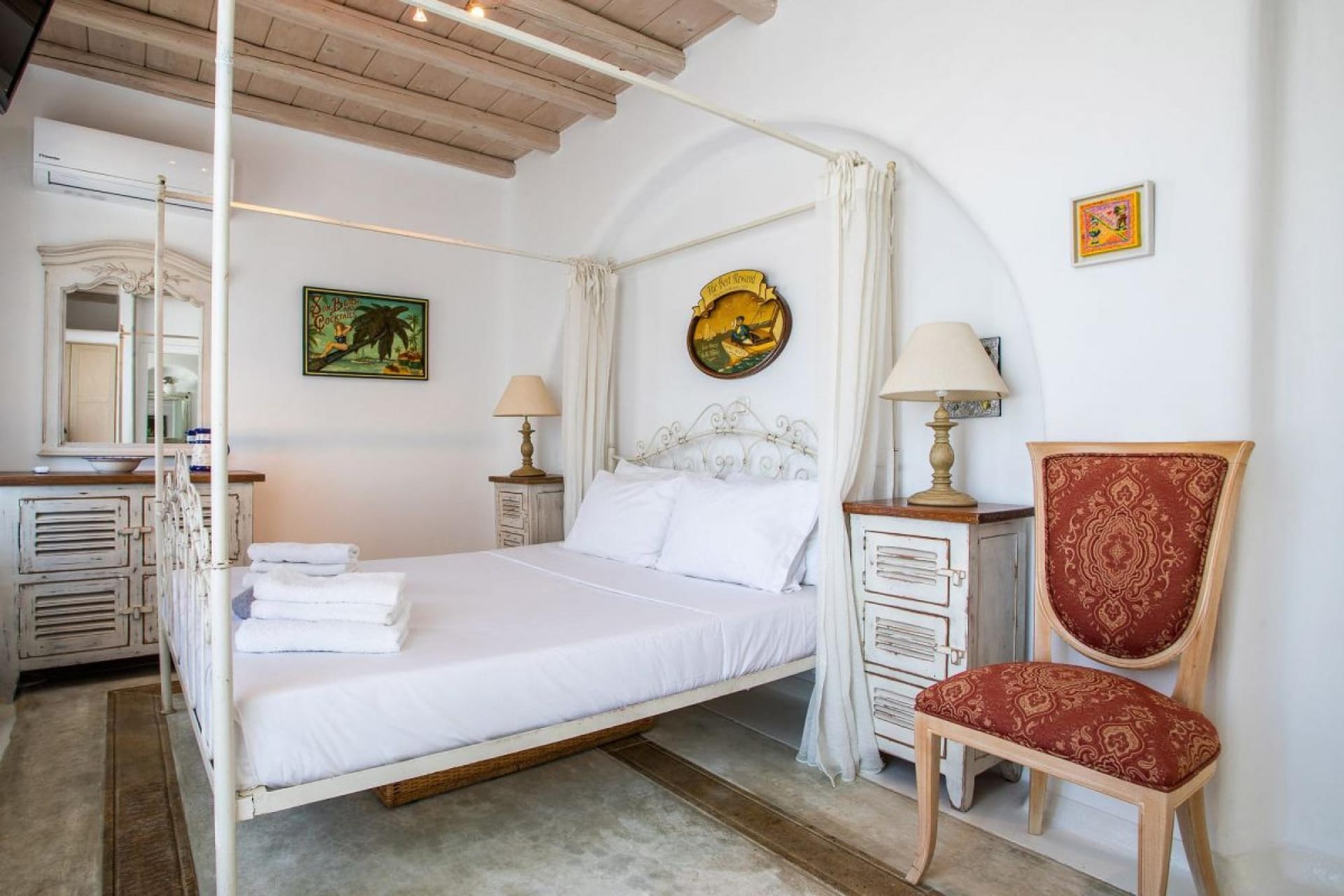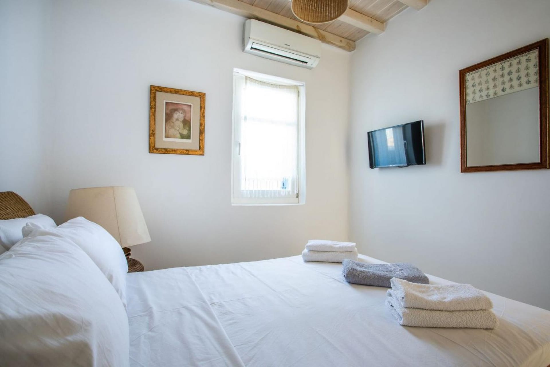 Upper level: One master bedroom with king size bed, en-suite (shower), air conditioning, access to terrace, sea view.