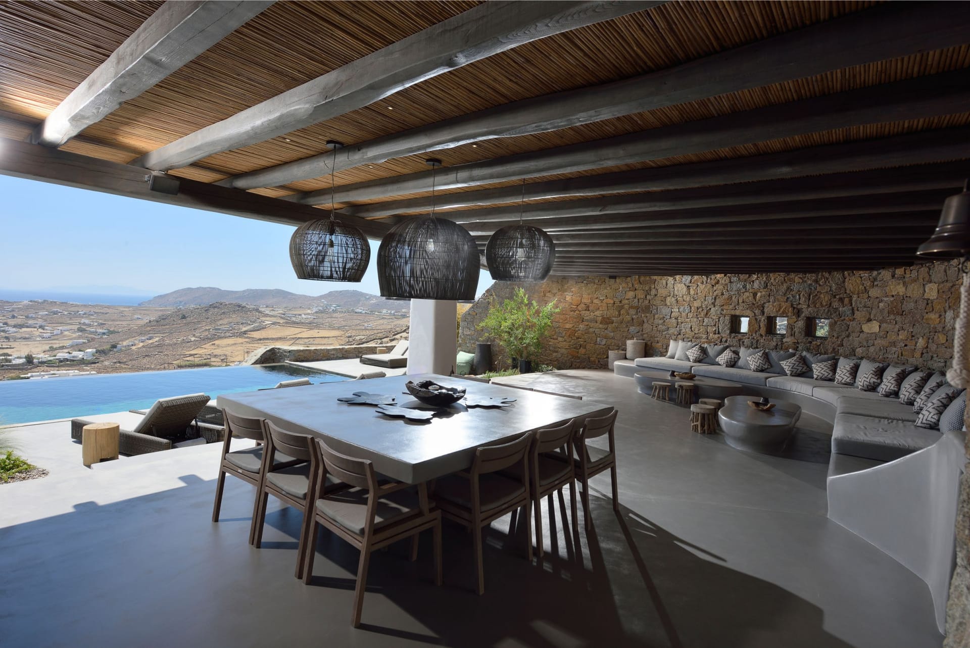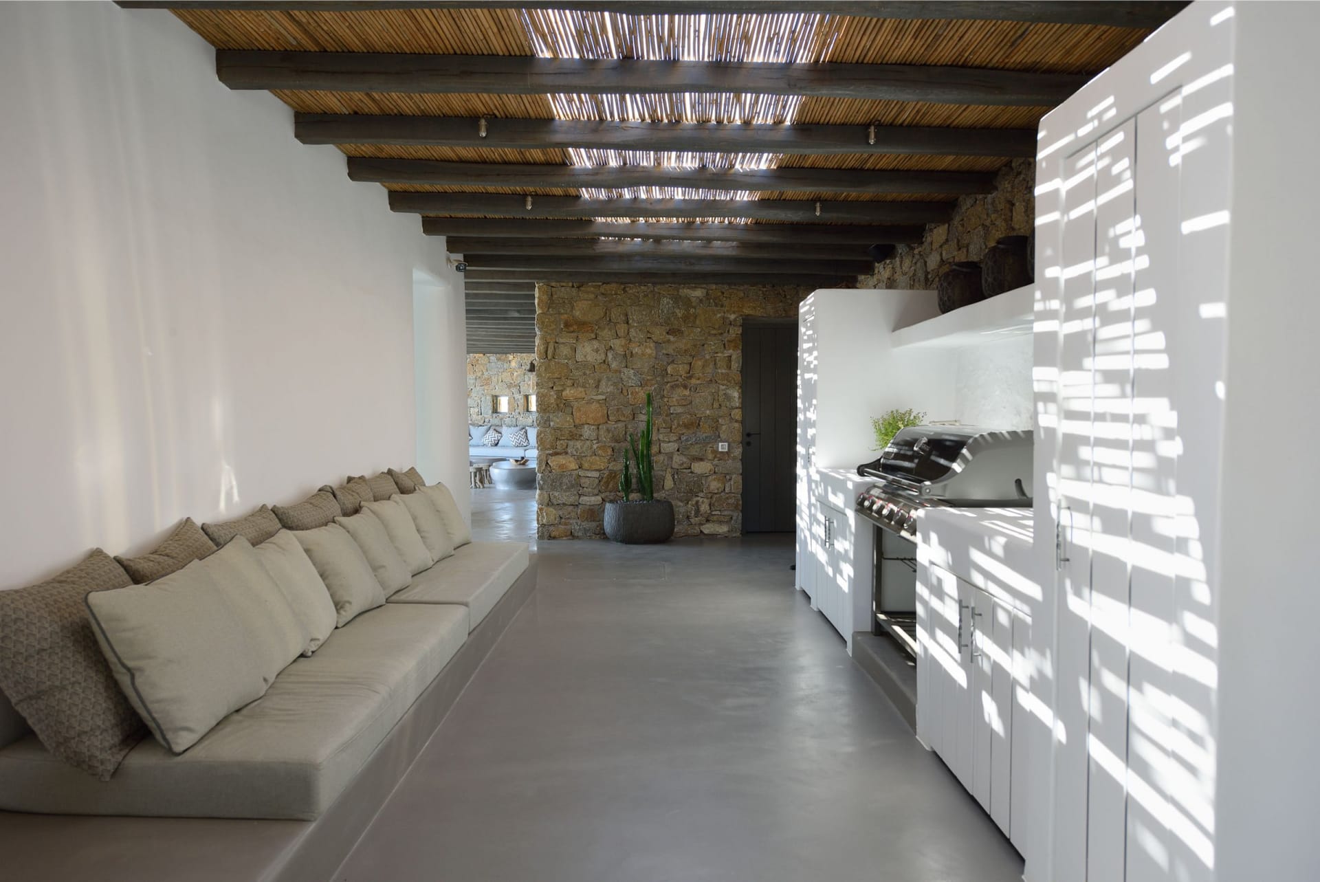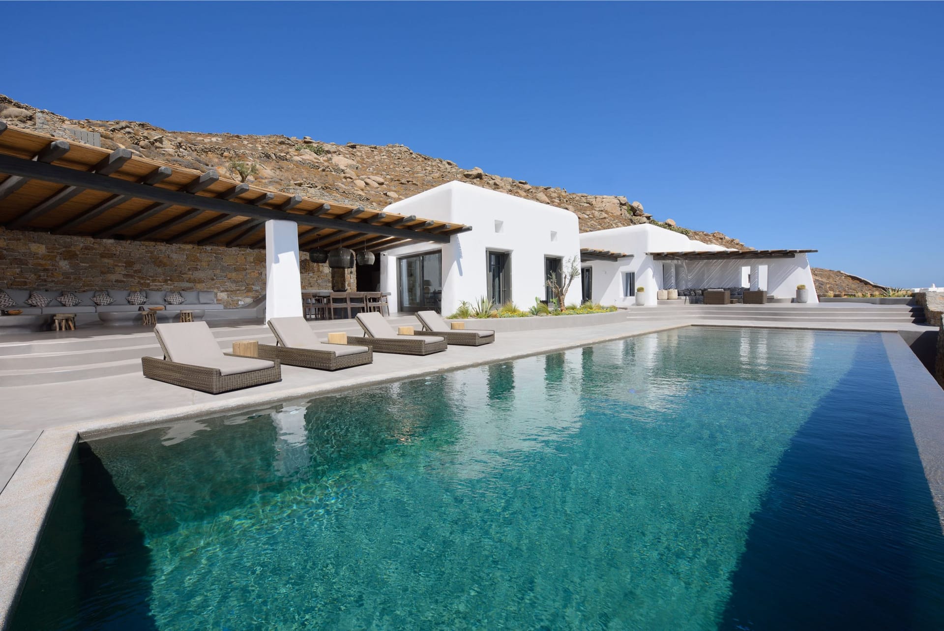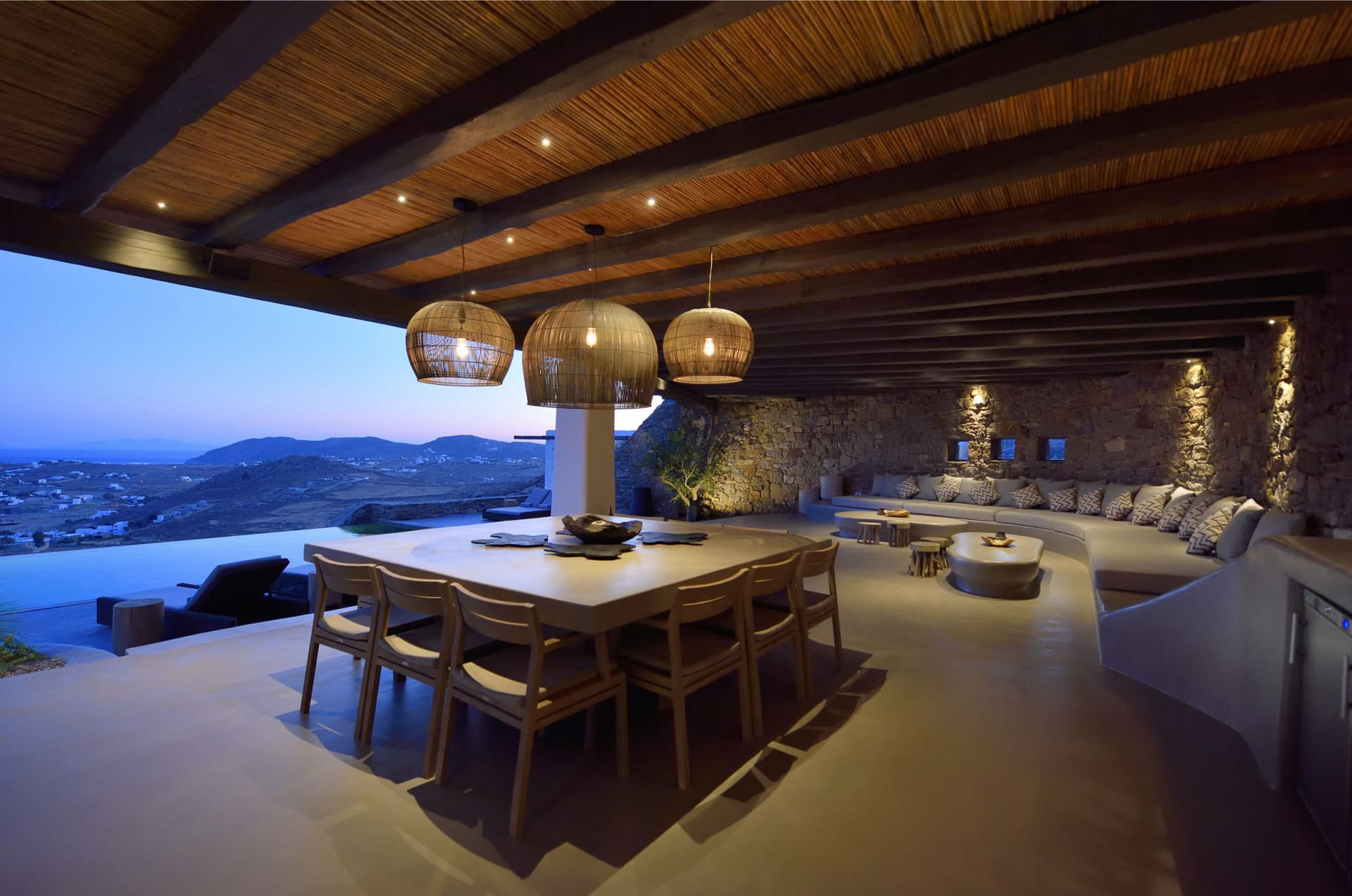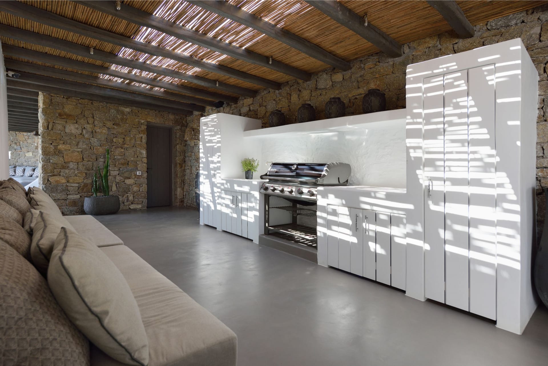 Situated to the right of the pool, is the villas pergola area, fitted with both a gas fired and traditional Greek barbeque options. The pergola stools and lounger are provided by Sempre, who are known for their handmade and authentic creations. The two outdoor dining areas contribute to a perfect entertaining space for family and friends to enjoy. The area is intended to ensure ultimate comfort by both day and night. The outdoor lighting by Ay Illuminati will enable you to continue your relaxation from dawn till dusk. Sit back and let the crimson sun sets, wash your troubles away.