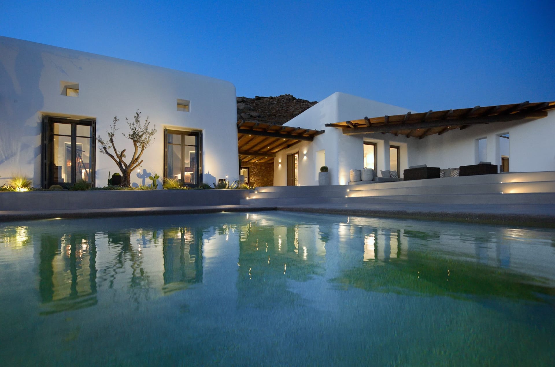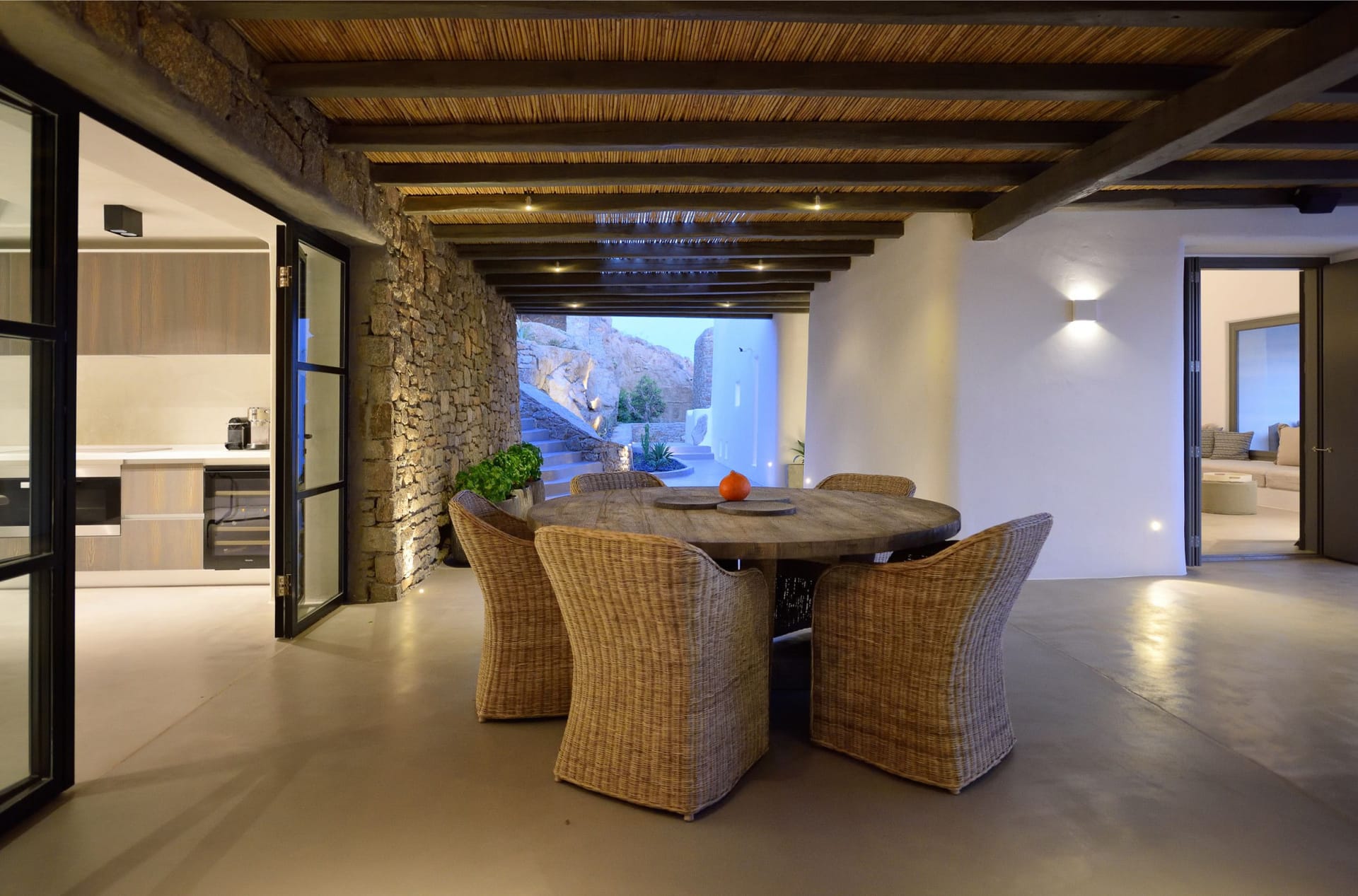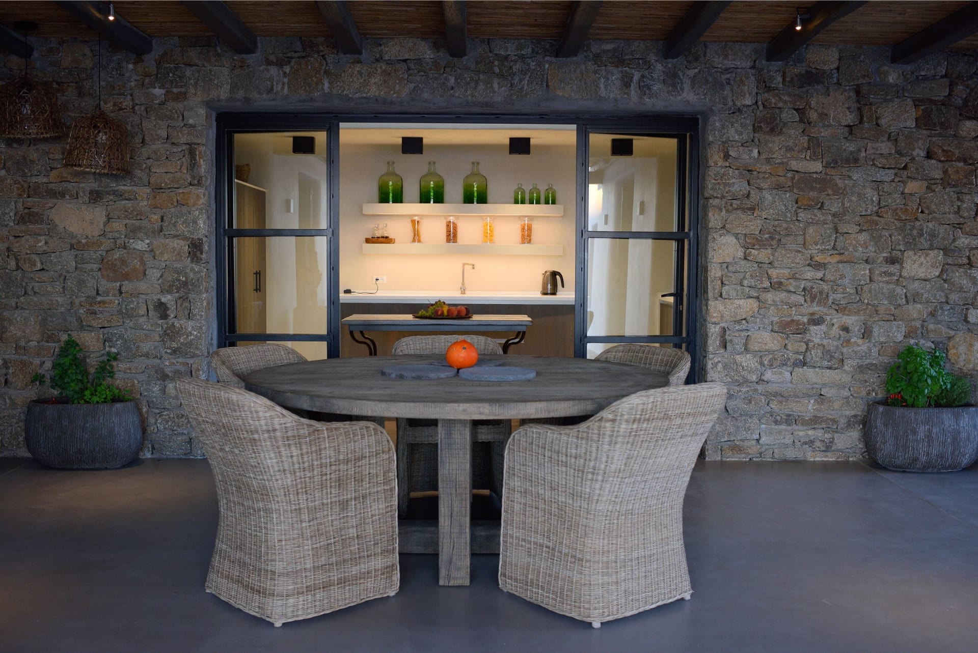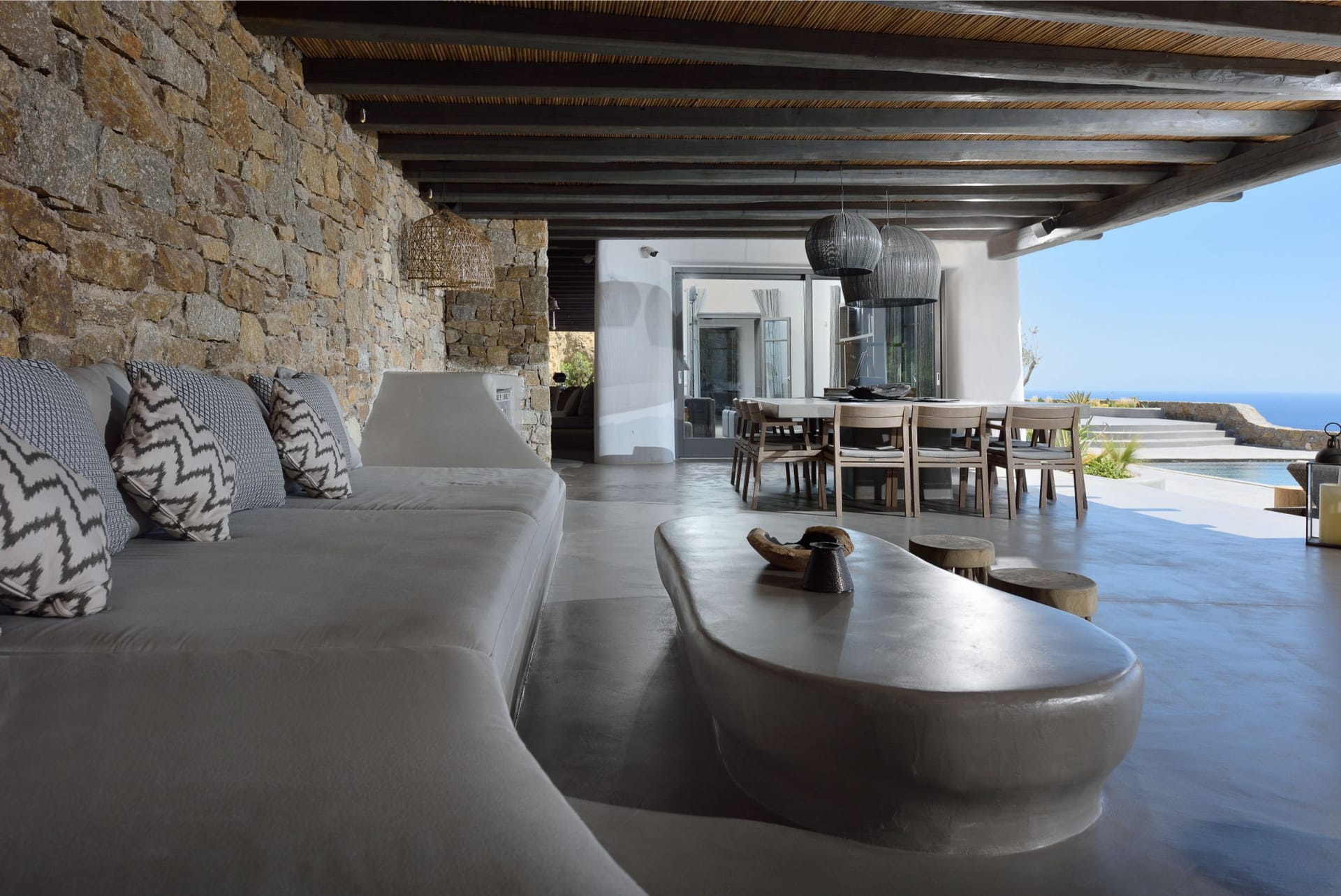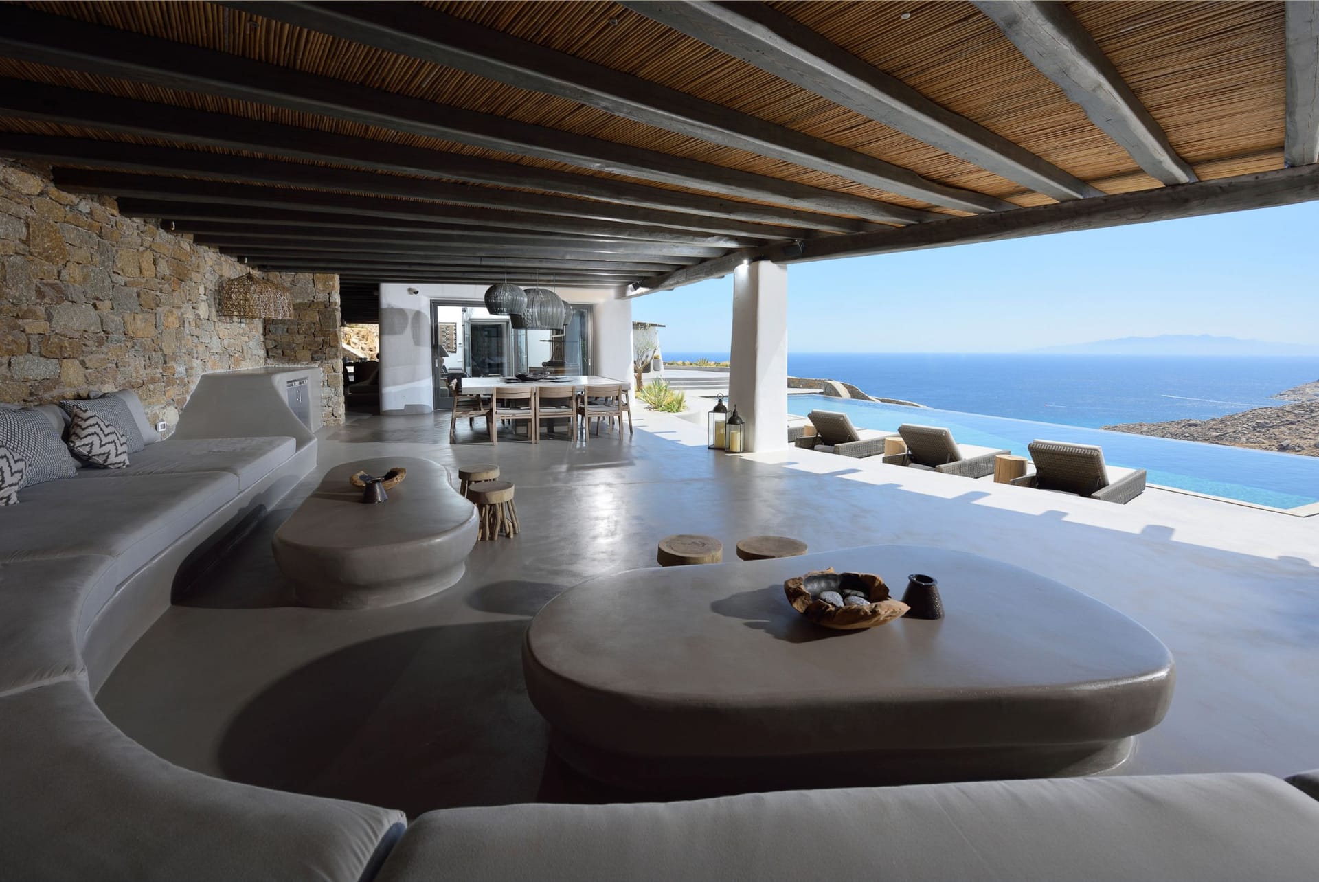 Situated to the right of the pool, is the villas pergola area, fitted with both a gas fired and traditional Greek barbeque options. The pergola stools and lounger are provided by Sempre, who are known for their handmade and authentic creations. The two outdoor dining areas contribute to a perfect entertaining space for family and friends to enjoy. The area is intended to ensure ultimate comfort by both day and night. The outdoor lighting by Ay Illuminati will enable you to continue your relaxation from dawn till dusk. Sit back and let the crimson sun sets, wash your troubles away.