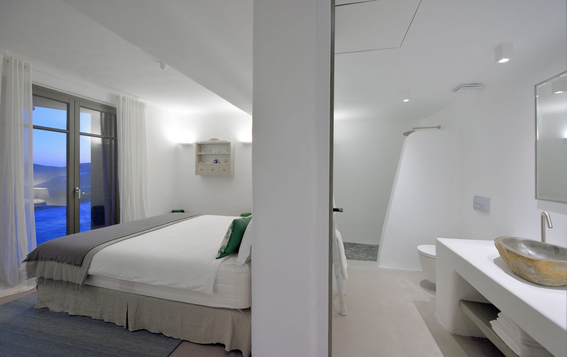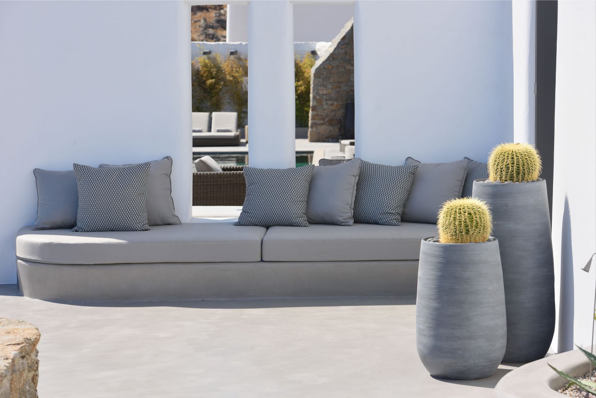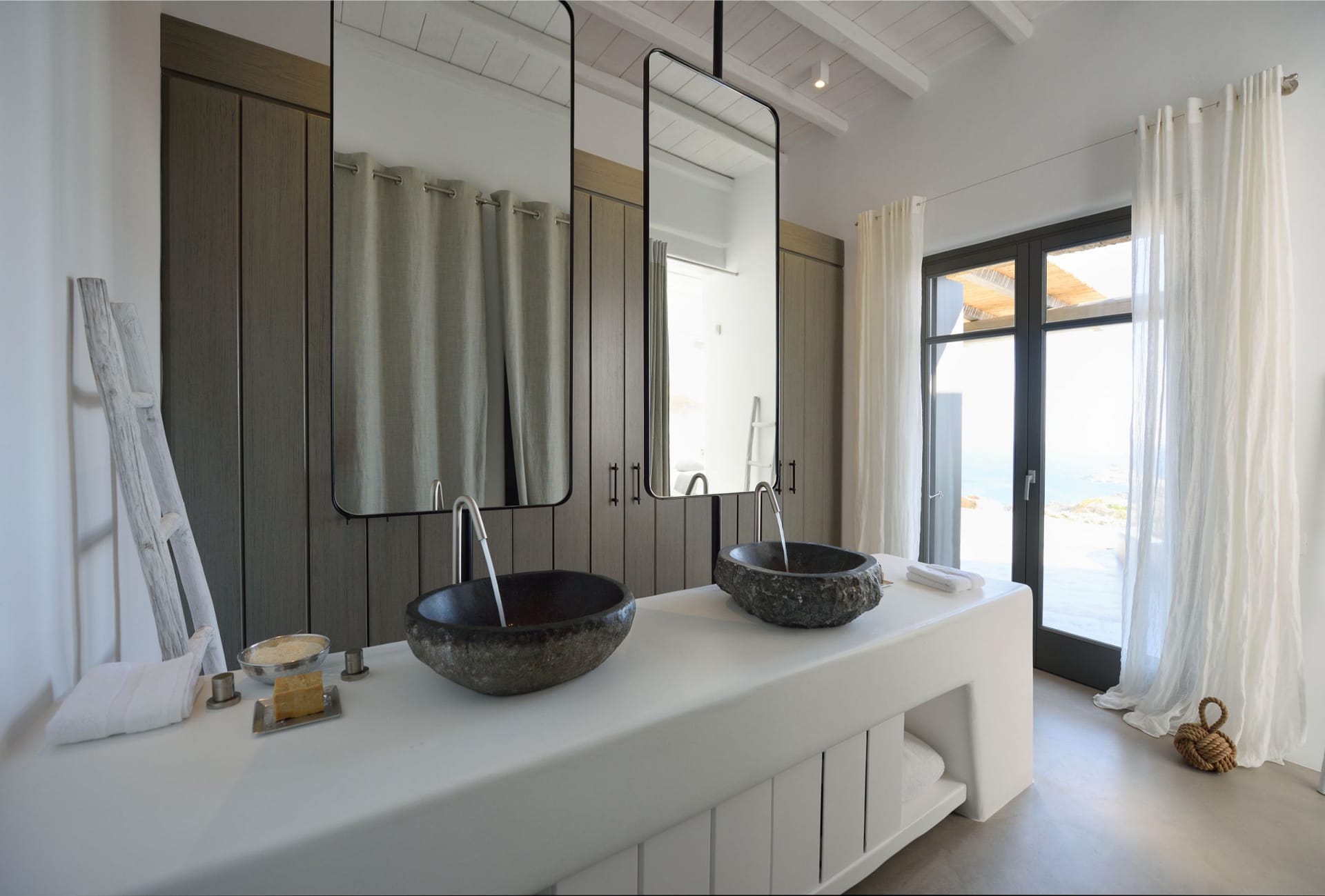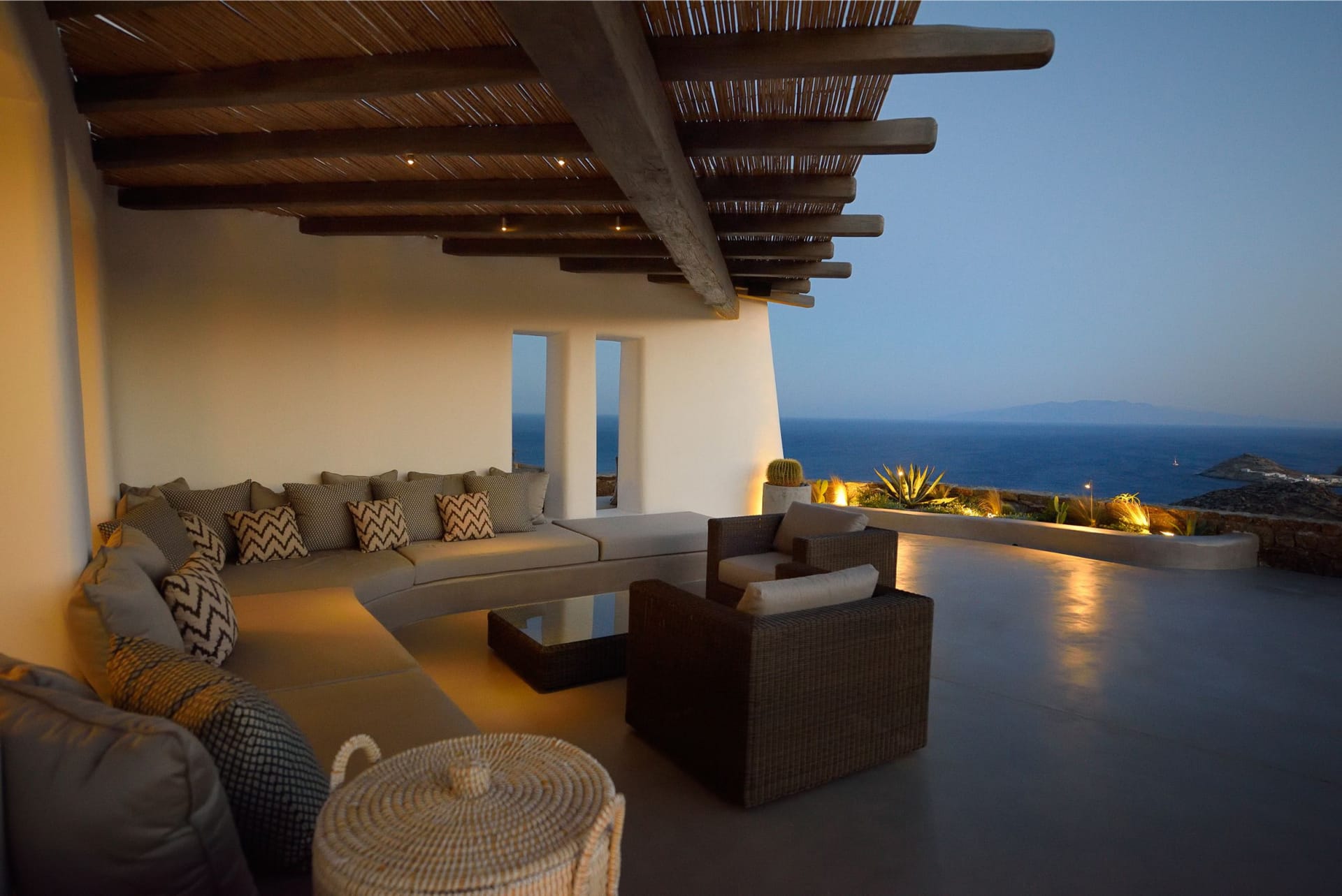 Situated to the right of the pool, is the villas pergola area, fitted with both a gas fired and traditional Greek barbeque options. The pergola stools and lounger are provided by Sempre, who are known for their handmade and authentic creations. The two outdoor dining areas contribute to a perfect entertaining space for family and friends to enjoy. The area is intended to ensure ultimate comfort by both day and night. The outdoor lighting by Ay Illuminati will enable you to continue your relaxation from dawn till dusk. Sit back and let the crimson sun sets, wash your troubles away.