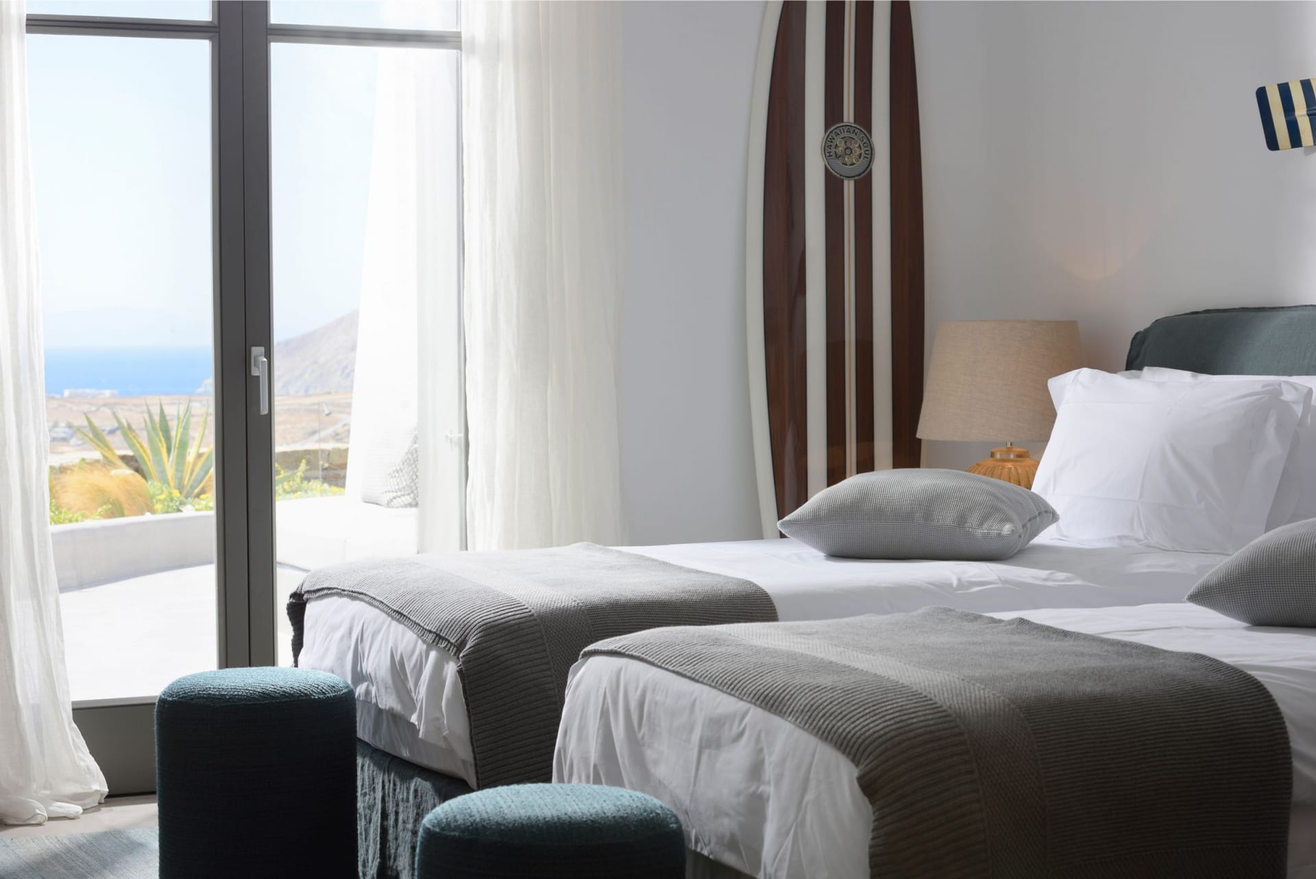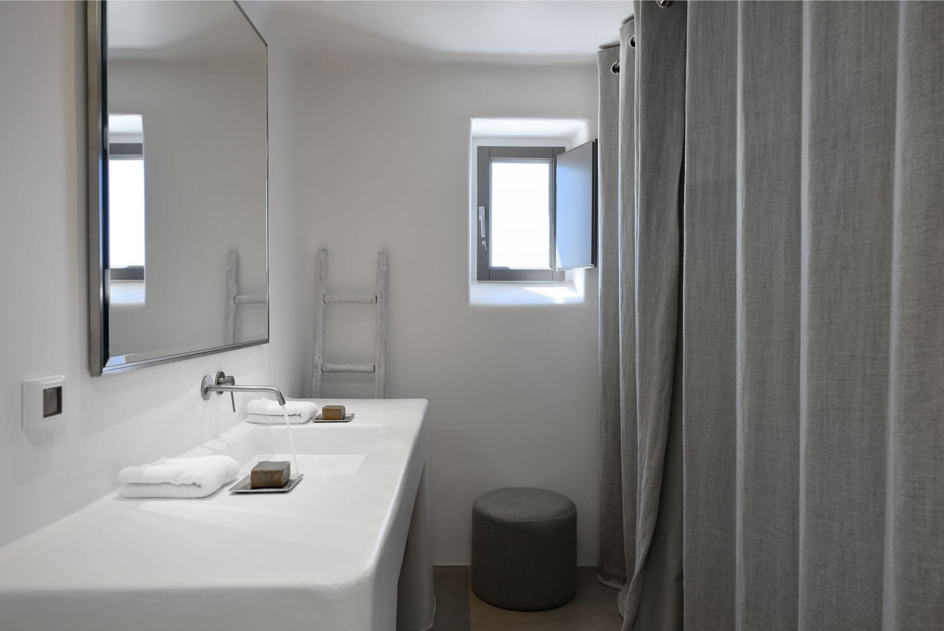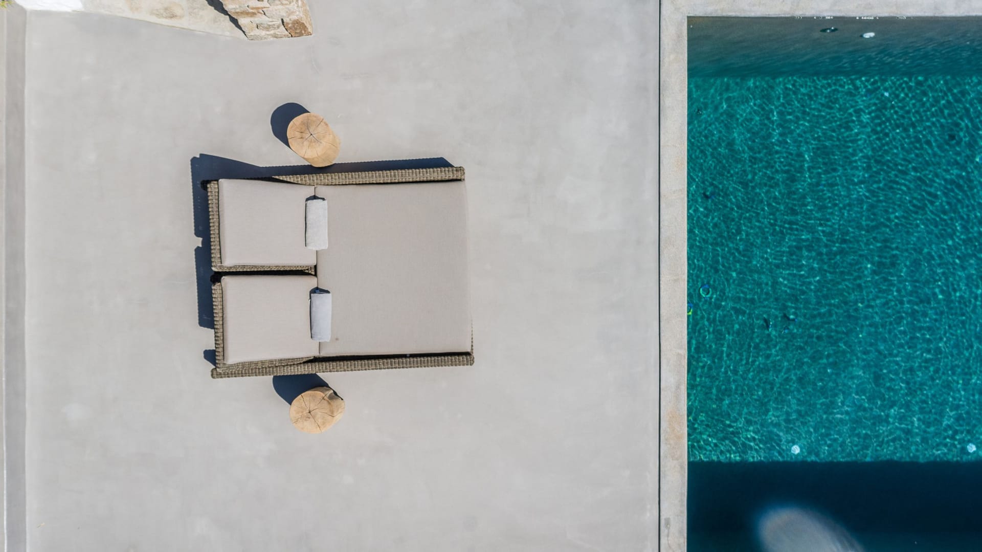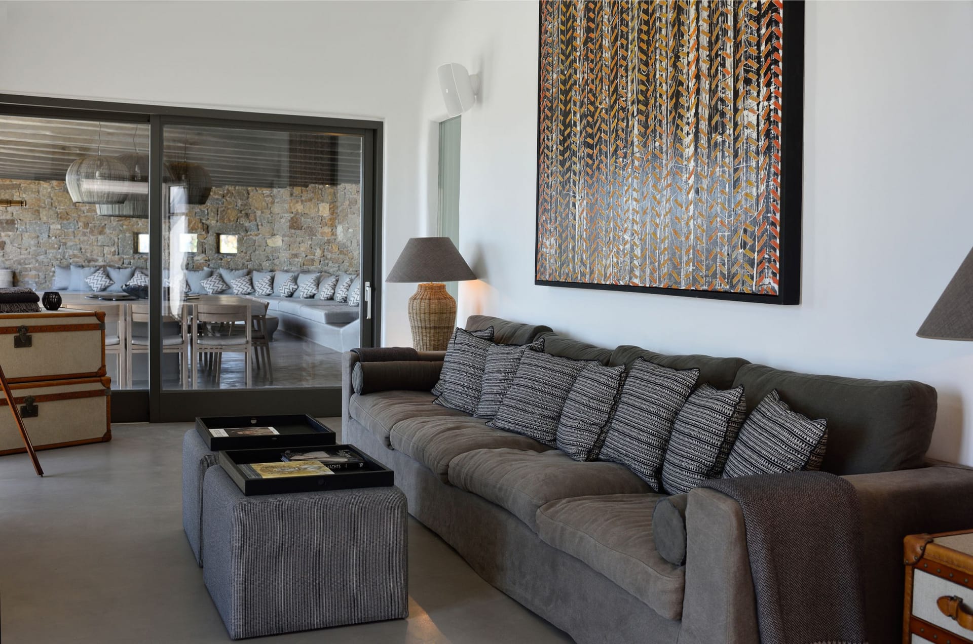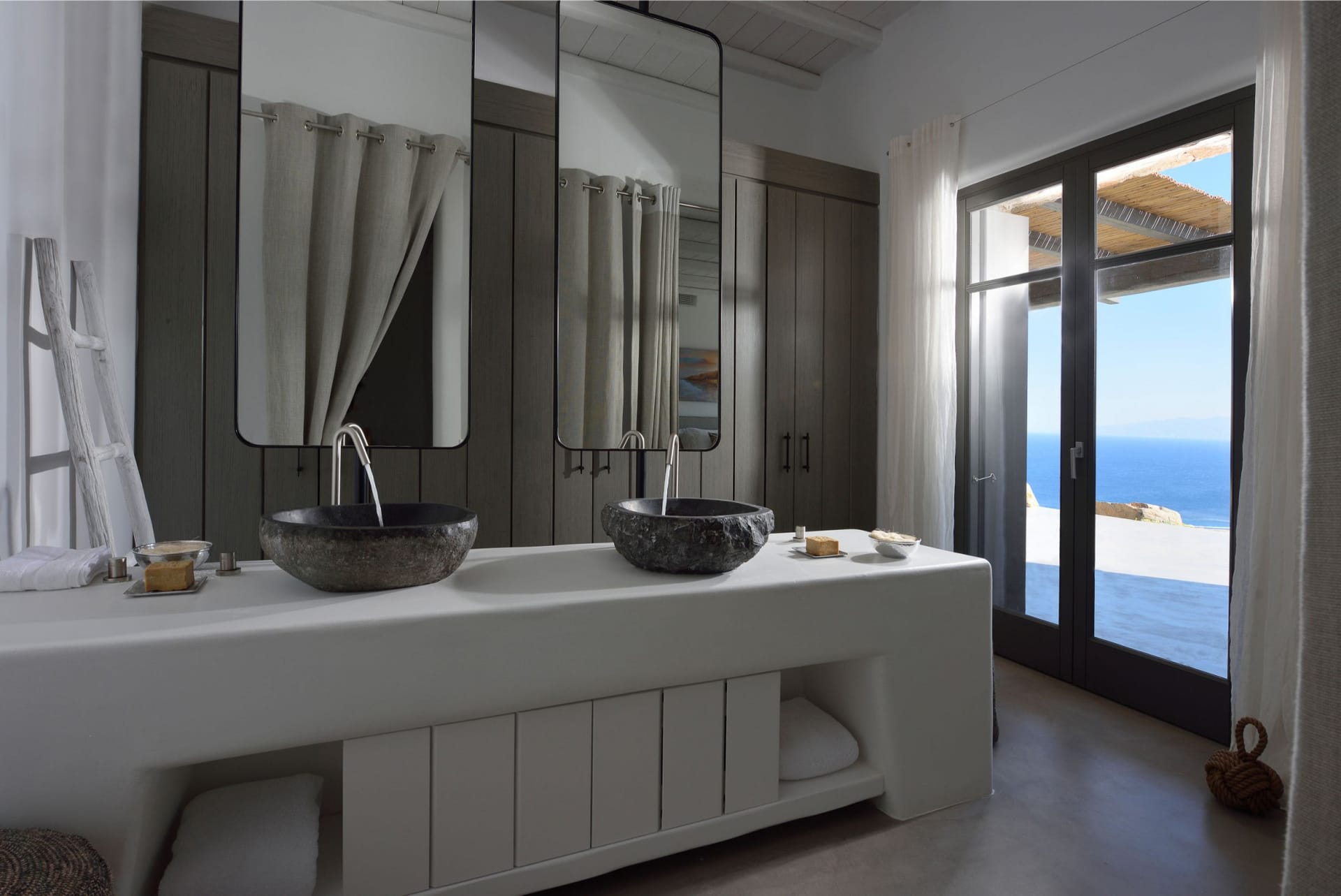 Situated to the right of the pool, is the villas pergola area, fitted with both a gas fired and traditional Greek barbeque options. The pergola stools and lounger are provided by Sempre, who are known for their handmade and authentic creations. The two outdoor dining areas contribute to a perfect entertaining space for family and friends to enjoy. The area is intended to ensure ultimate comfort by both day and night. The outdoor lighting by Ay Illuminati will enable you to continue your relaxation from dawn till dusk. Sit back and let the crimson sun sets, wash your troubles away.