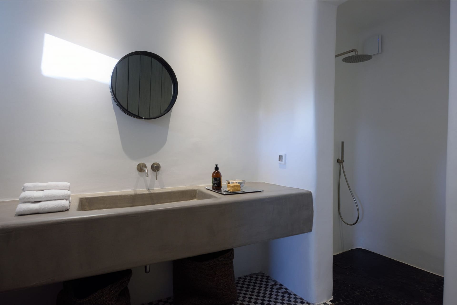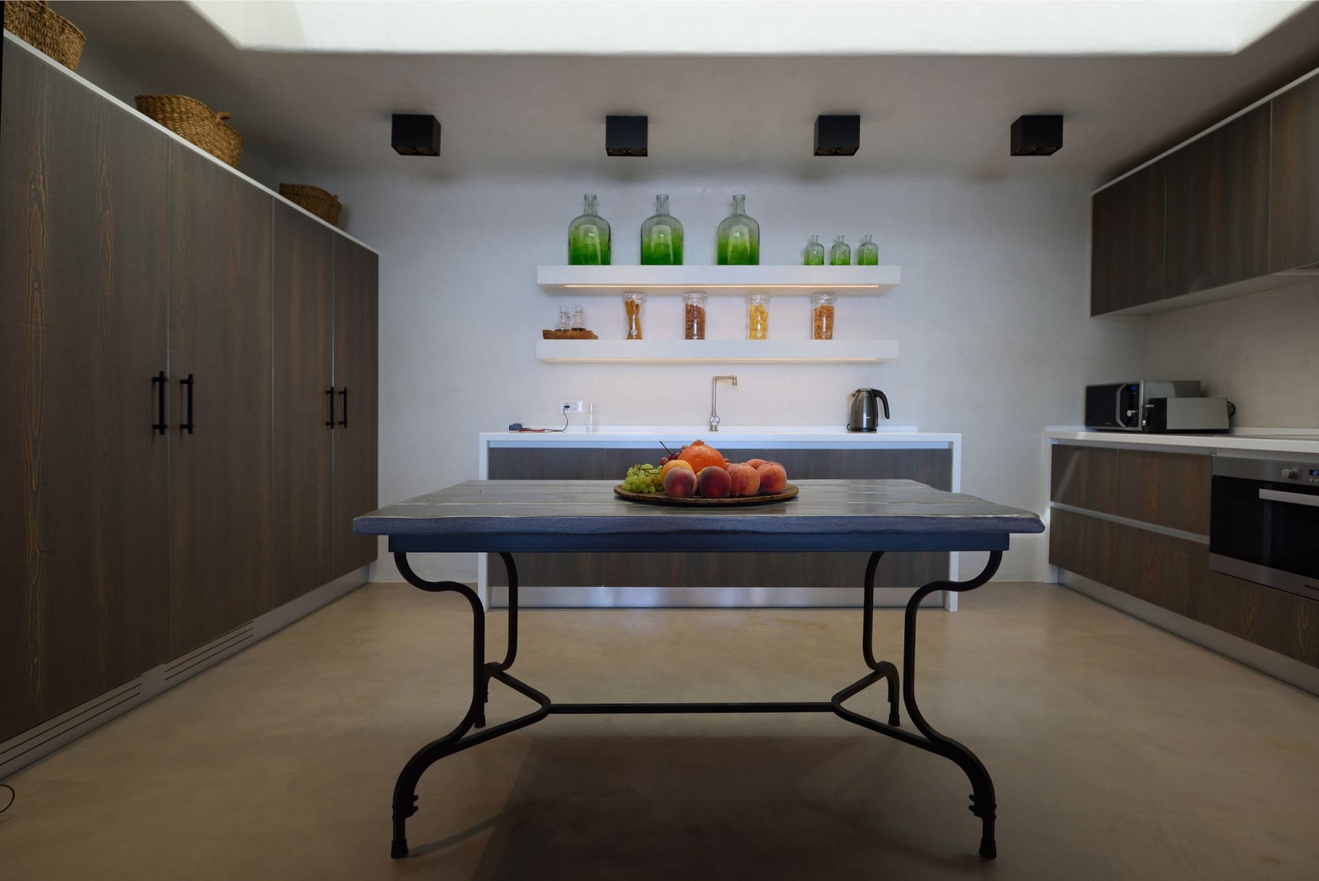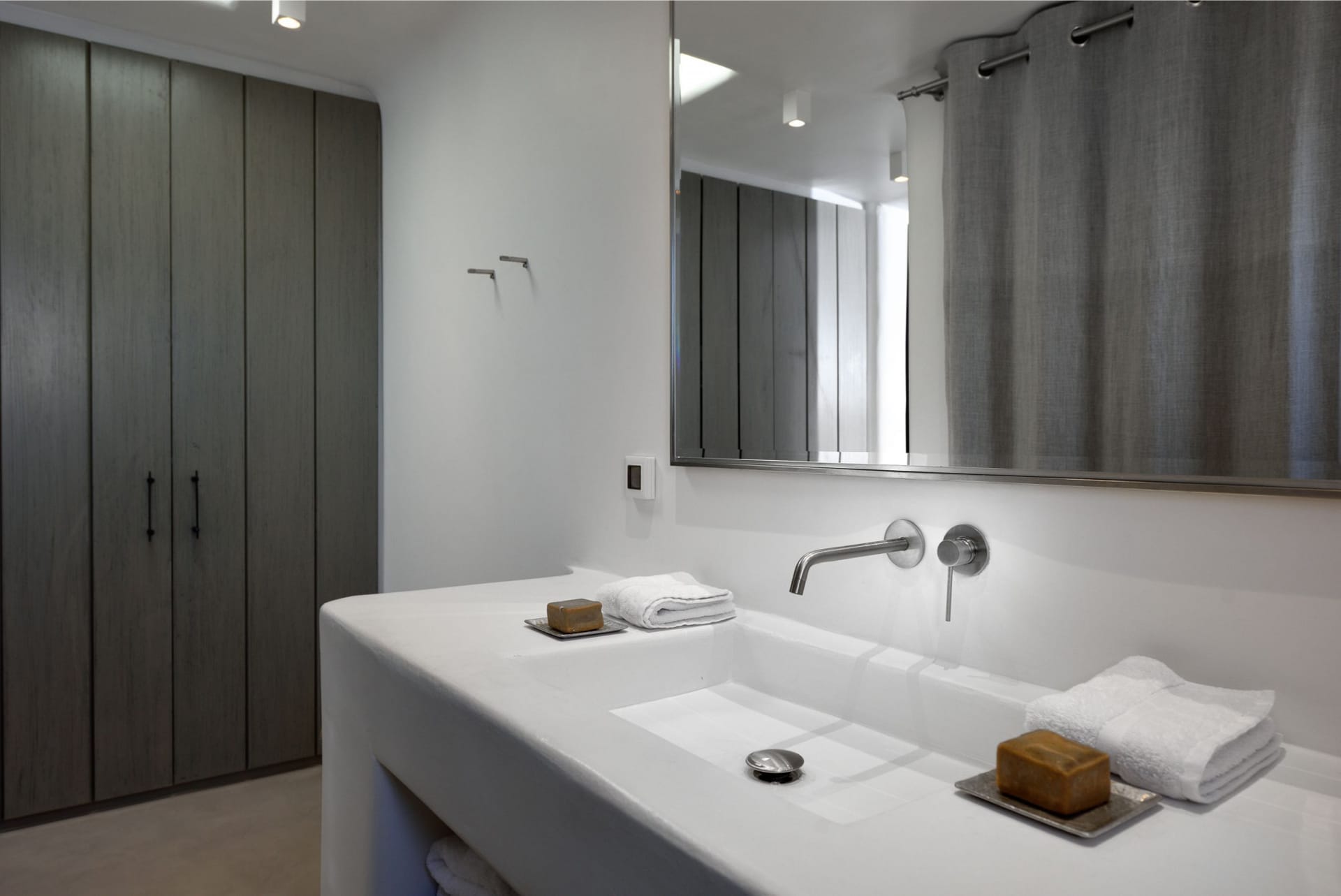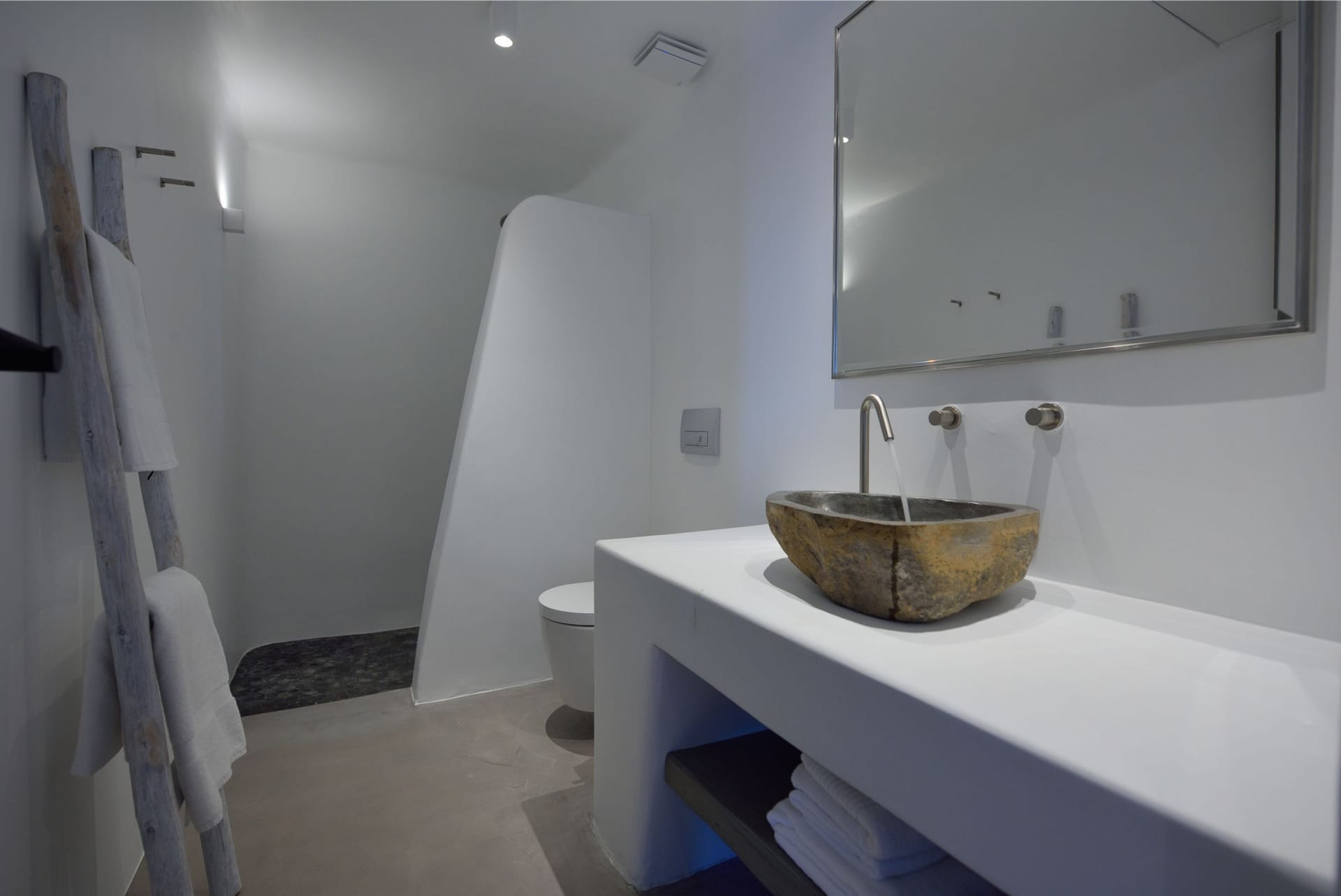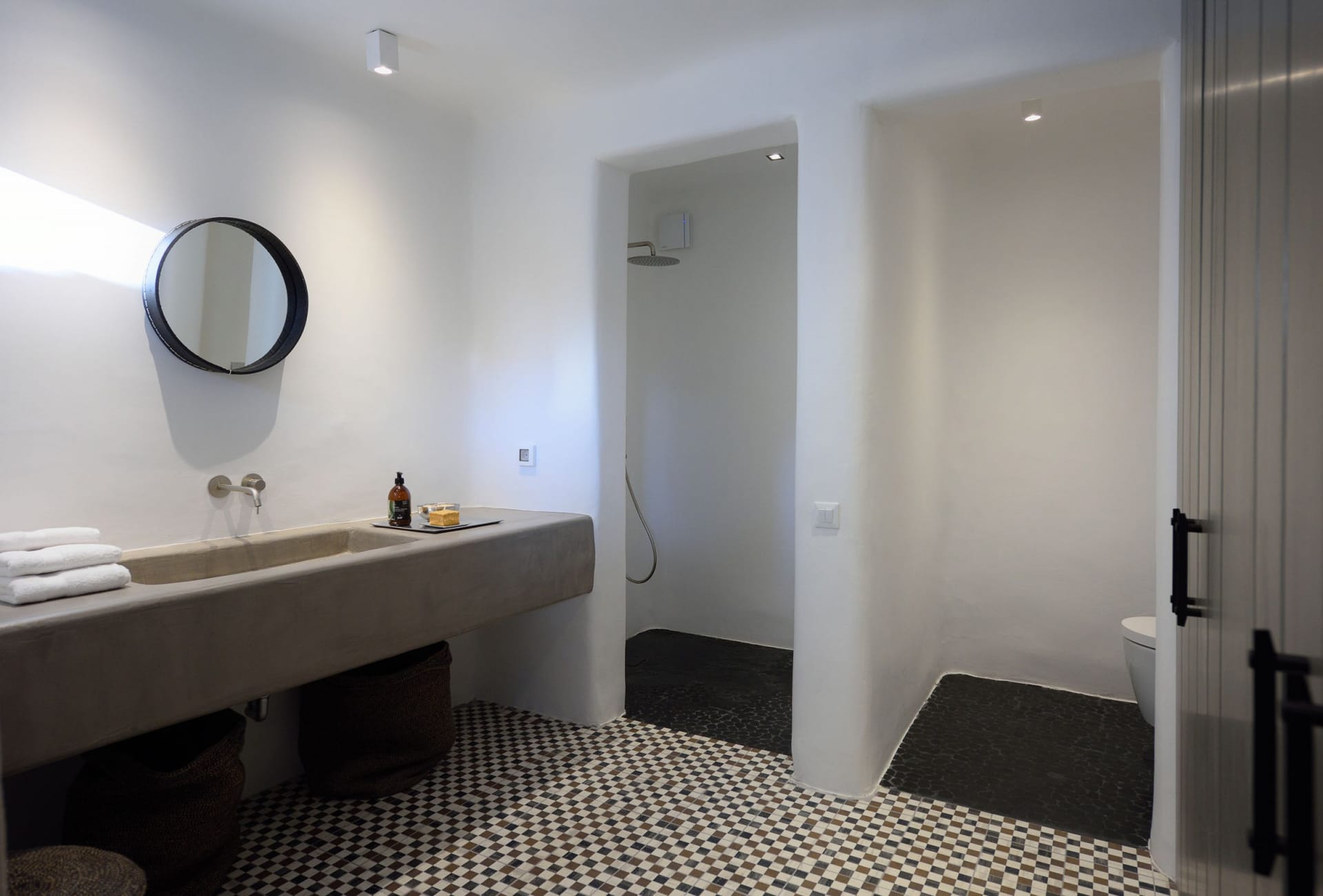 Situated to the right of the pool, is the villas pergola area, fitted with both a gas fired and traditional Greek barbeque options. The pergola stools and lounger are provided by Sempre, who are known for their handmade and authentic creations. The two outdoor dining areas contribute to a perfect entertaining space for family and friends to enjoy. The area is intended to ensure ultimate comfort by both day and night. The outdoor lighting by Ay Illuminati will enable you to continue your relaxation from dawn till dusk. Sit back and let the crimson sun sets, wash your troubles away.