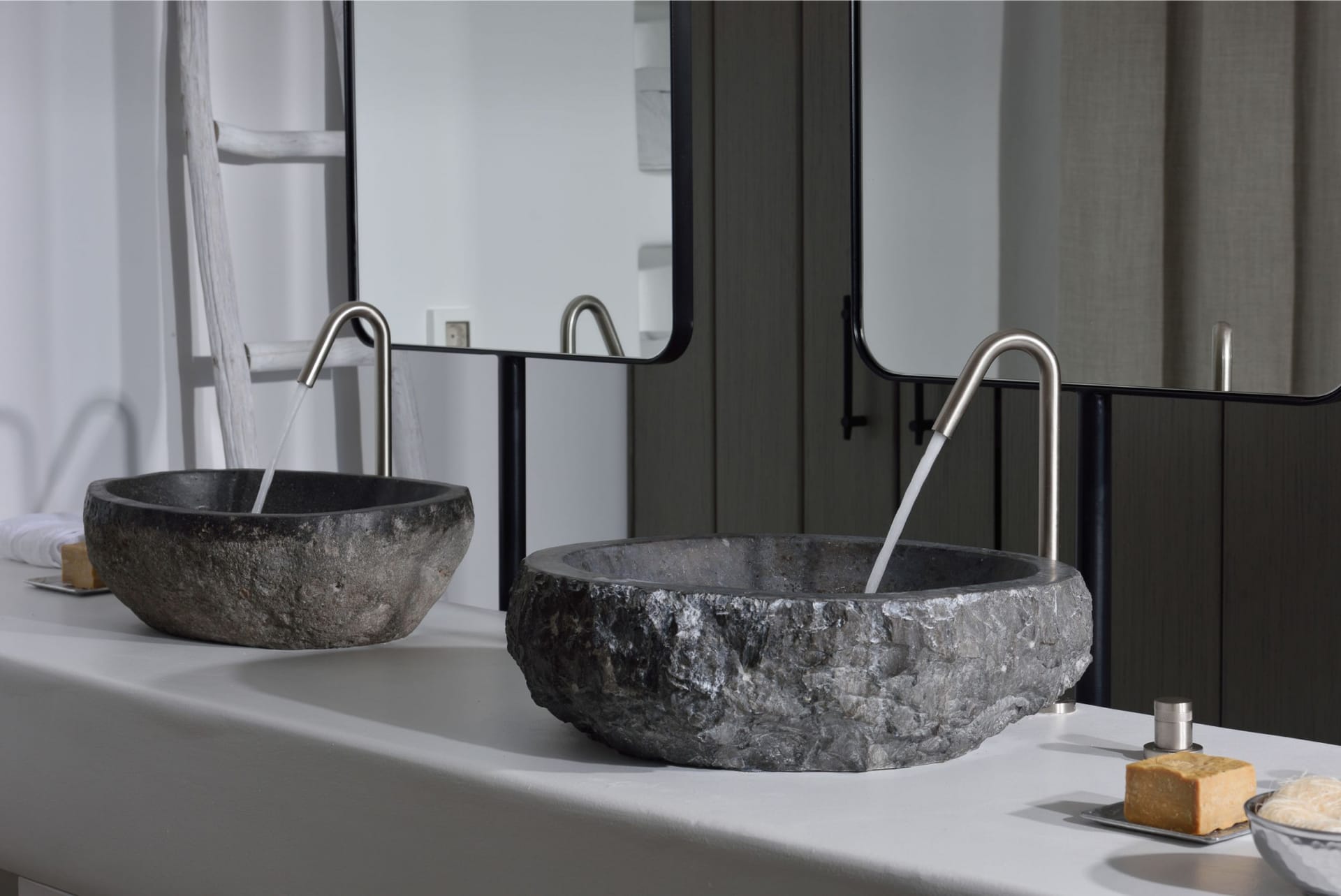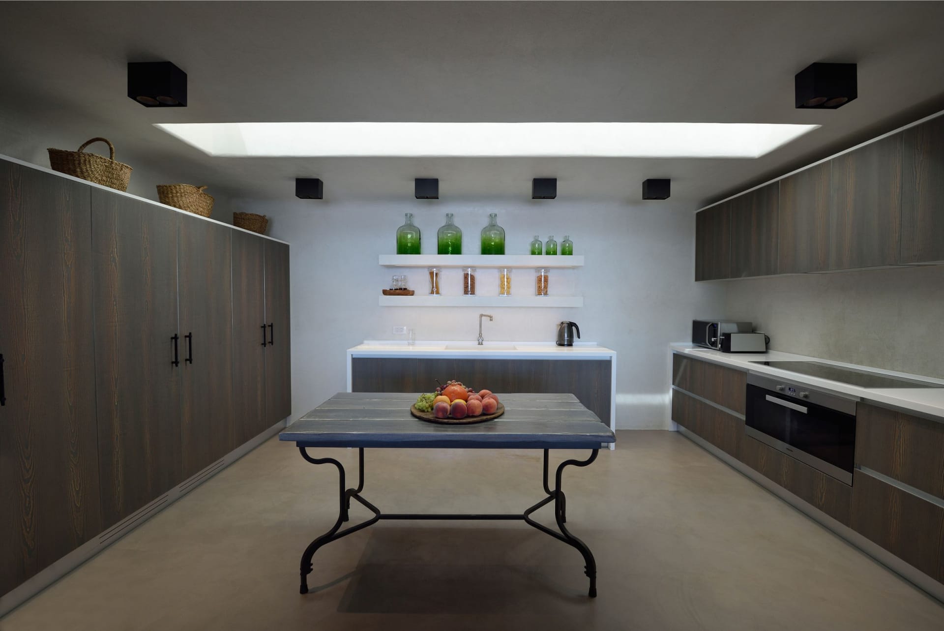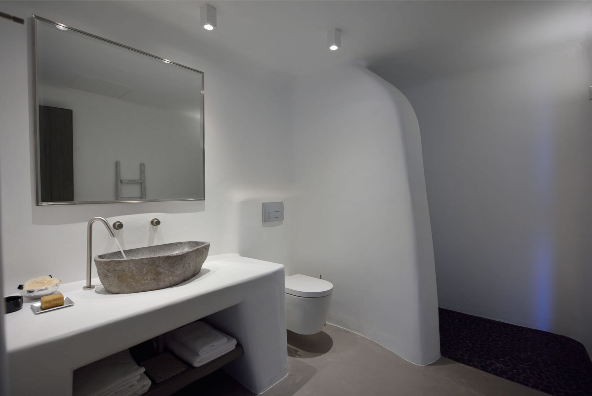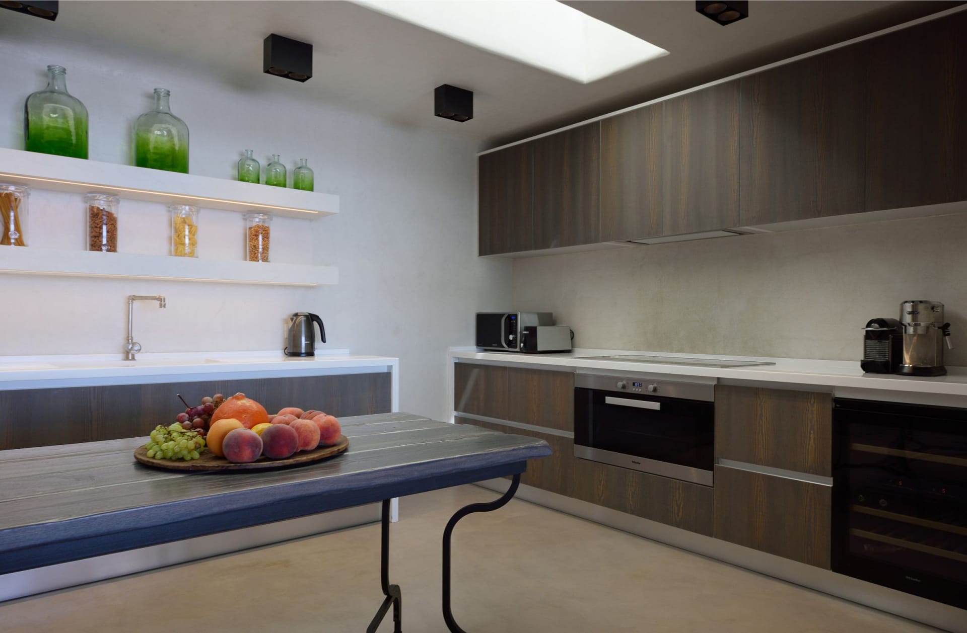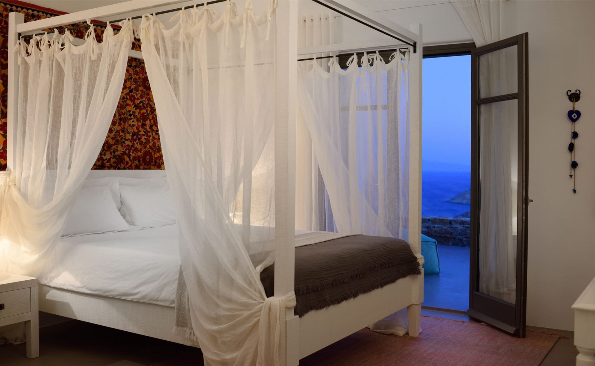 Situated to the right of the pool, is the villas pergola area, fitted with both a gas fired and traditional Greek barbeque options. The pergola stools and lounger are provided by Sempre, who are known for their handmade and authentic creations. The two outdoor dining areas contribute to a perfect entertaining space for family and friends to enjoy. The area is intended to ensure ultimate comfort by both day and night. The outdoor lighting by Ay Illuminati will enable you to continue your relaxation from dawn till dusk. Sit back and let the crimson sun sets, wash your troubles away.