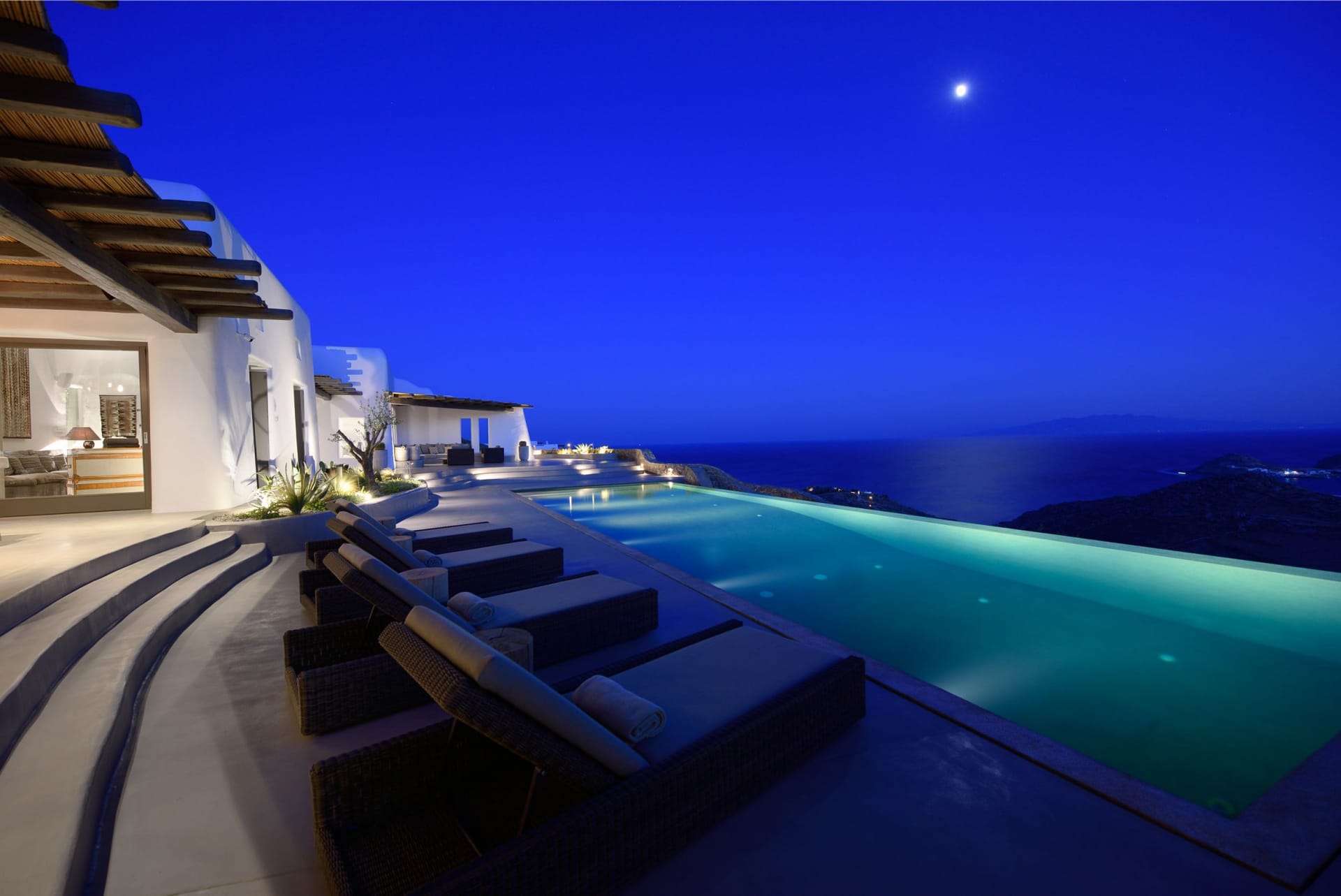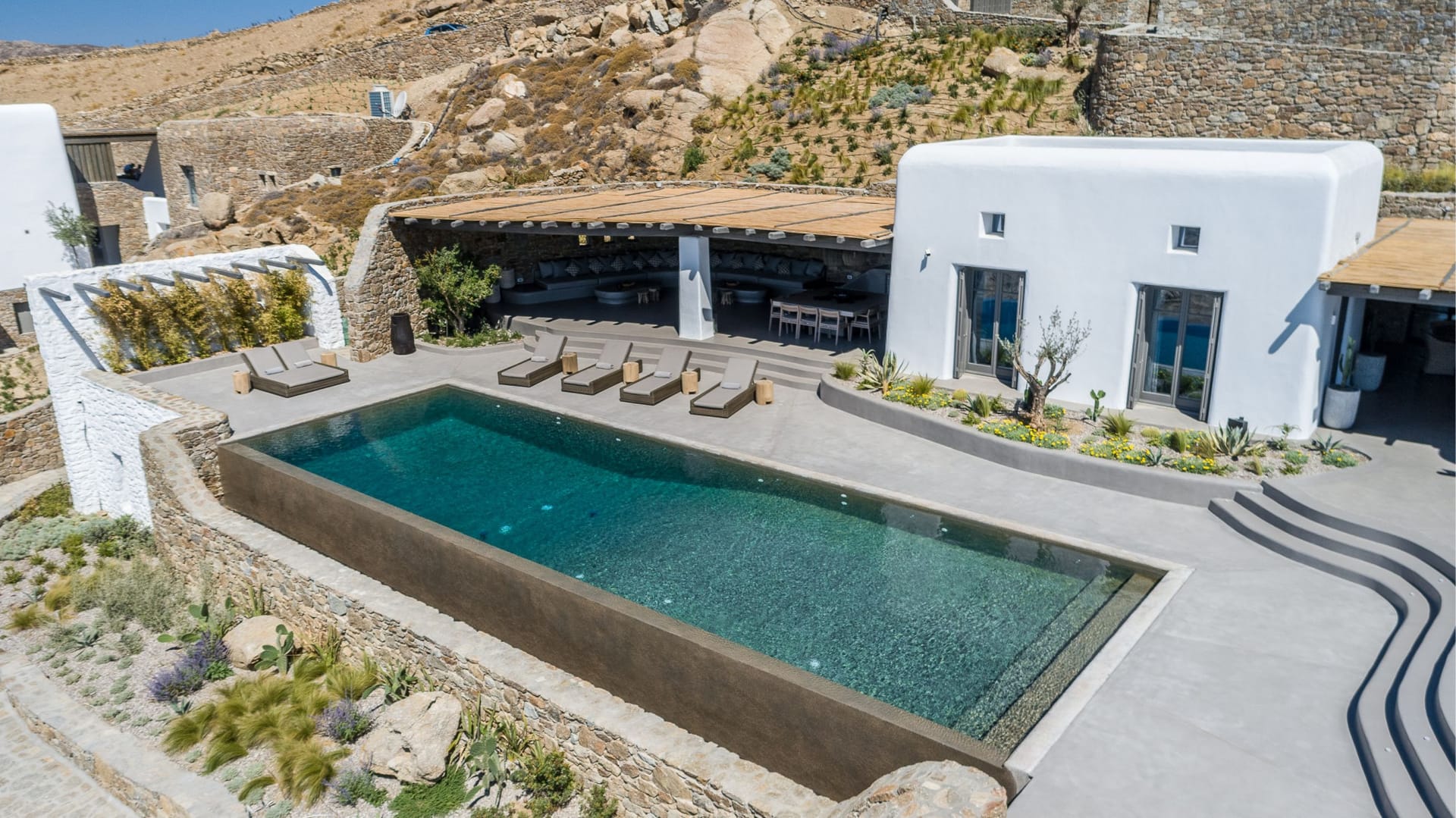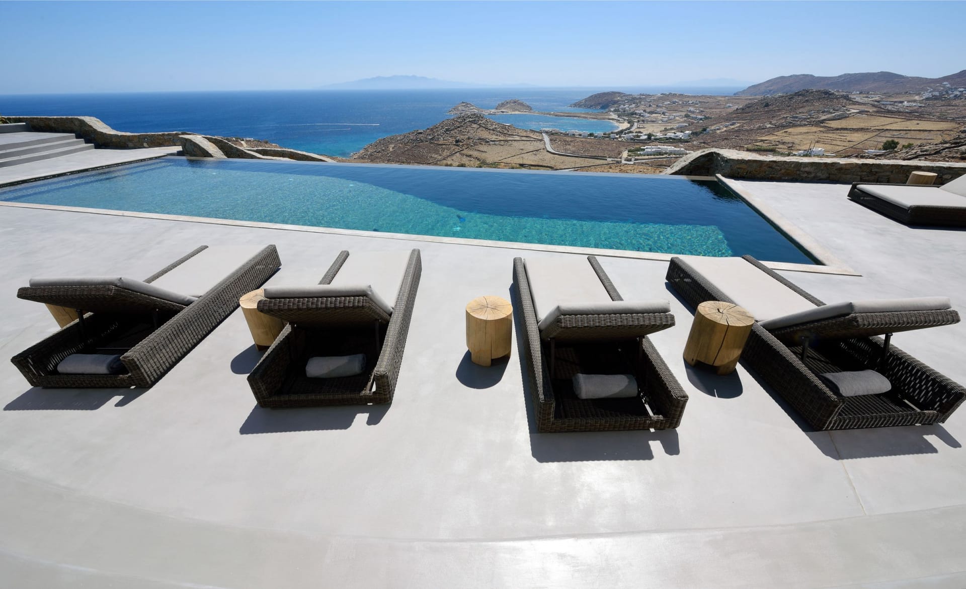 Indulge in the picturesque panoramic Aegean views, allowed by this villa’s location perched on a hill. The outdoor area will be your favourite area to unwind and relax your senses. The ample space combined with the exteriors spectacular design will redefine your idea of luxury. The solar-panel heated infinity pool has a boundless feel to it and will serve as the perfect place to take in your surroundings and let the beauty of the island sweep you away.