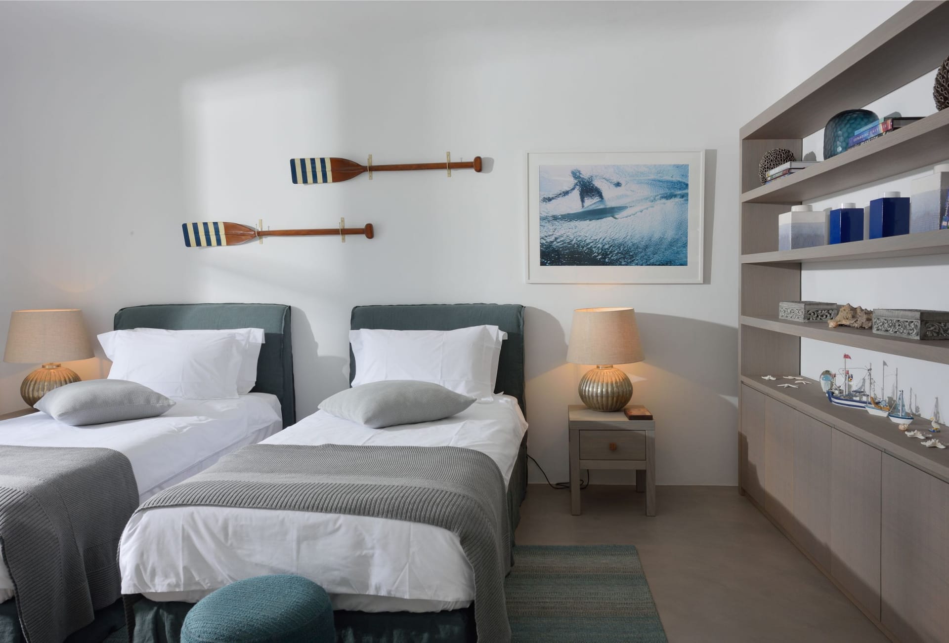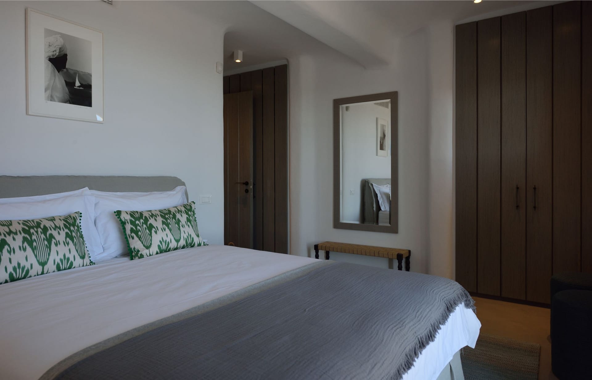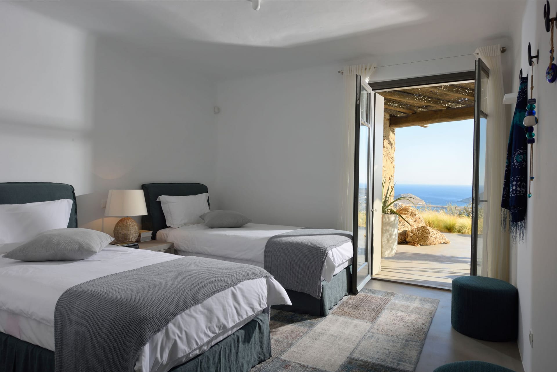 The stairs will direct you to the ground floor where there is a staff bedroom and three further guest bedrooms, where expansive Aegean views can be enjoyed. This floor also has its own TV area for the moments when you simply need some down time. The pathway from the garden on the ground takes you to the gym and a further en-suite guest room constructed with a unique Moroccan feel. Let the villas amenities indulge you. Fitted with every amenity that you could possibly hope for, for an unforgettable stay.