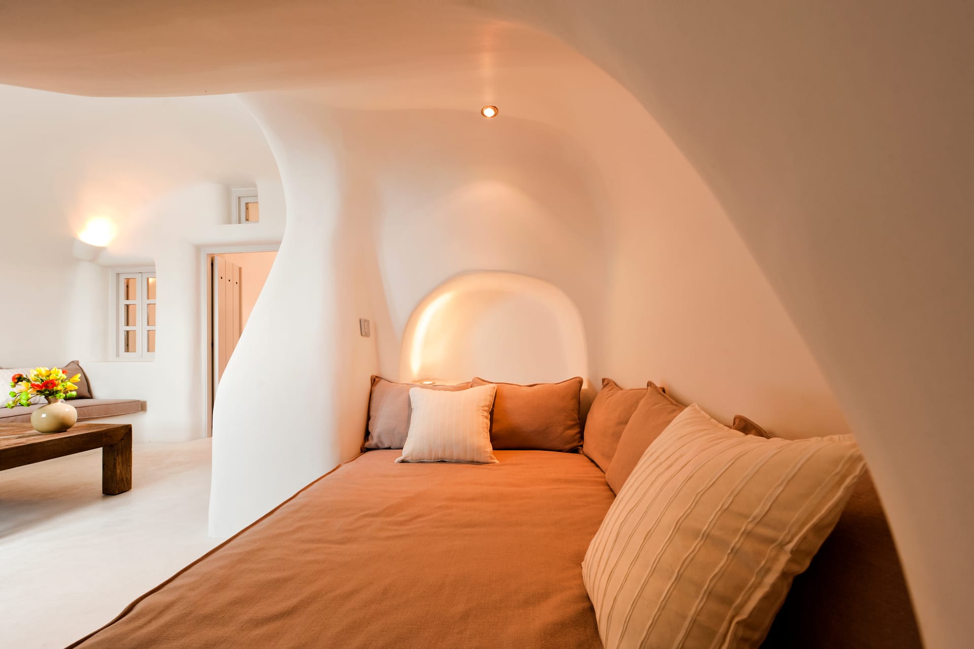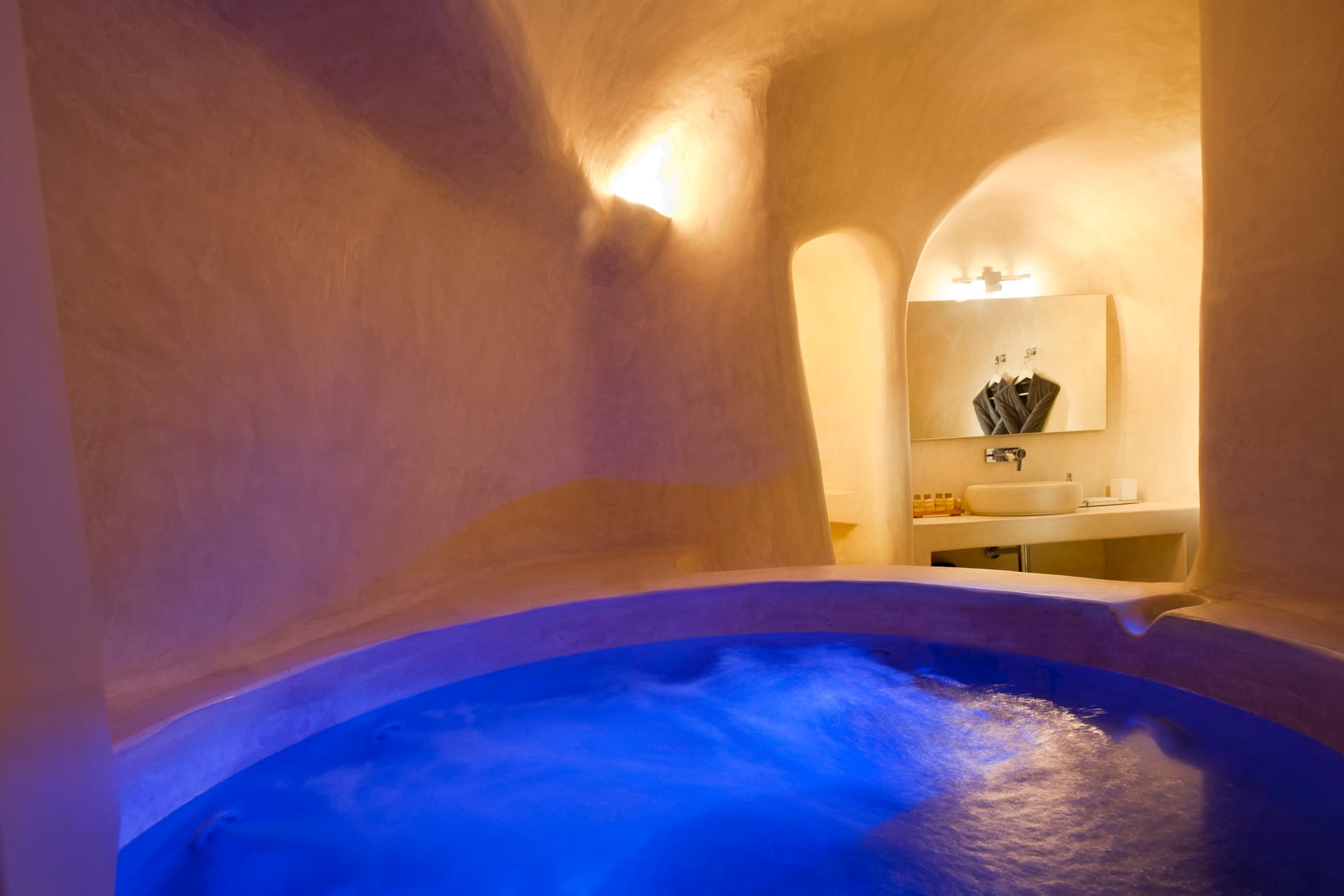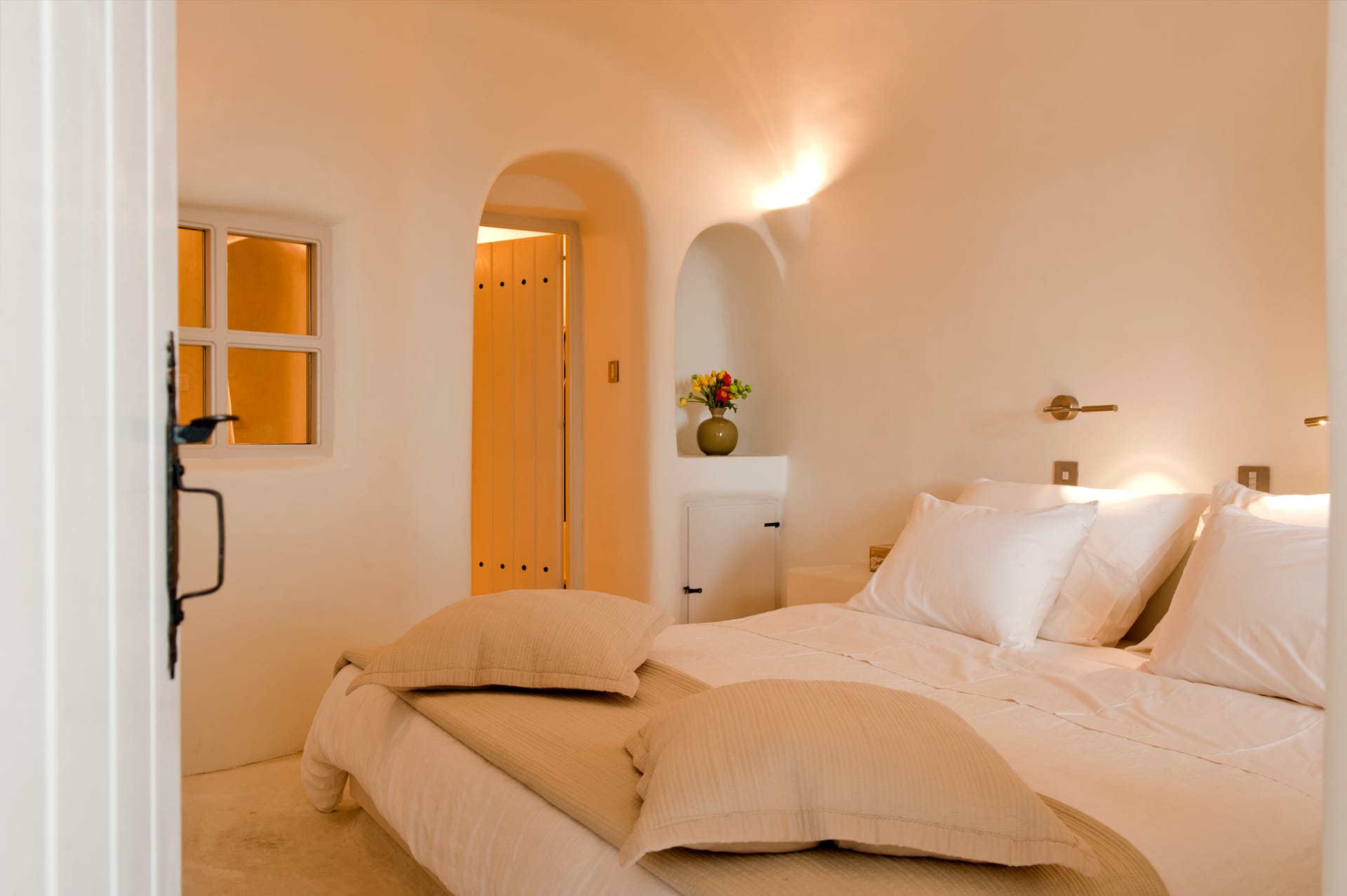 It is located on the upper floor with a large, private terrace and a private heated Jacuzzi. Perfectly spotted, with a mesmerizing view over the caldera, the blue of the Aegean, and the breathtakingly beautiful Santorini sunset, the Suite elevates your stay to a unique experience.