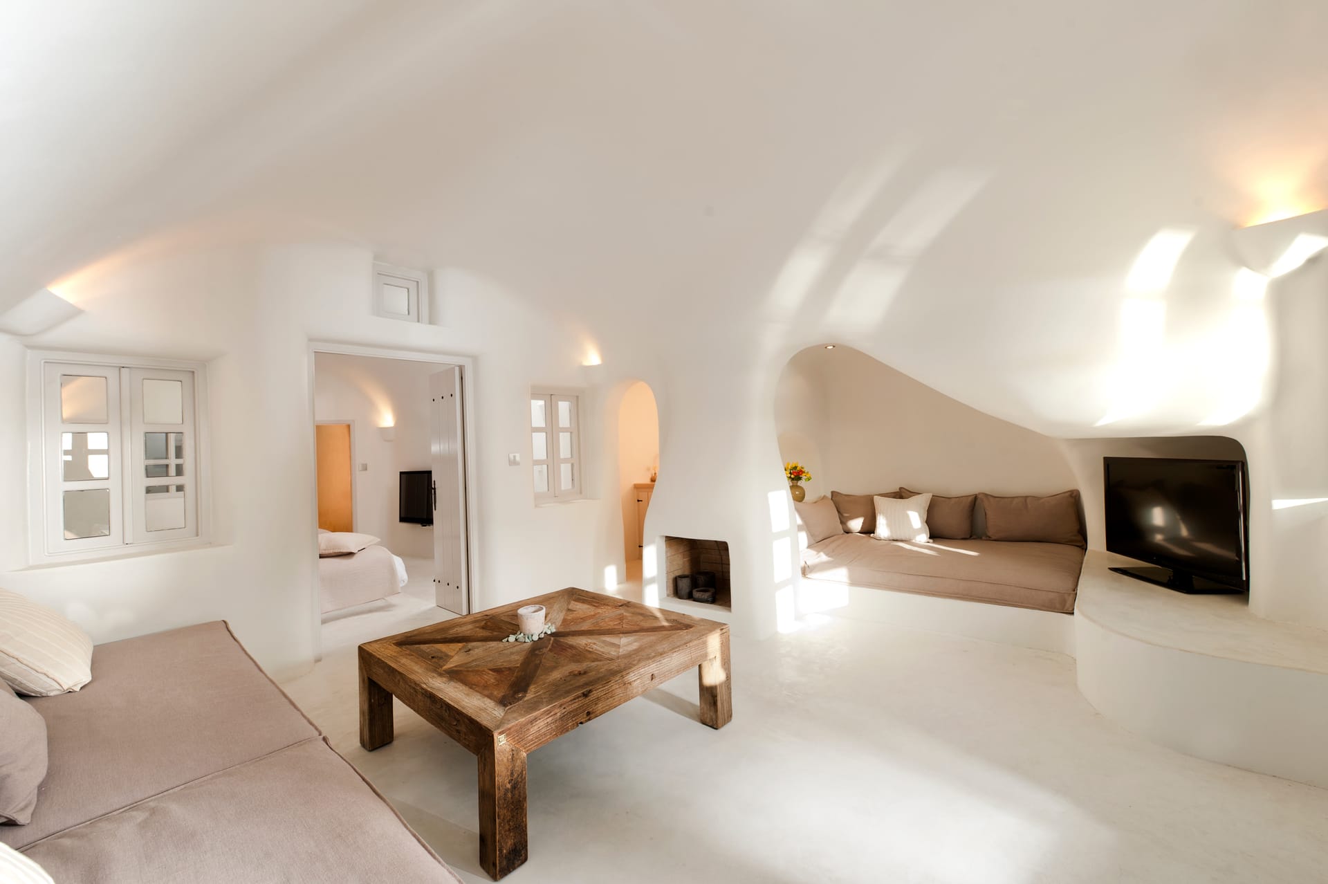 Each accommodation has its own private or semi-private terrace or balcony. This means that the space in front of each suite is for you alone to use and is not shared. It does not mean that other people can't see you. As explained our top priority is to preserve the natural beauty of Santorini